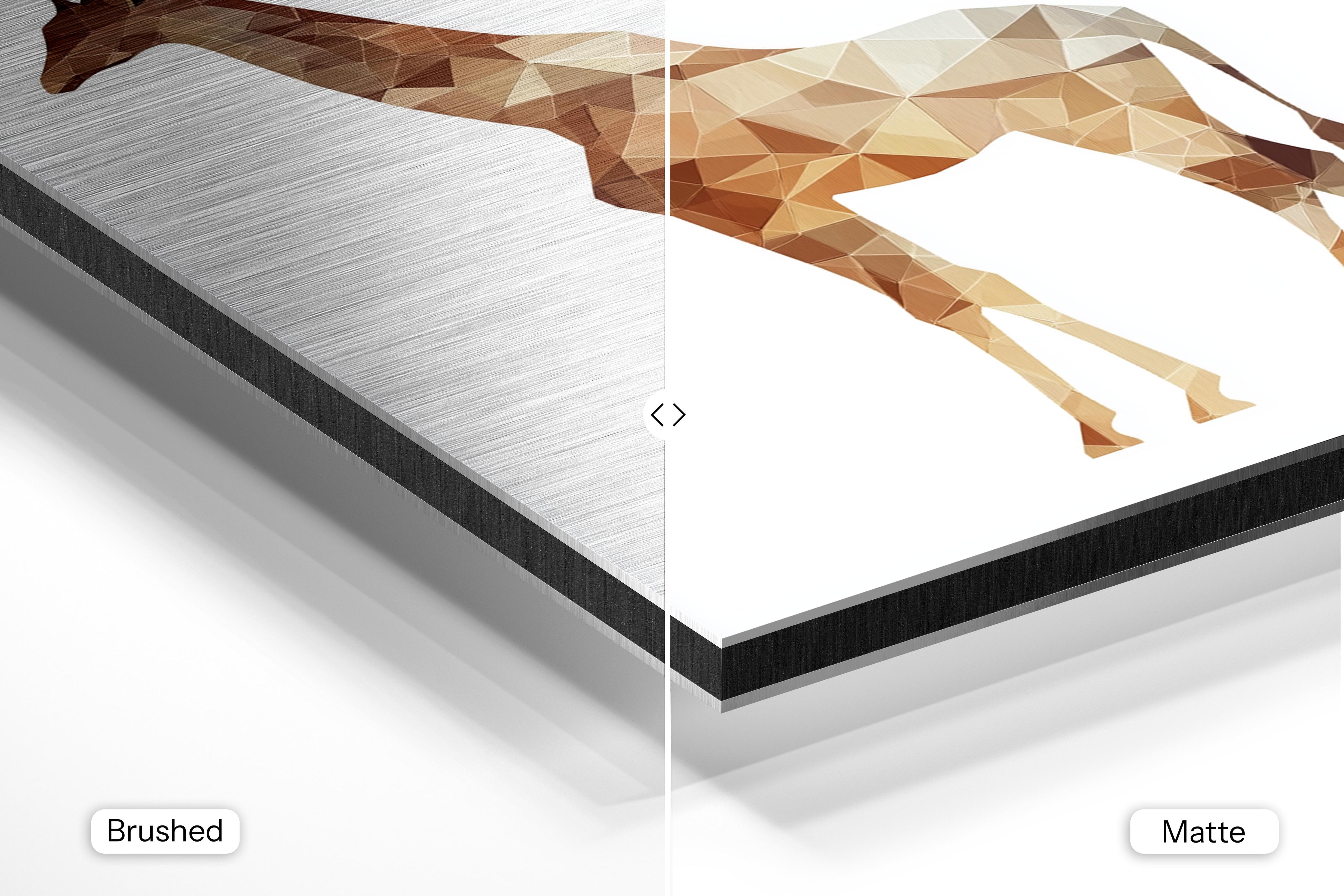 - Brushed Aluminum, on the other hand, features a raw metallic texture with visible brush strokes. Whites and highlights in your image let the silver surface show through, adding a dramatic, shimmering effect. Ideal for black-and-white images, minimalist designs, or abstract art, it creates a bold, industrial vibe with a modern edge.