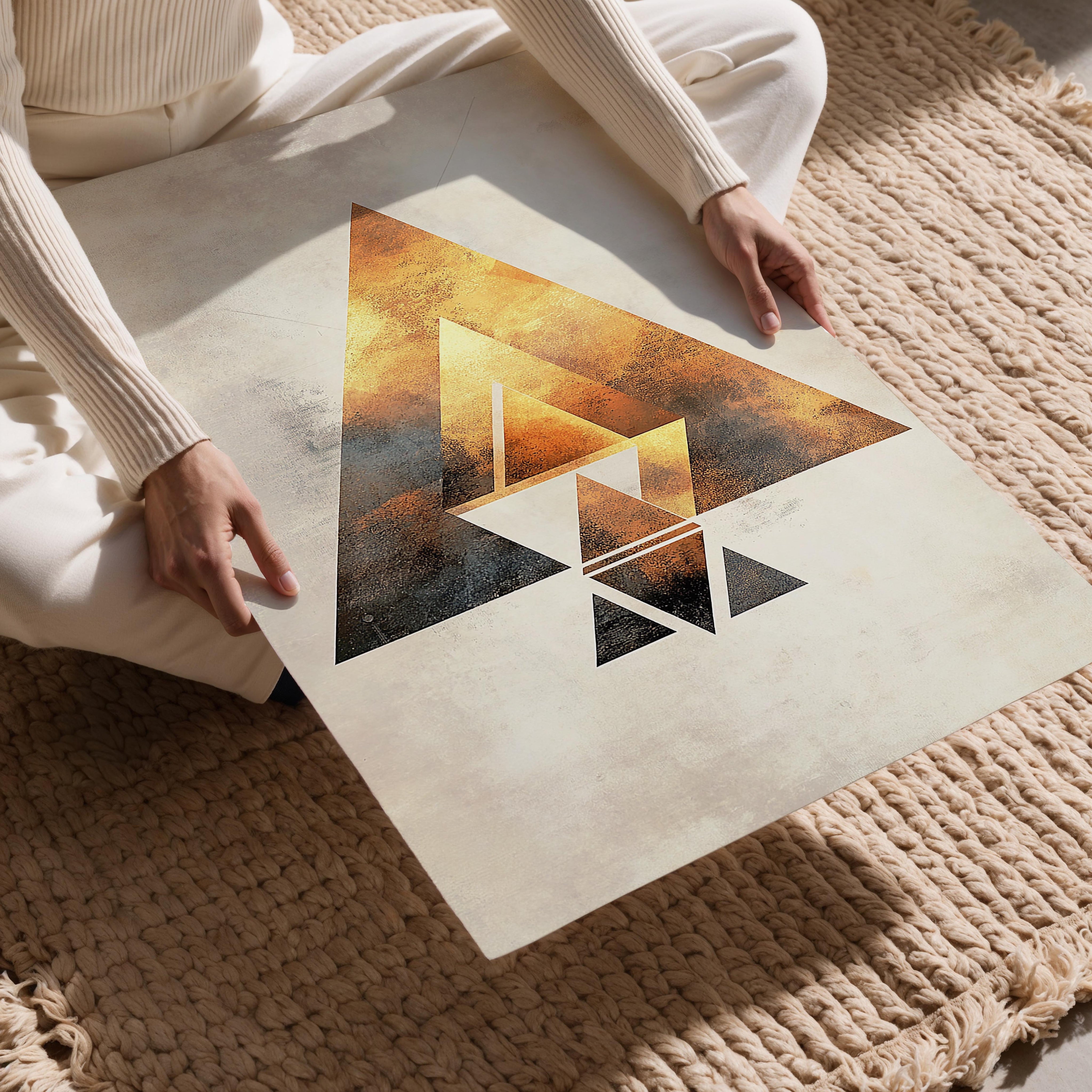 This modern geometric piece features a series of interlocking triangles in golden and earthy tones. The minimalistic design paired with its rich textures makes it a versatile choice for contemporary spaces, offices, or galleries seeking a sophisticated yet bold accent.