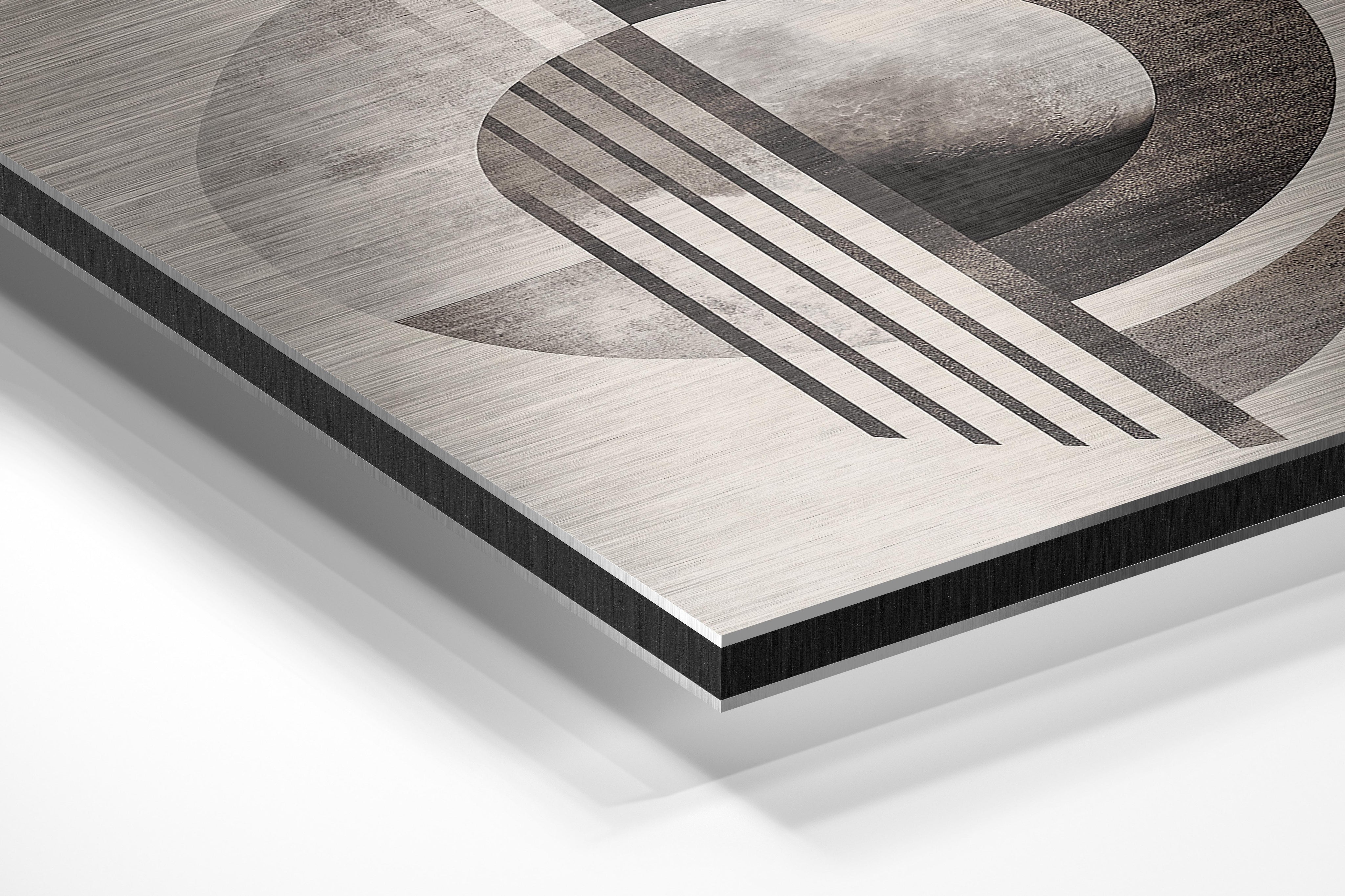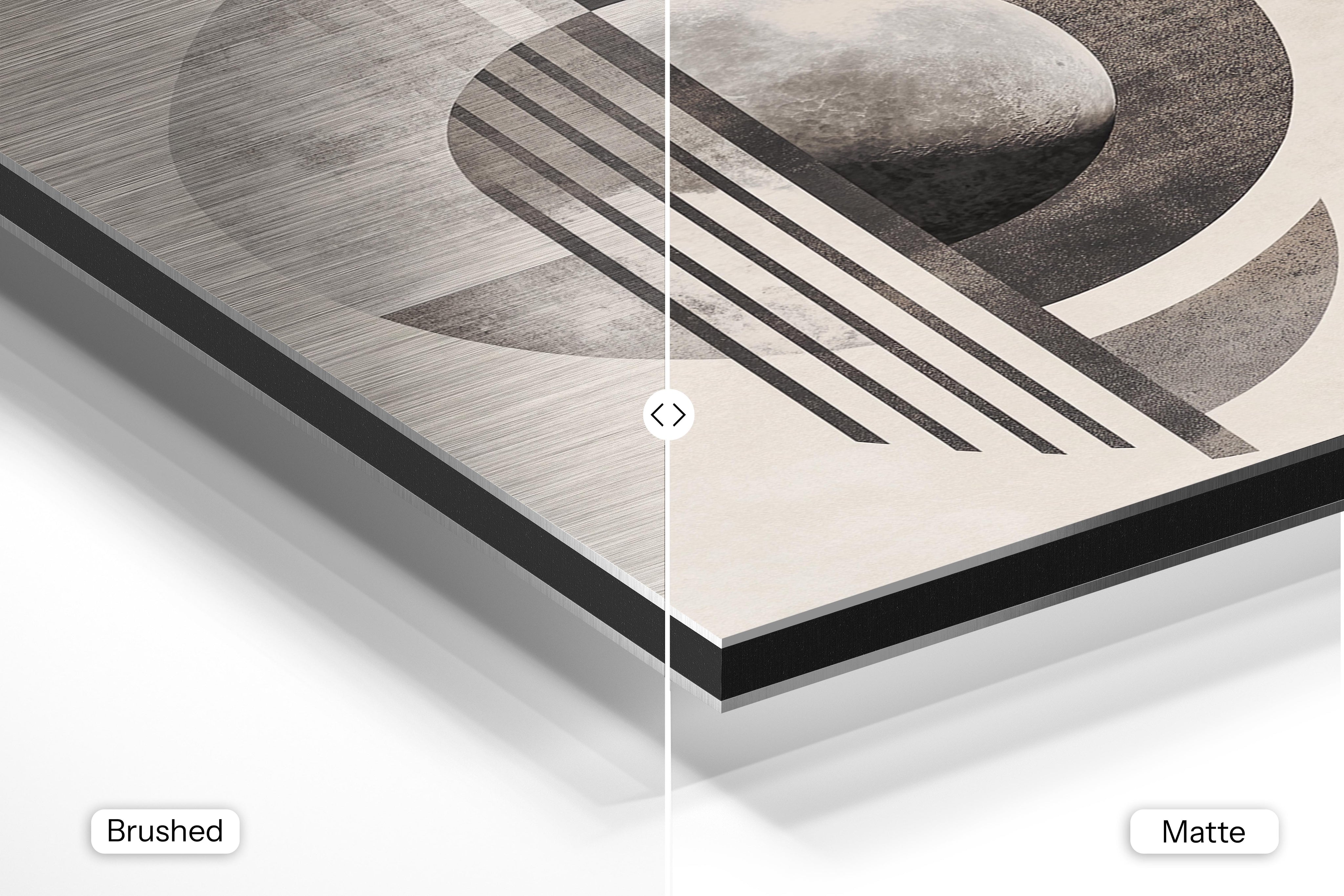 - Brushed Aluminum, on the other hand, features a raw metallic texture with visible brush strokes. Whites and highlights in your image let the silver surface show through, adding a dramatic, shimmering effect. Ideal for black-and-white images, minimalist designs, or abstract art, it creates a bold, industrial vibe with a modern edge.