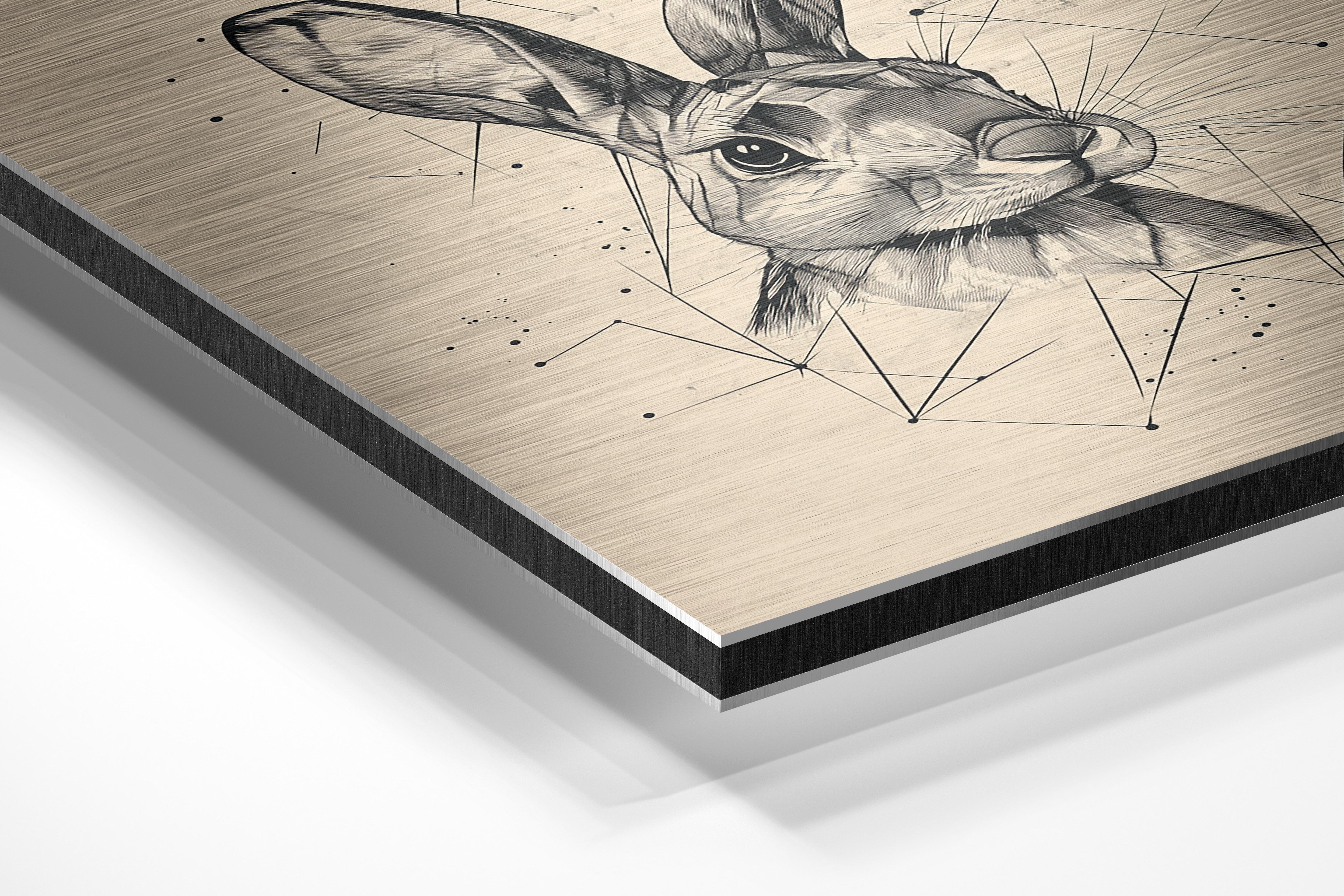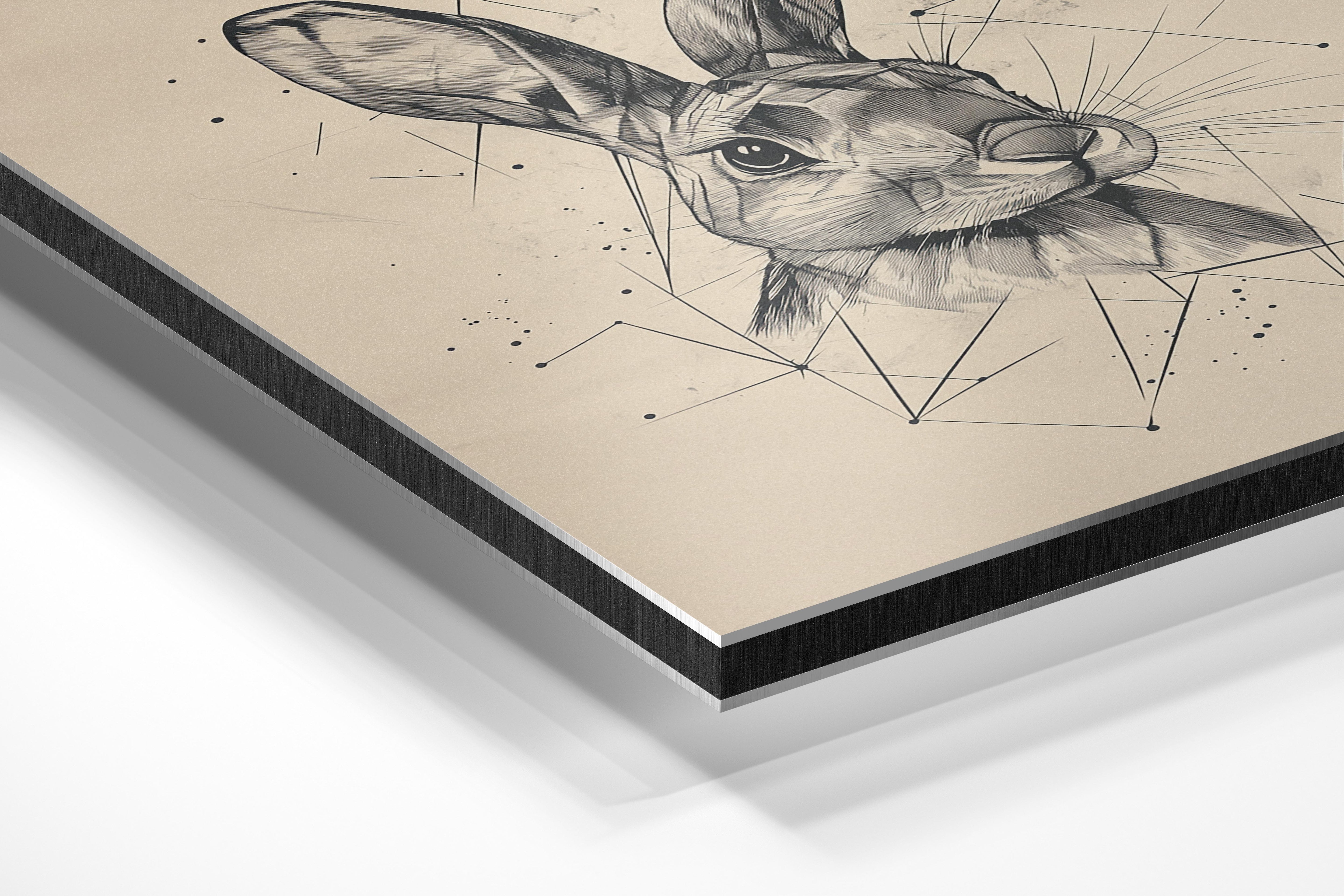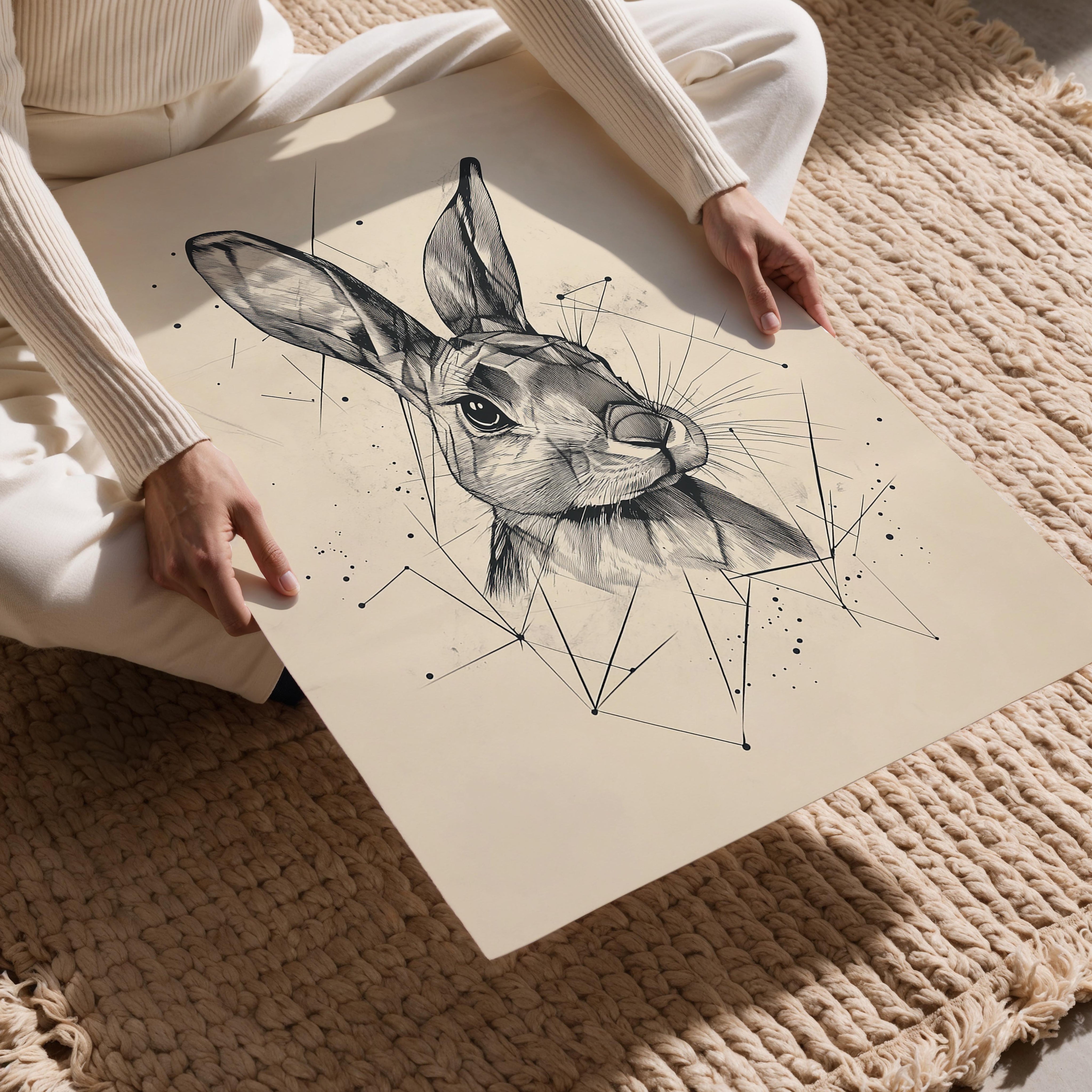 This modern black-and-white sketch of a rabbit integrates geometric elements with fine ink lines, creating a contemporary and visually intriguing composition. The structured lines add a futuristic feel, while the organic curves maintain the softness of the rabbit’s features. This piece is ideal for lovers of minimalist or abstract art, fitting well into modern interiors, office spaces, or creative studios. The contrast between structured geometry and natural form gives this artwork a unique balance, making it a versatile and thought-provoking addition to any collection.