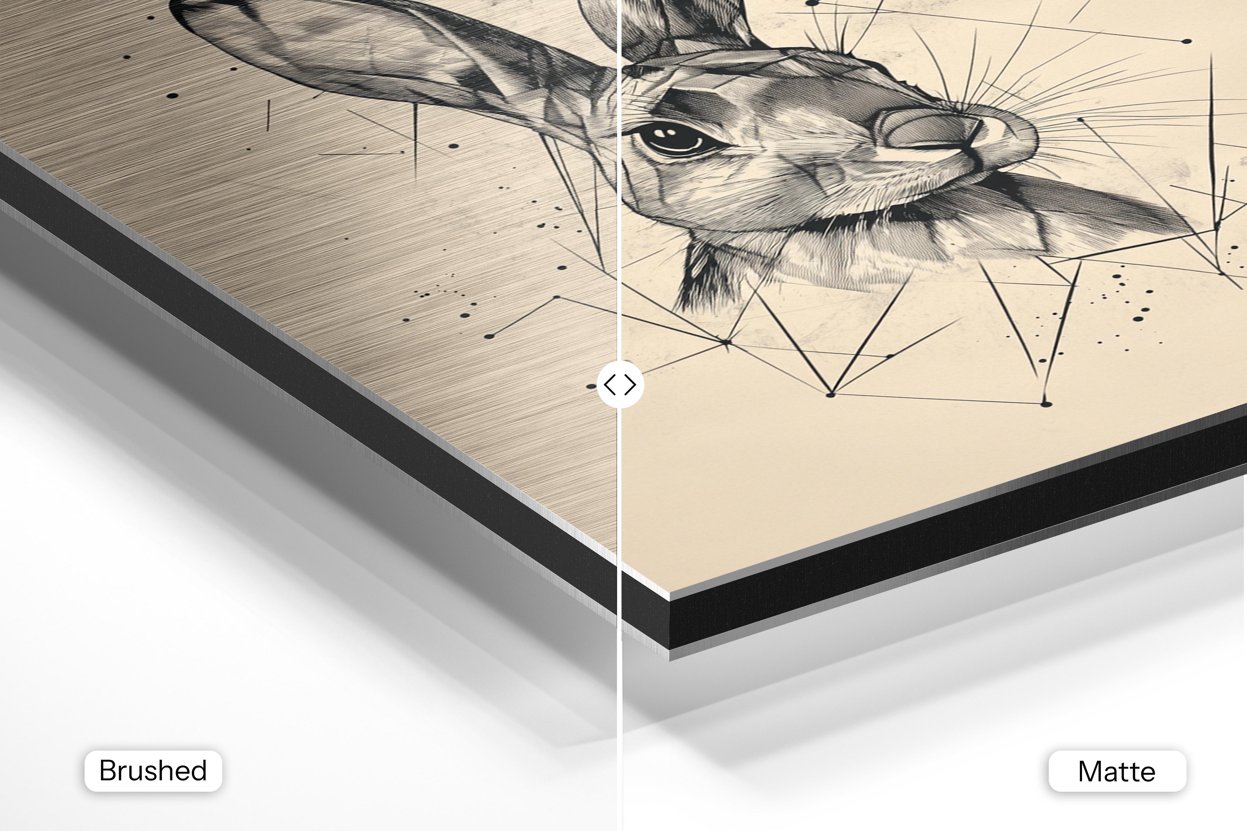 - Brushed Aluminum, on the other hand, features a raw metallic texture with visible brush strokes. Whites and highlights in your image let the silver surface show through, adding a dramatic, shimmering effect. Ideal for black-and-white images, minimalist designs, or abstract art, it creates a bold, industrial vibe with a modern edge.