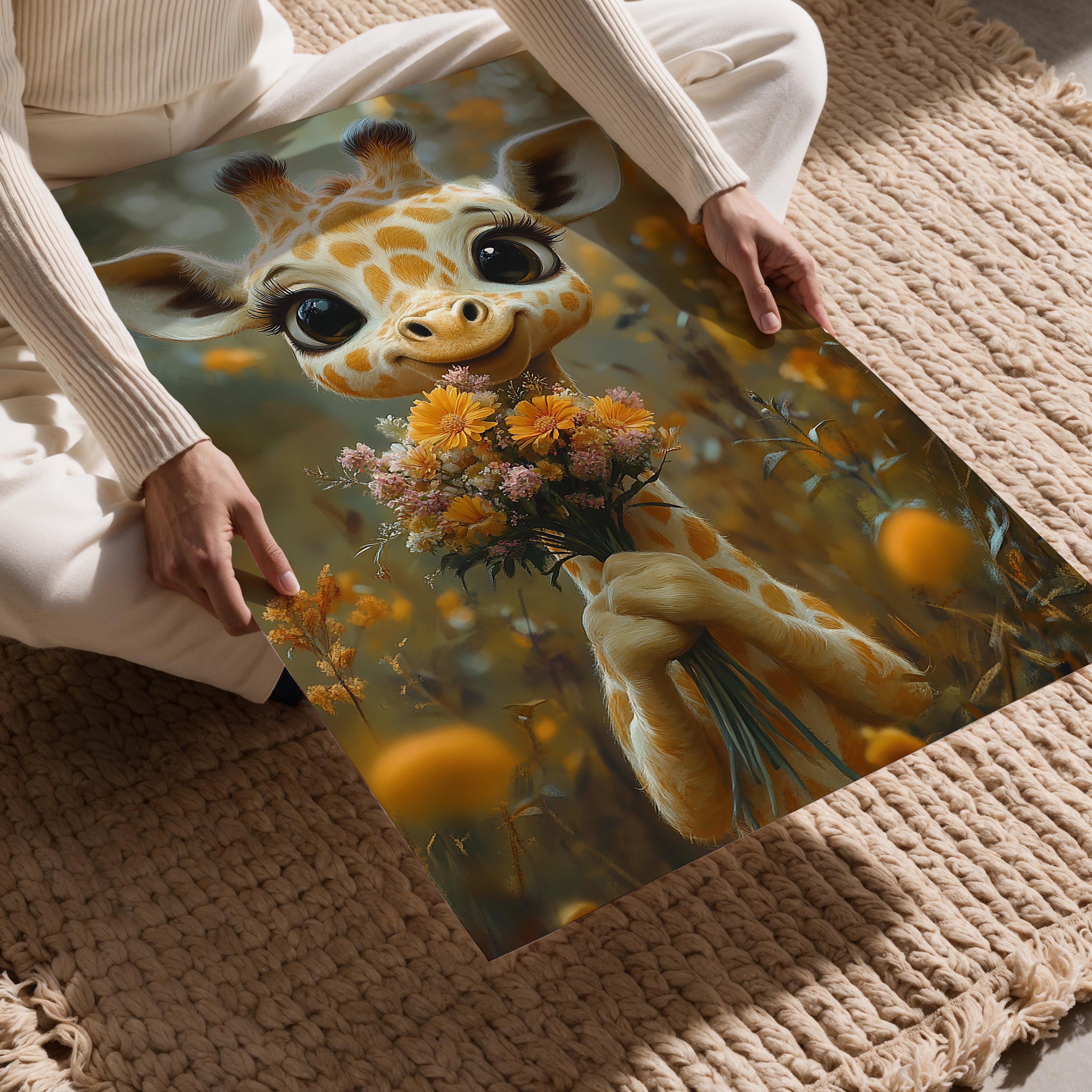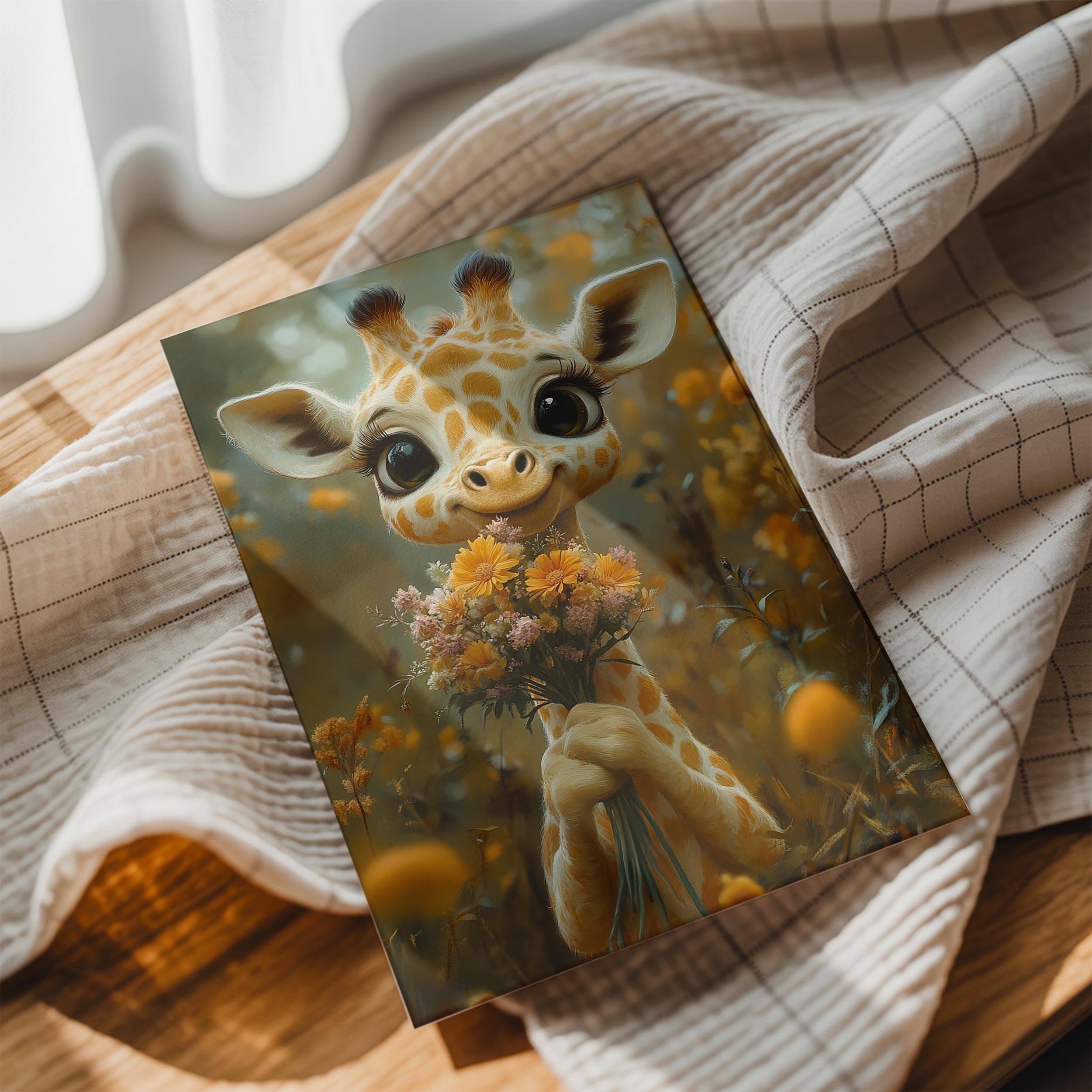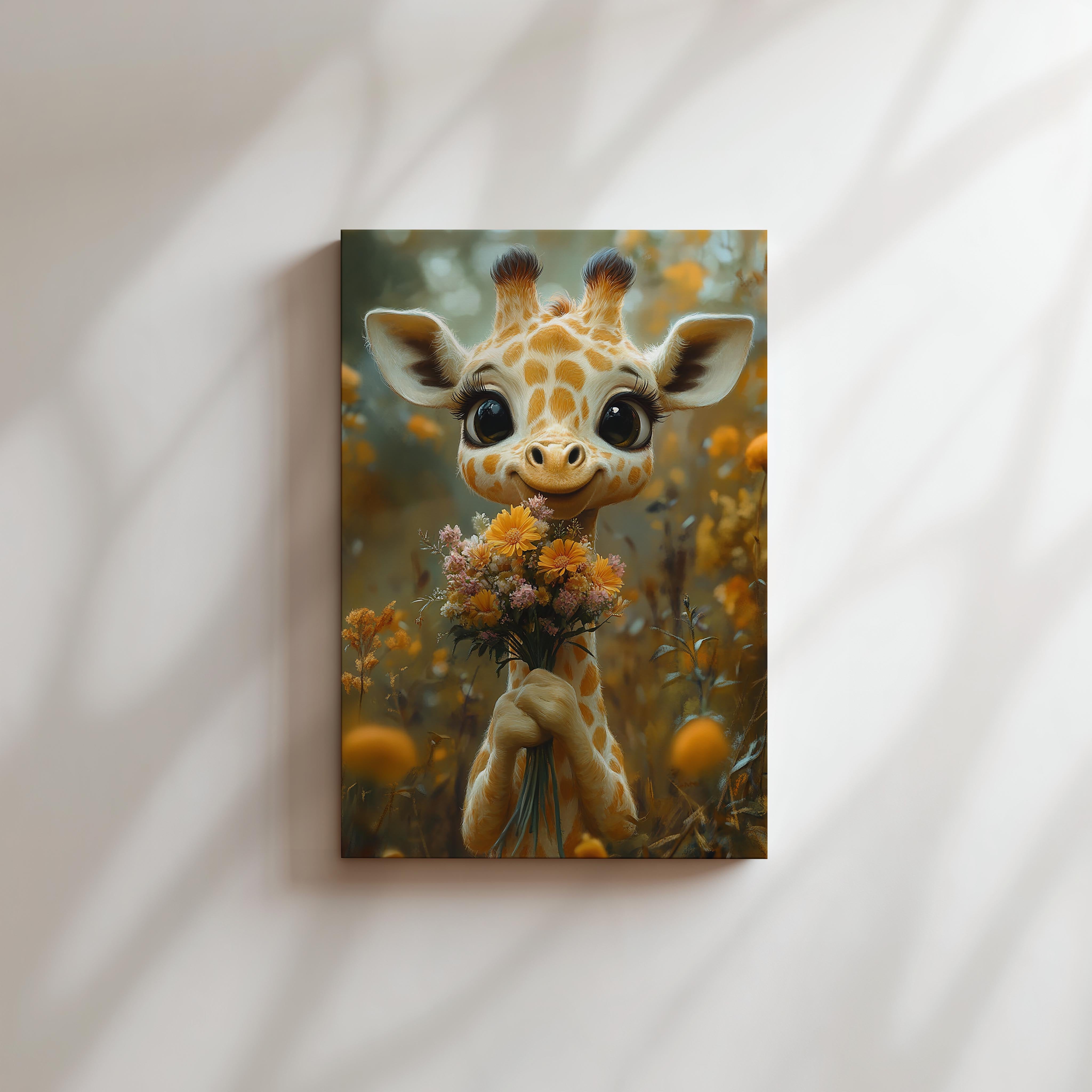 This delightful artwork features an adorable giraffe holding a bouquet of colorful flowers in a sunlit meadow. The giraffe’s joyful expression and the vibrant floral details make this piece perfect for nature lovers or those seeking to add a cheerful touch to their decor. It’s a charming and uplifting addition to any space.