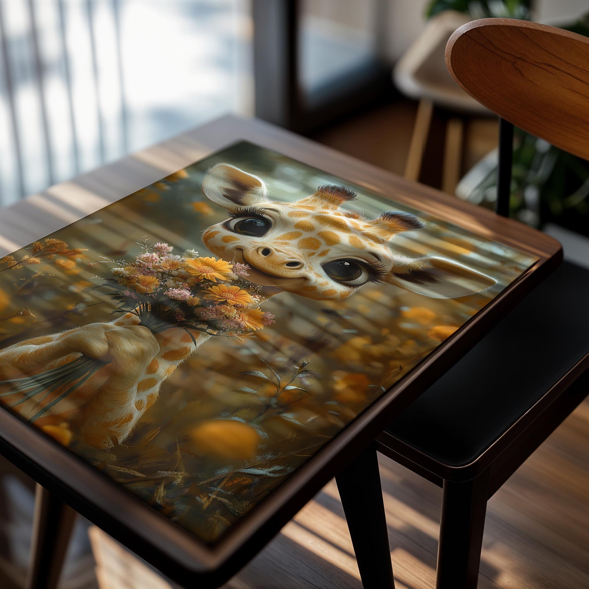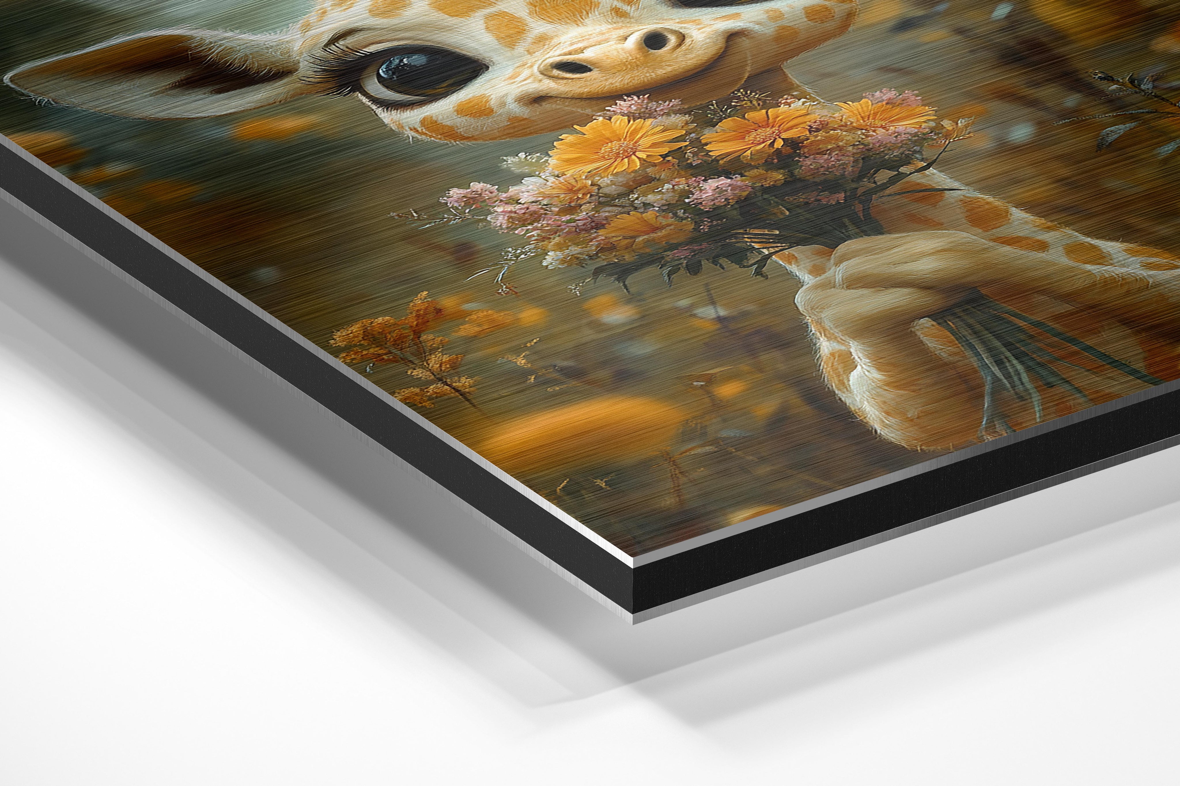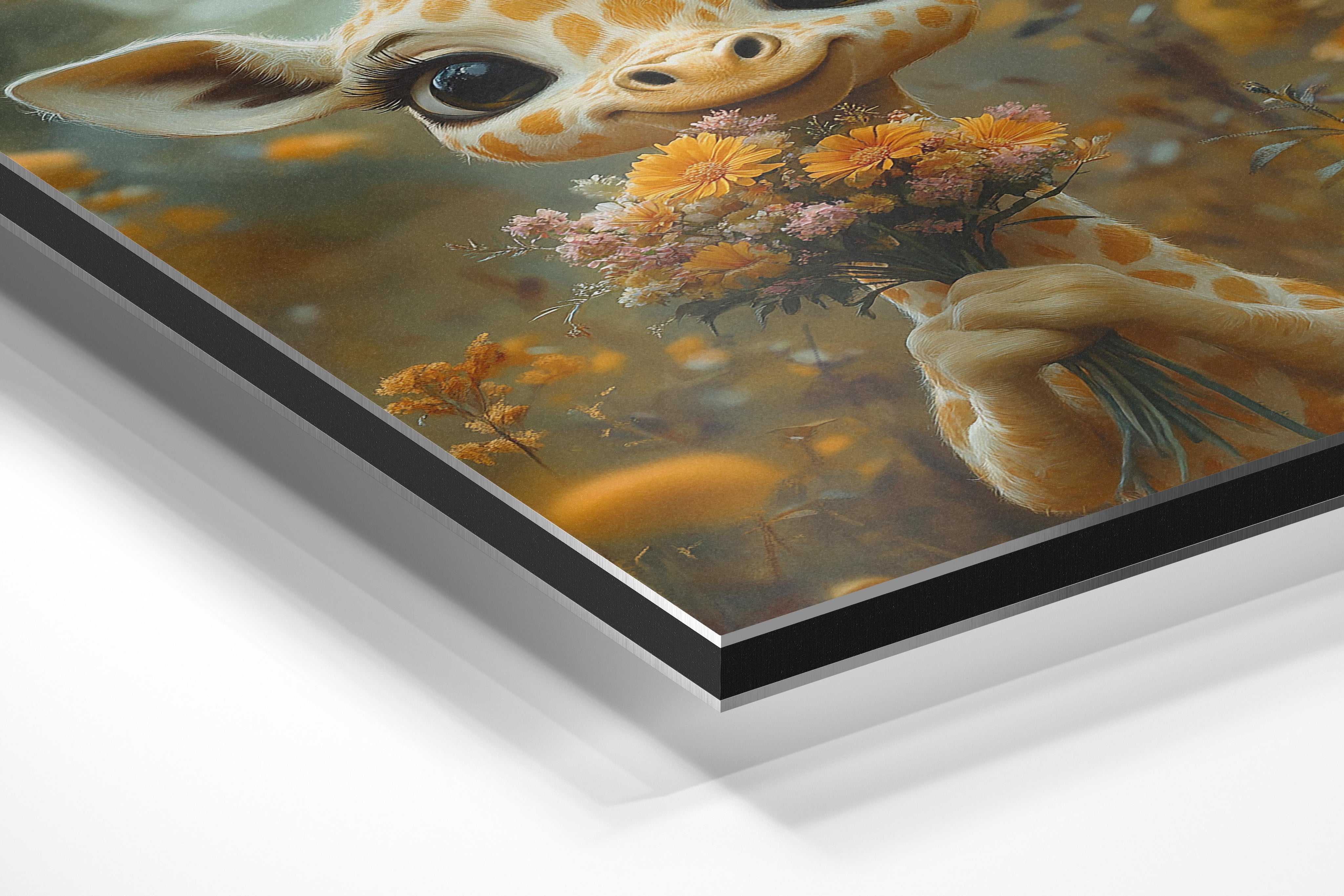 This delightful artwork features an adorable giraffe holding a bouquet of colorful flowers in a sunlit meadow. The giraffe’s joyful expression and the vibrant floral details make this piece perfect for nature lovers or those seeking to add a cheerful touch to their decor. It’s a charming and uplifting addition to any space.