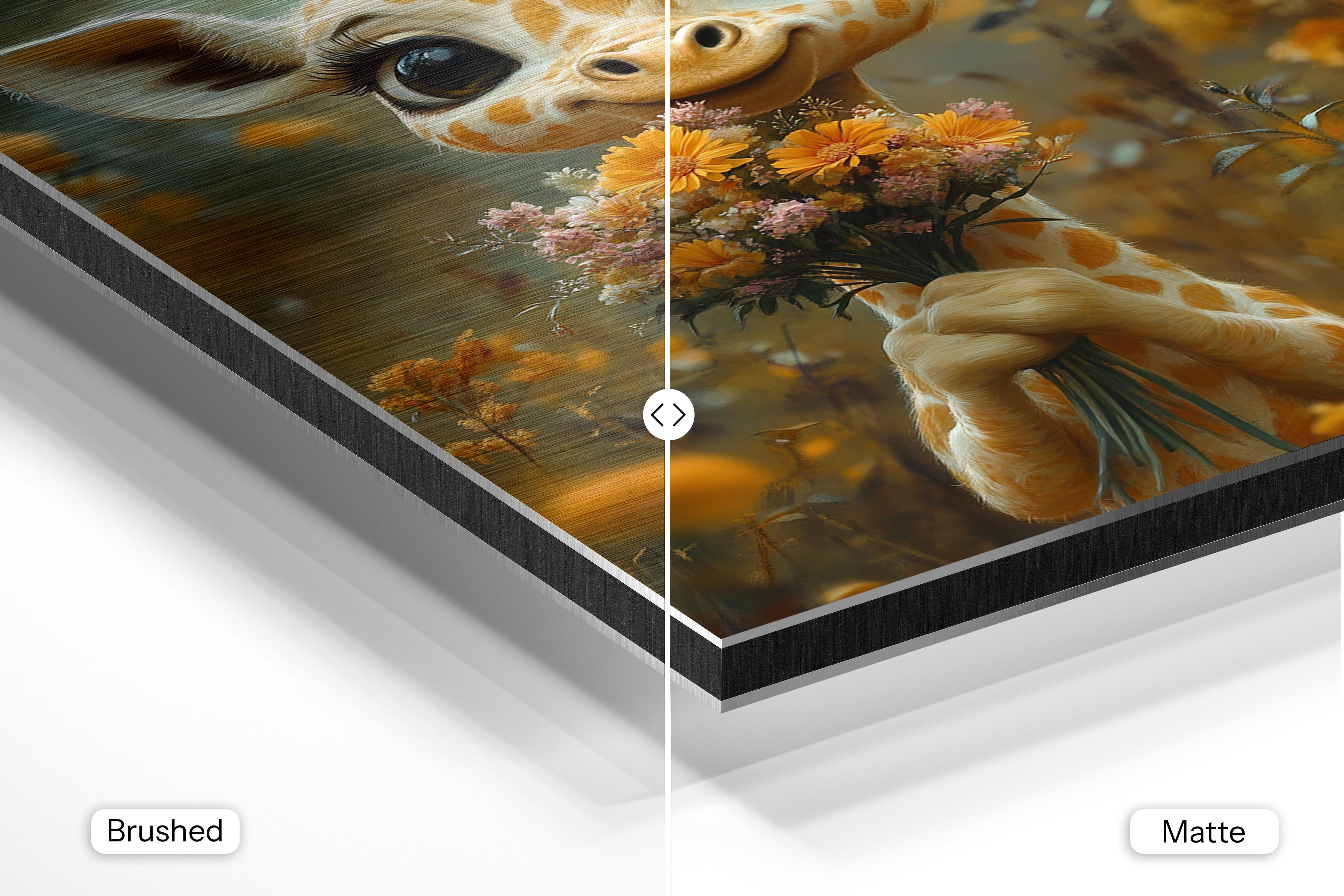 - Matte Aluminum offers a smooth, bright white surface that delivers crisp details and vibrant, true-to-life colors. With its non-reflective finish and subtle silky sheen, it’s perfect for photography, portraits, and colorful artwork—bringing a clean, polished look to any interior.