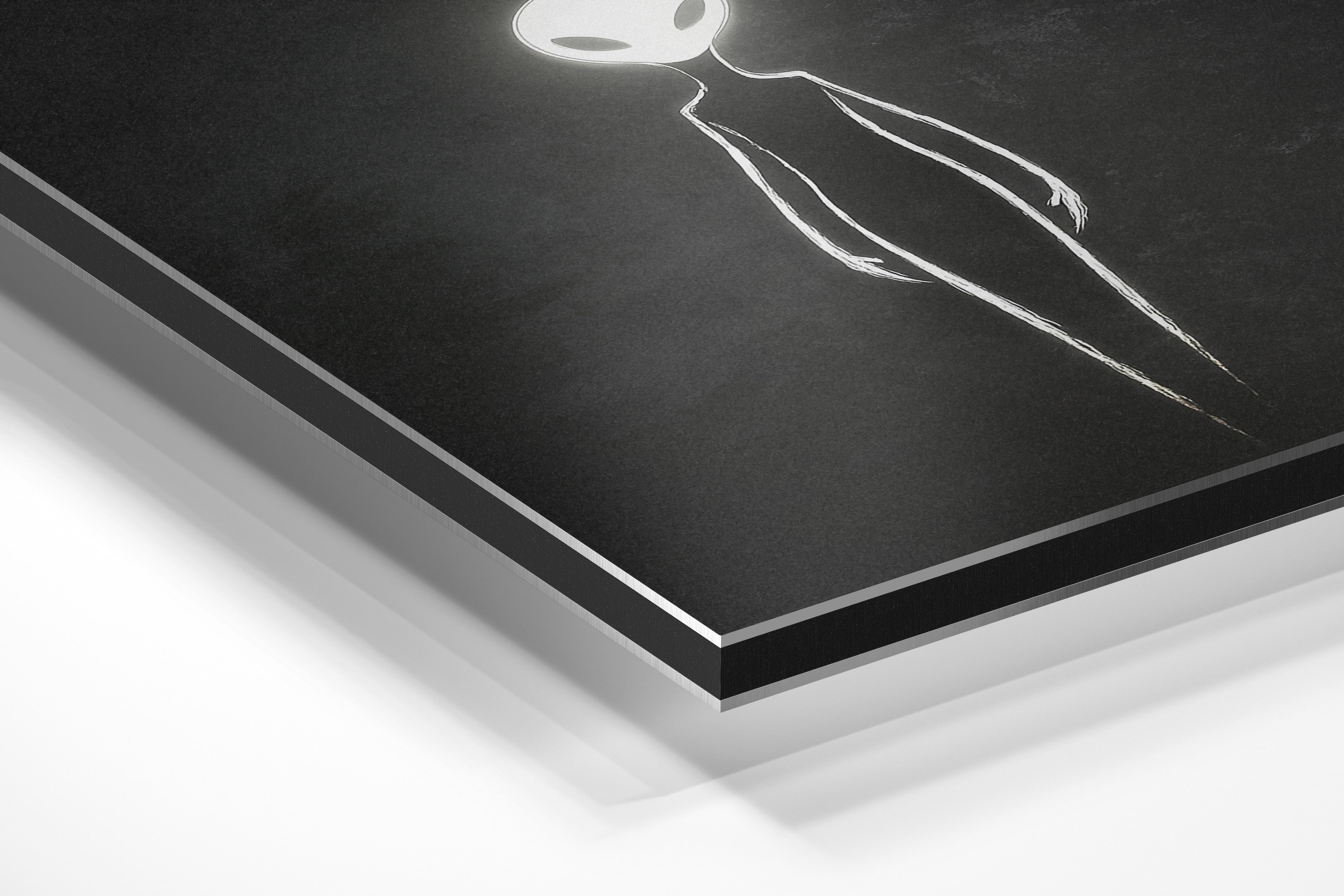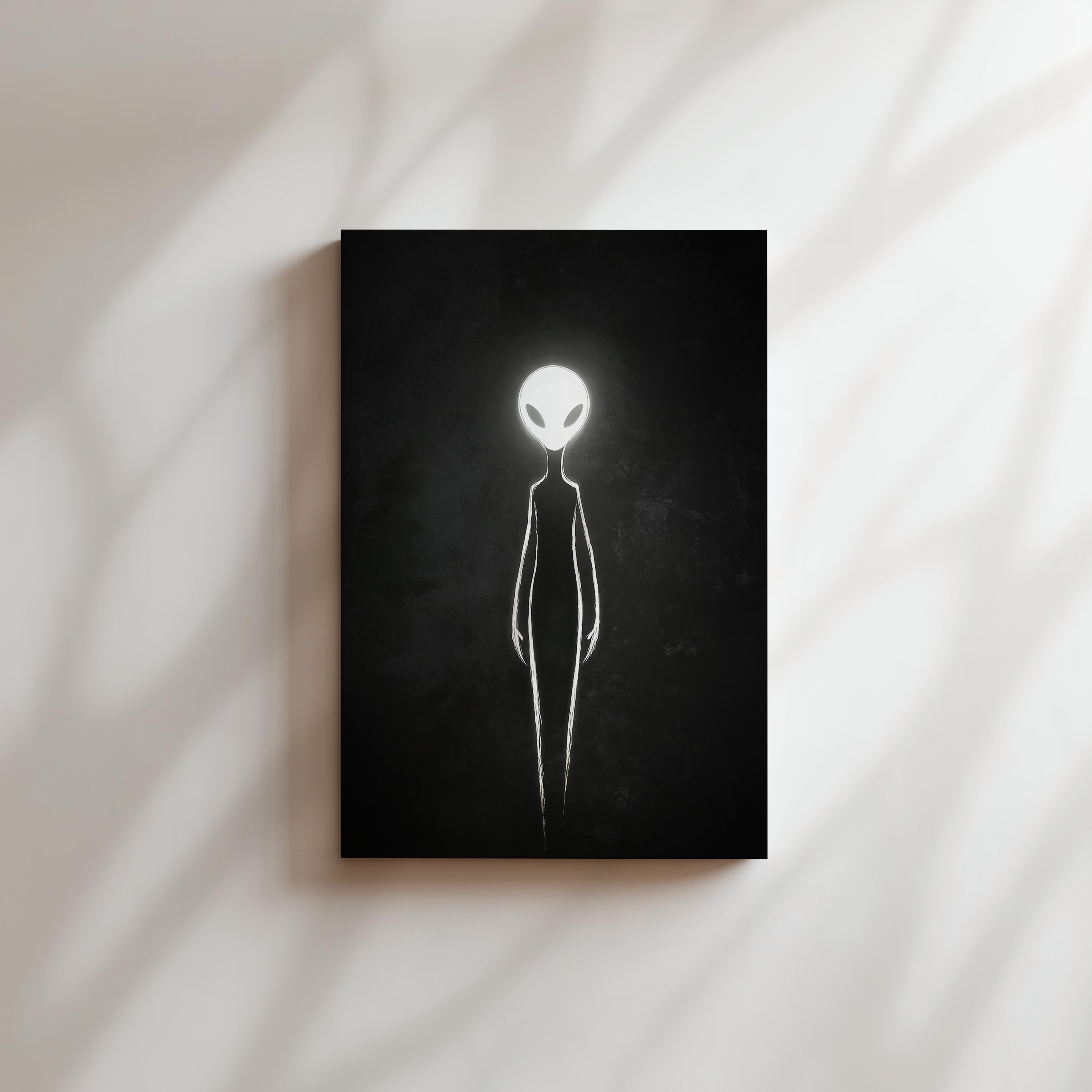 This artwork features an ethereal alien figure outlined in glowing white light against a shadowy black background. The haunting glow creates a surreal and otherworldly presence, making it perfect for lovers of sci-fi and mysterious art. Its minimalist style adds a modern touch, making it suitable for sleek interiors and contemporary art collections. This piece invites viewers to ponder the unknown, offering a captivating and thought-provoking addition to any wall.