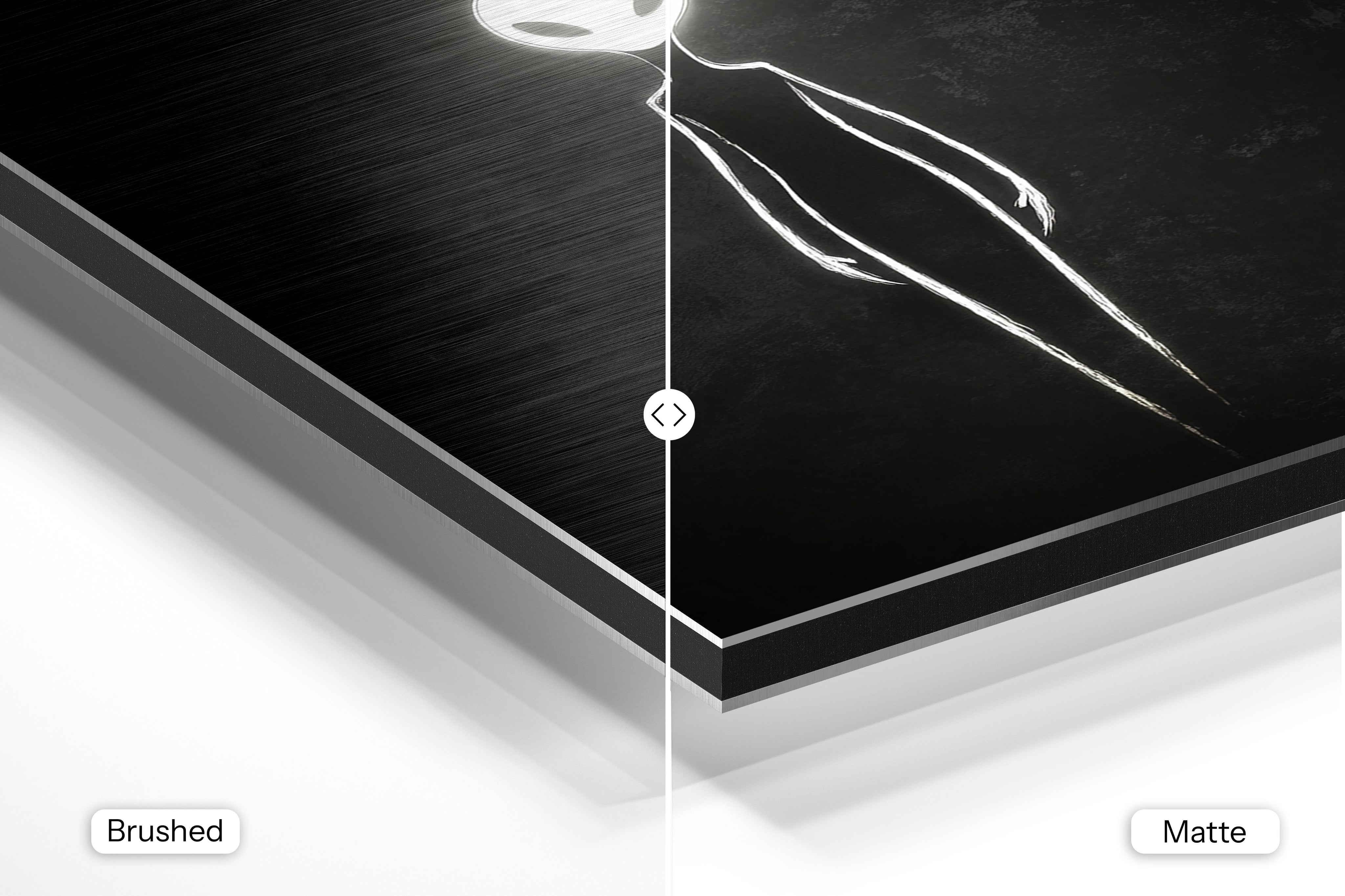 - Brushed Aluminum, on the other hand, features a raw metallic texture with visible brush strokes. Whites and highlights in your image let the silver surface show through, adding a dramatic, shimmering effect. Ideal for black-and-white images, minimalist designs, or abstract art, it creates a bold, industrial vibe with a modern edge.