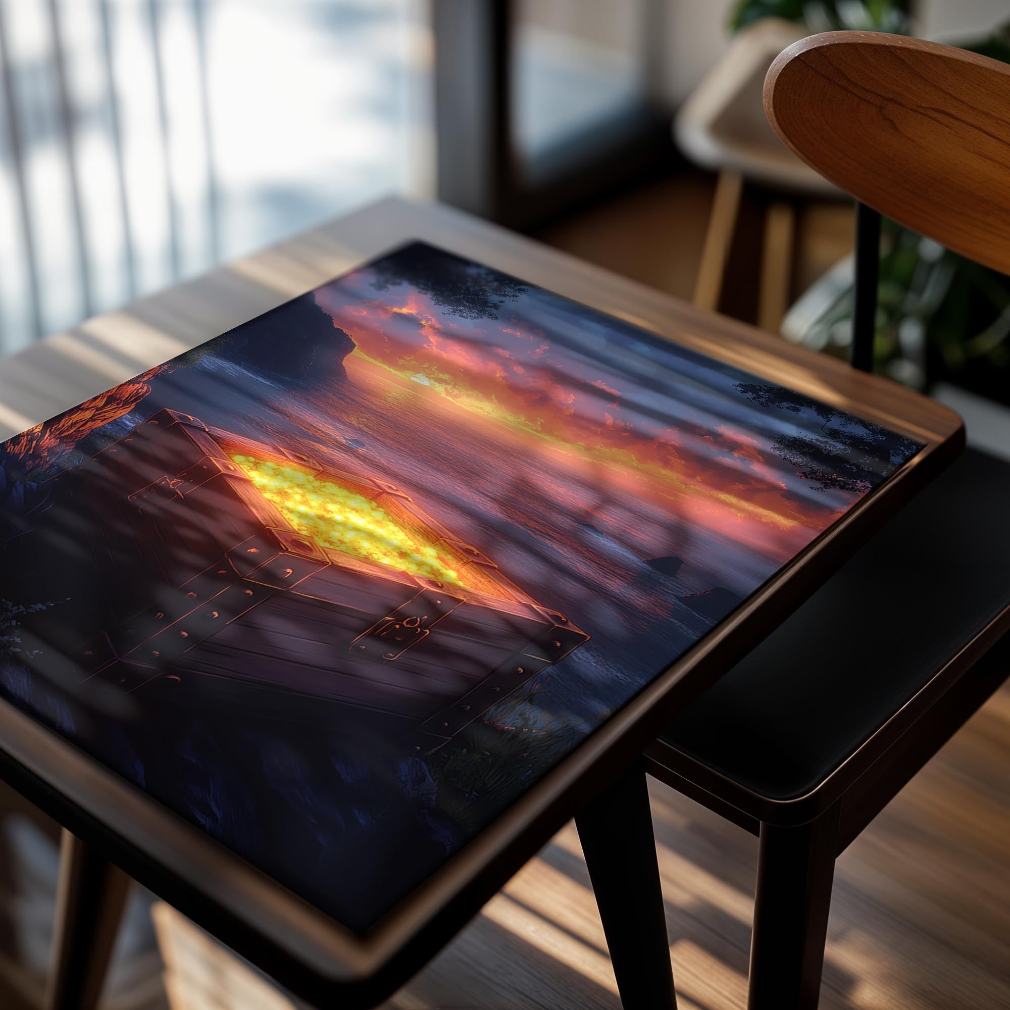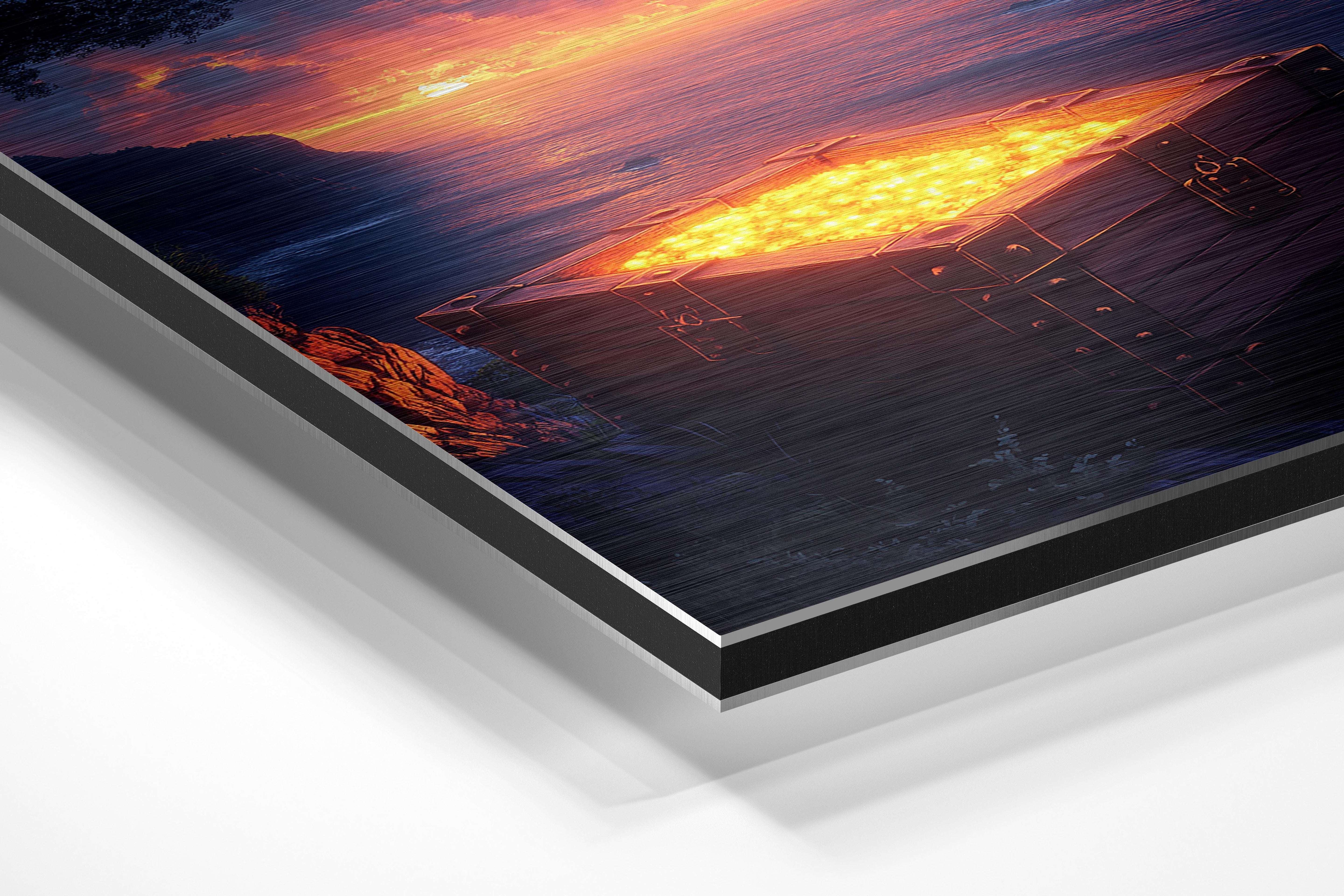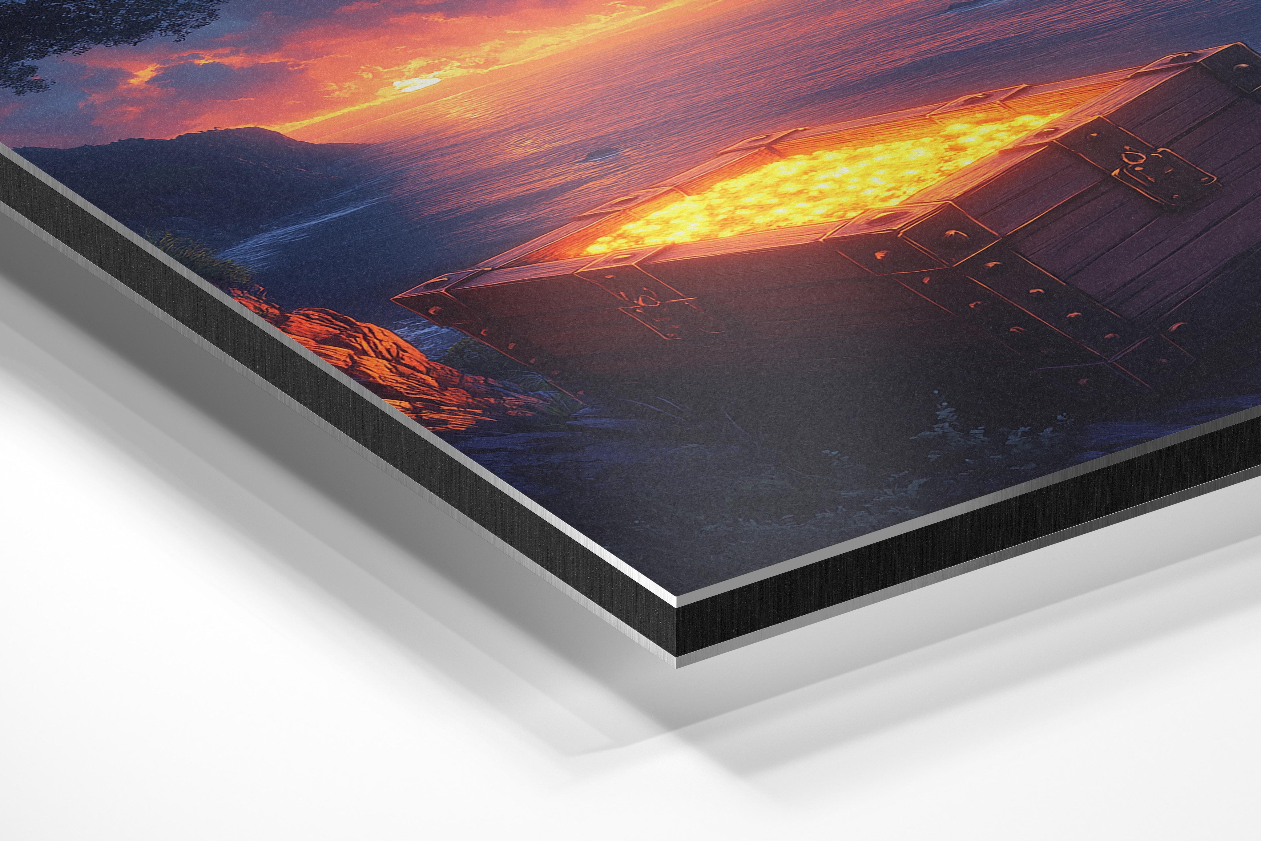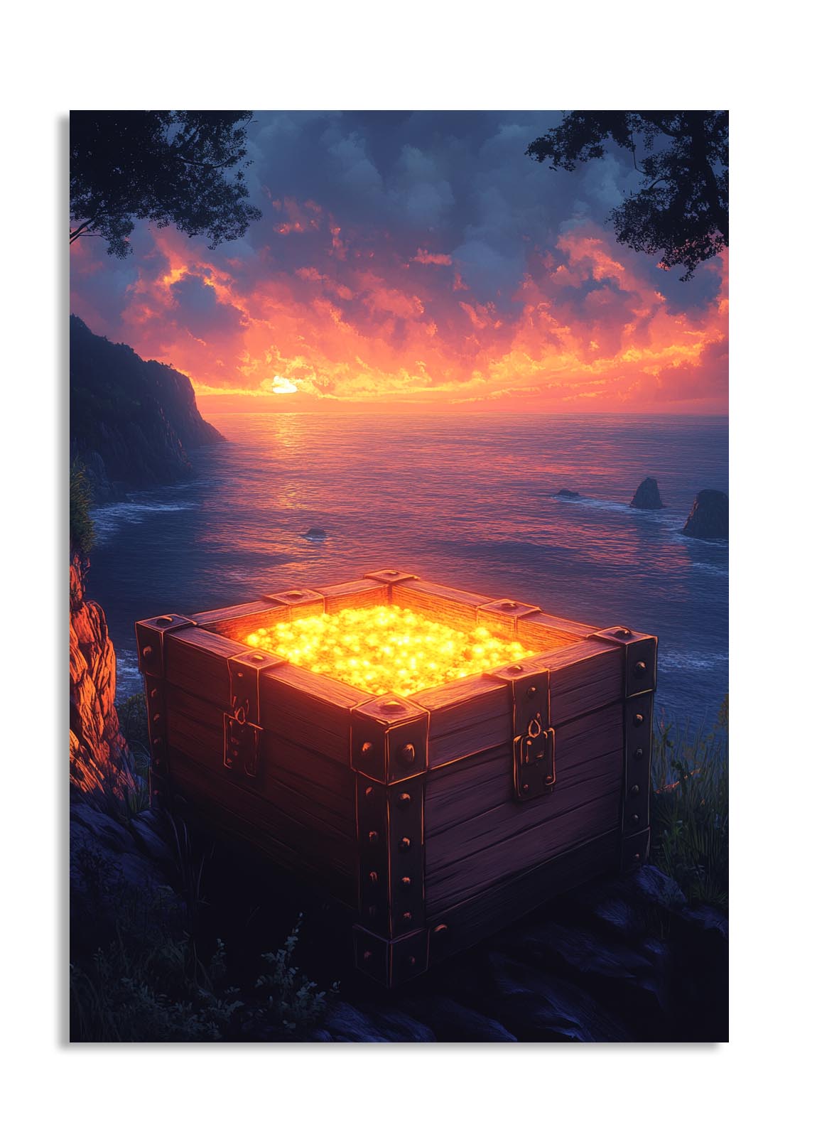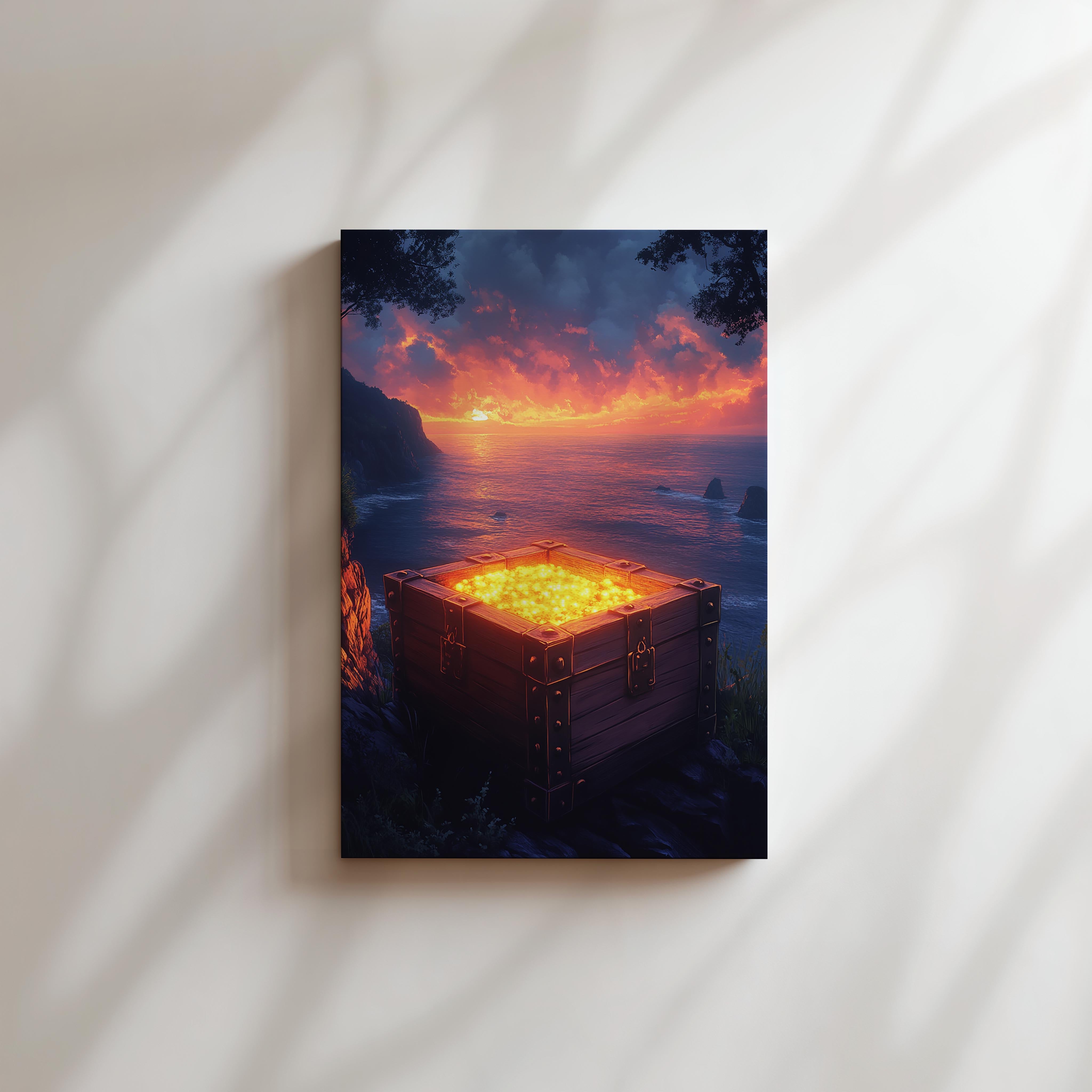 A glowing treasure chest sits by a serene coastline under a vivid, colorful sunset. The warm golden hues of the chest light contrast beautifully with the cool tones of the ocean and sky. Perfect for adventurers, storytellers, and art enthusiasts seeking an inspiring and atmospheric piece for their walls.