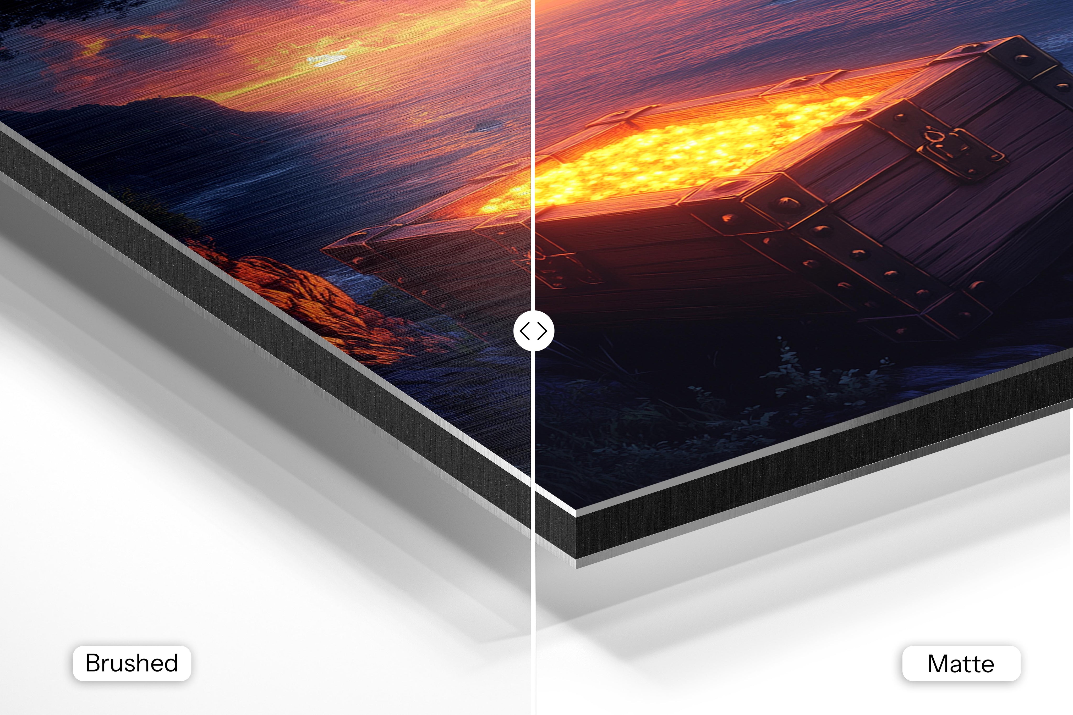 - Brushed Aluminum, on the other hand, features a raw metallic texture with visible brush strokes. Whites and highlights in your image let the silver surface show through, adding a dramatic, shimmering effect. Ideal for black-and-white images, minimalist designs, or abstract art, it creates a bold, industrial vibe with a modern edge.