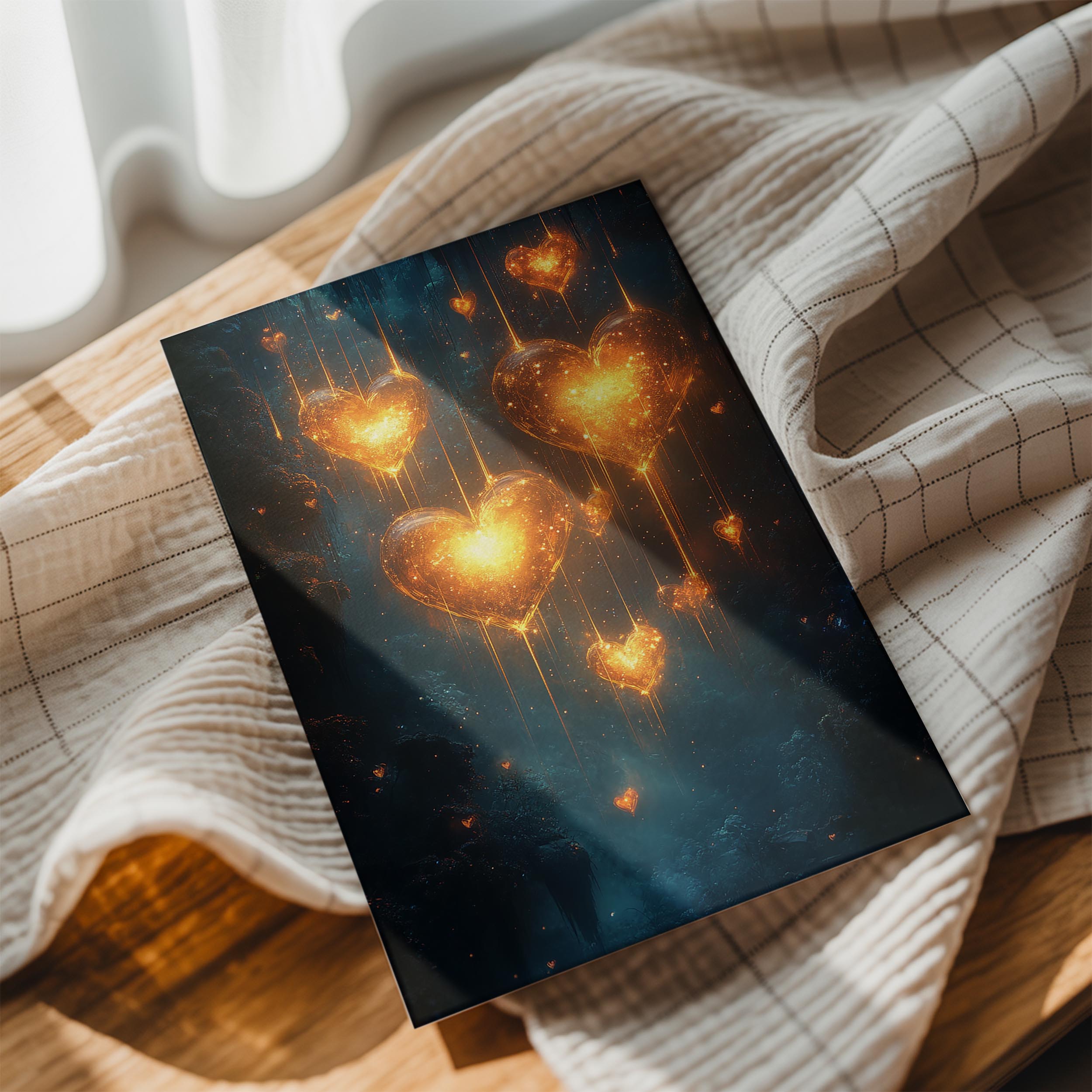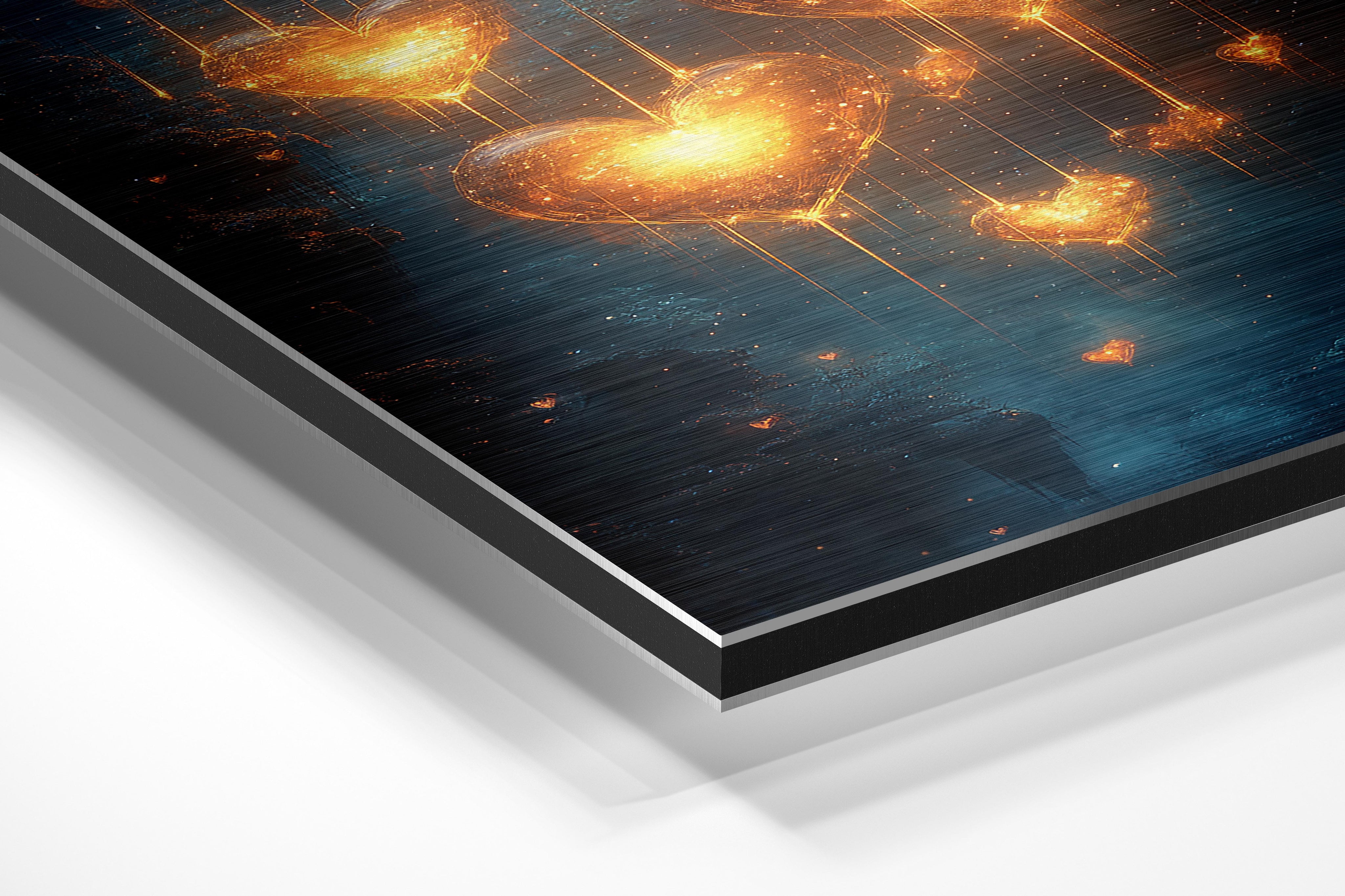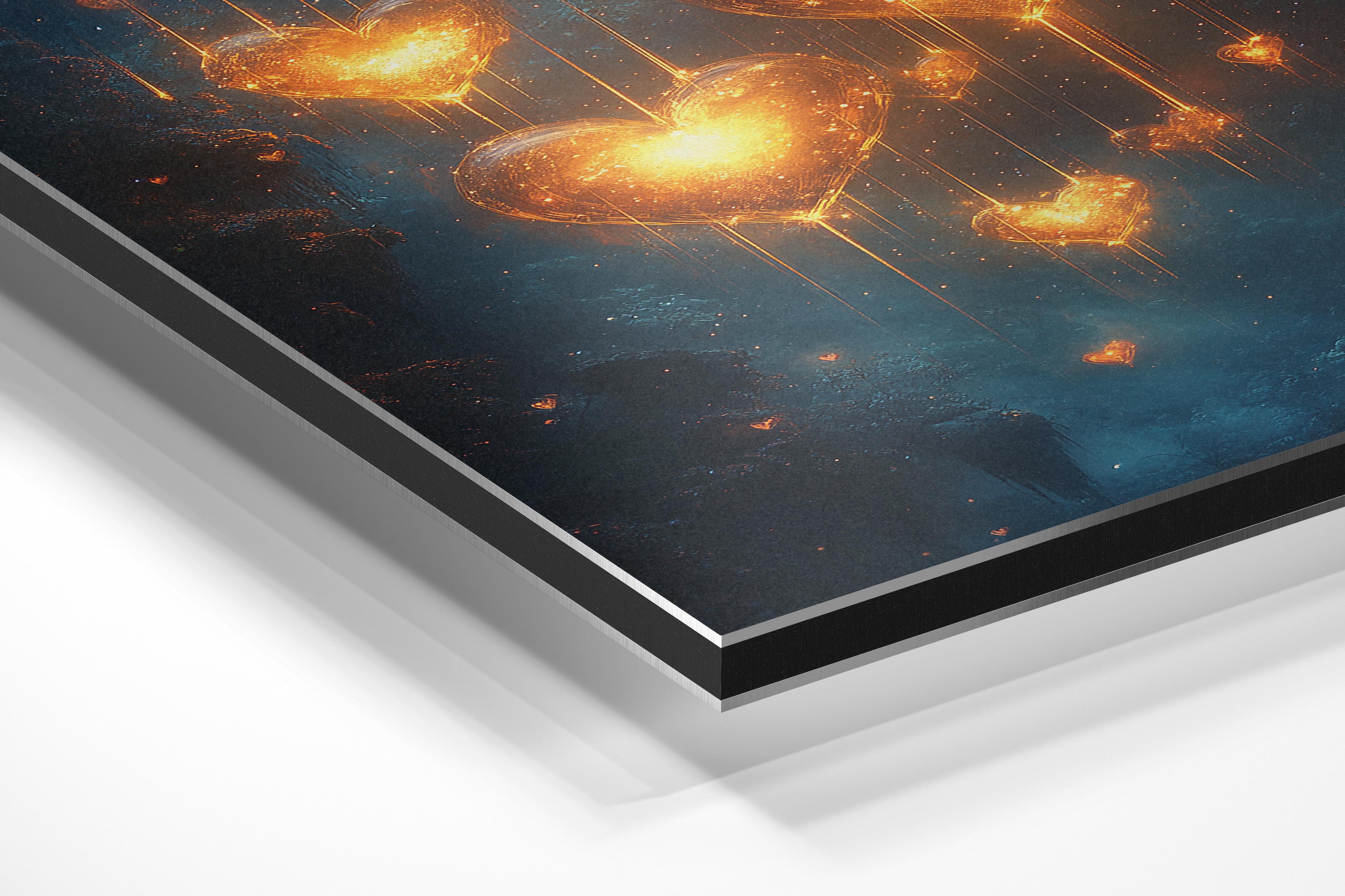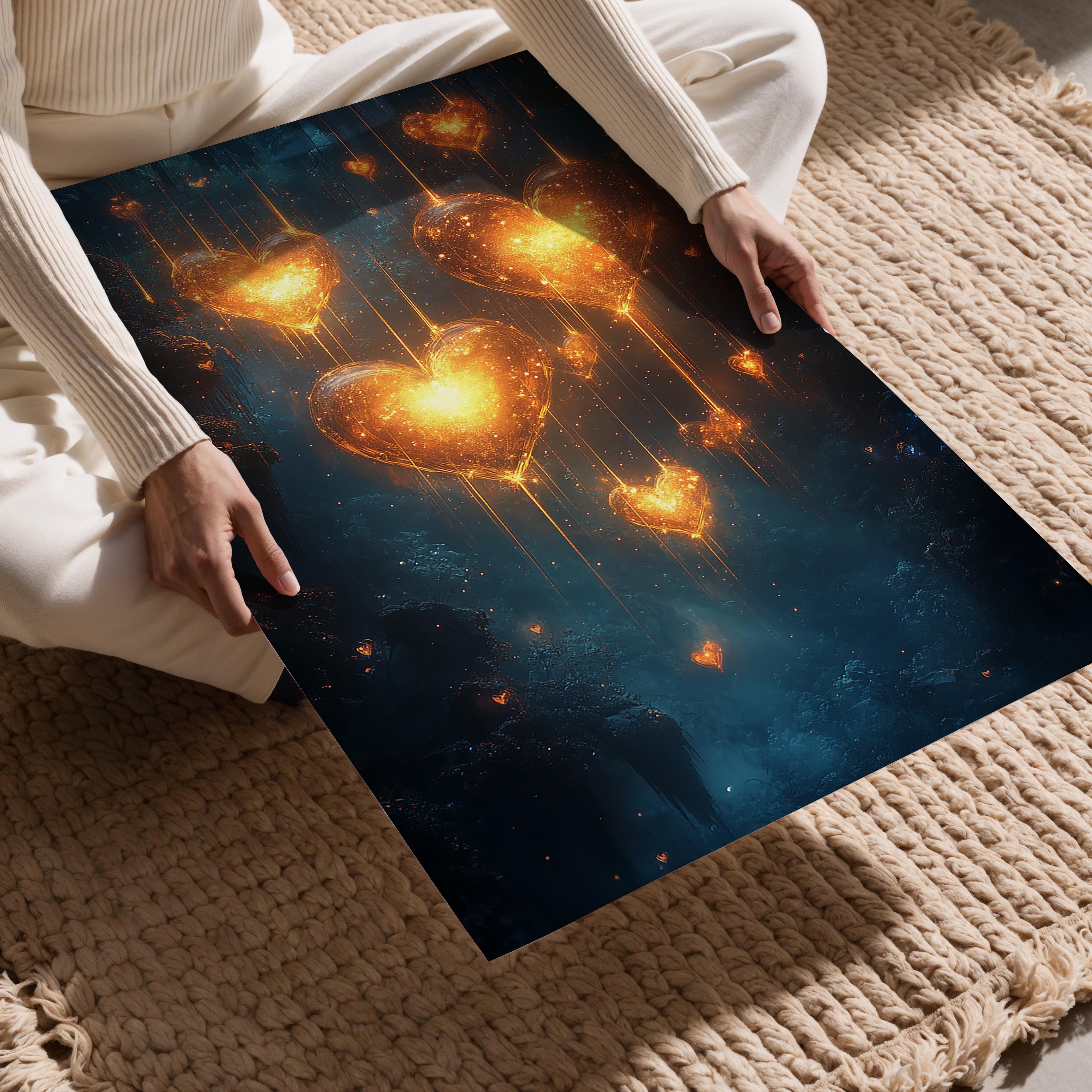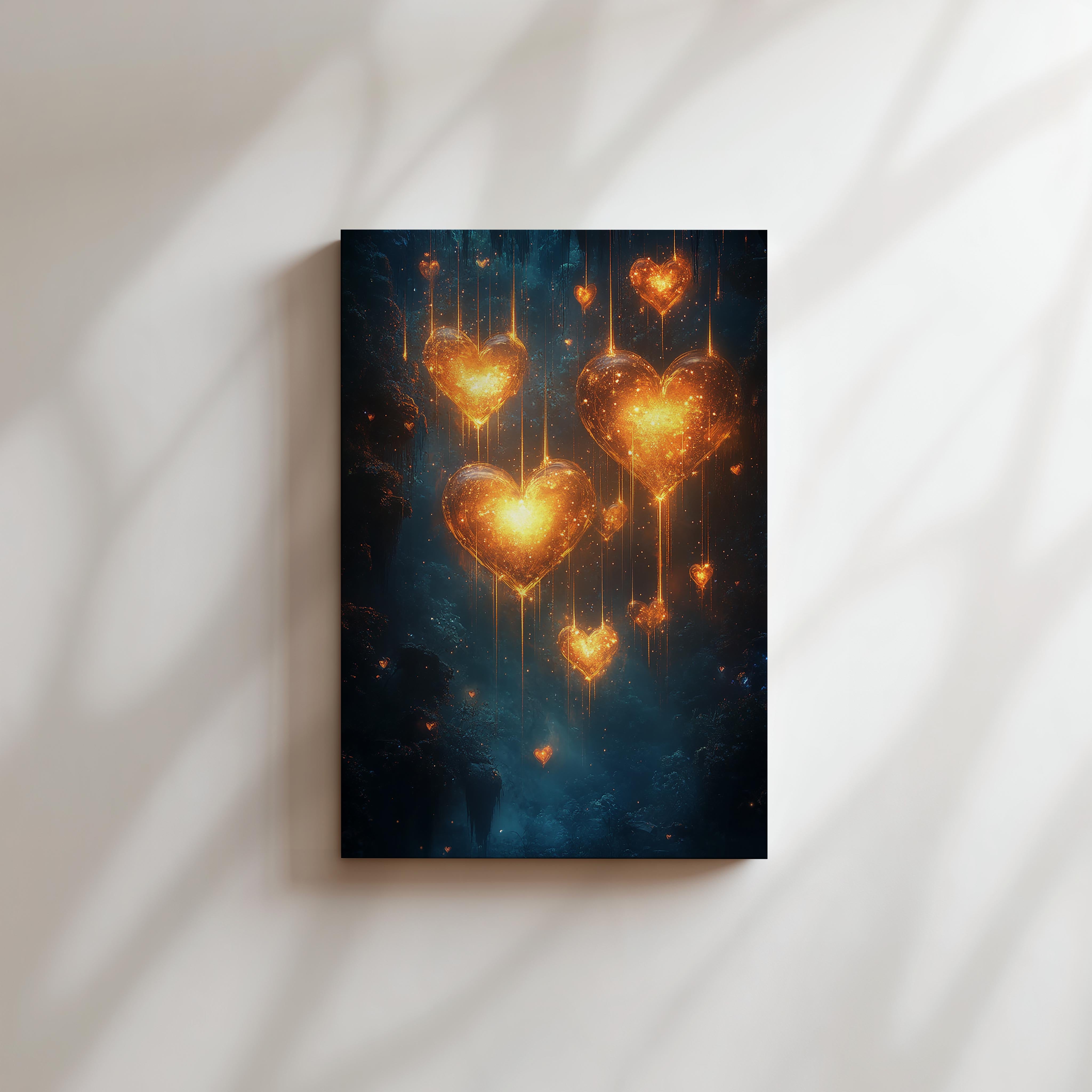 A breathtaking cascade of glowing hearts illuminates a mystical blue background. The shimmering golden light radiates warmth and love, making it a captivating piece for romantic settings, weddings, or serene home decor. The interplay of light and shadow creates a mesmerizing ambiance that draws viewers into this magical world.