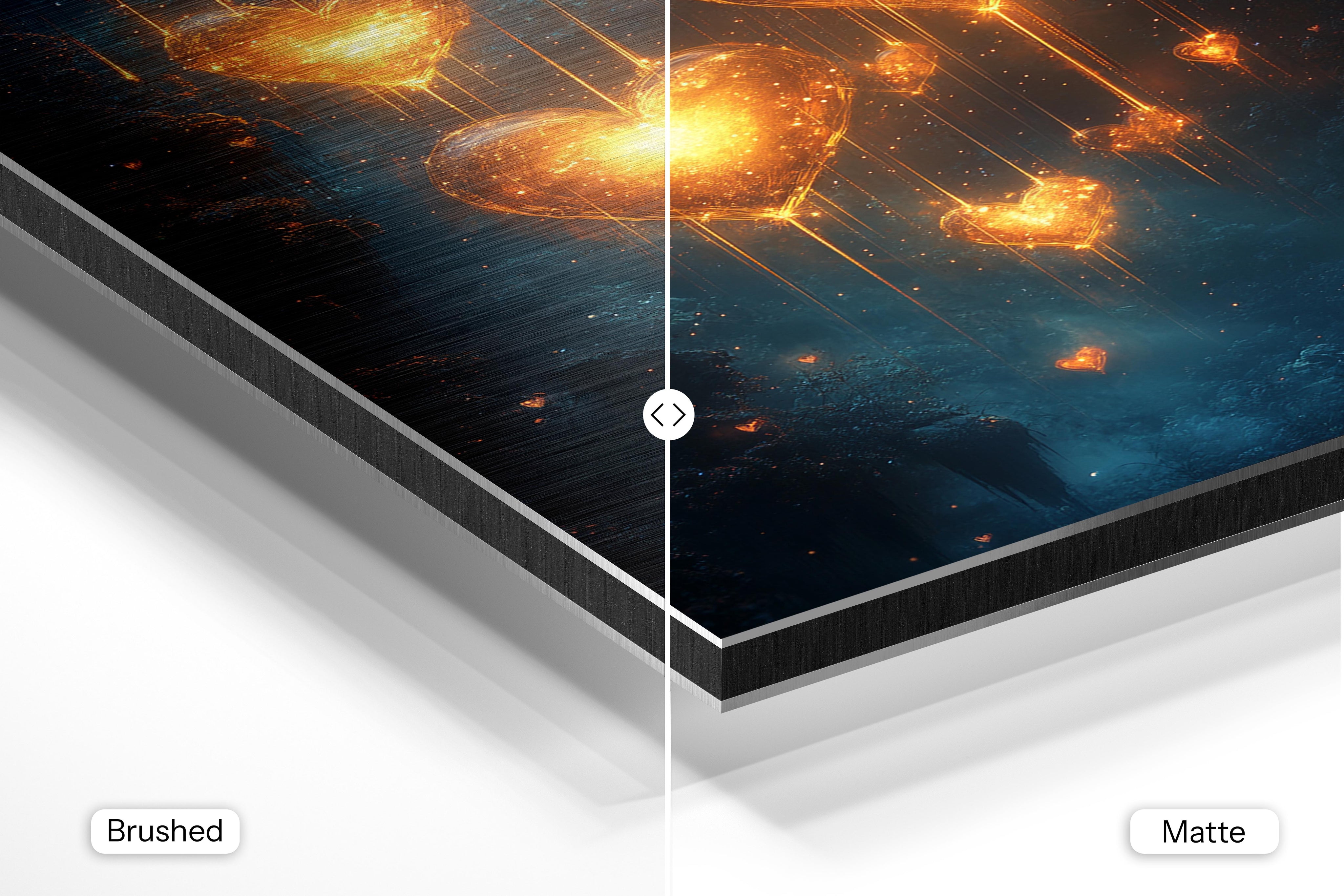 - Brushed Aluminum, on the other hand, features a raw metallic texture with visible brush strokes. Whites and highlights in your image let the silver surface show through, adding a dramatic, shimmering effect. Ideal for black-and-white images, minimalist designs, or abstract art, it creates a bold, industrial vibe with a modern edge.