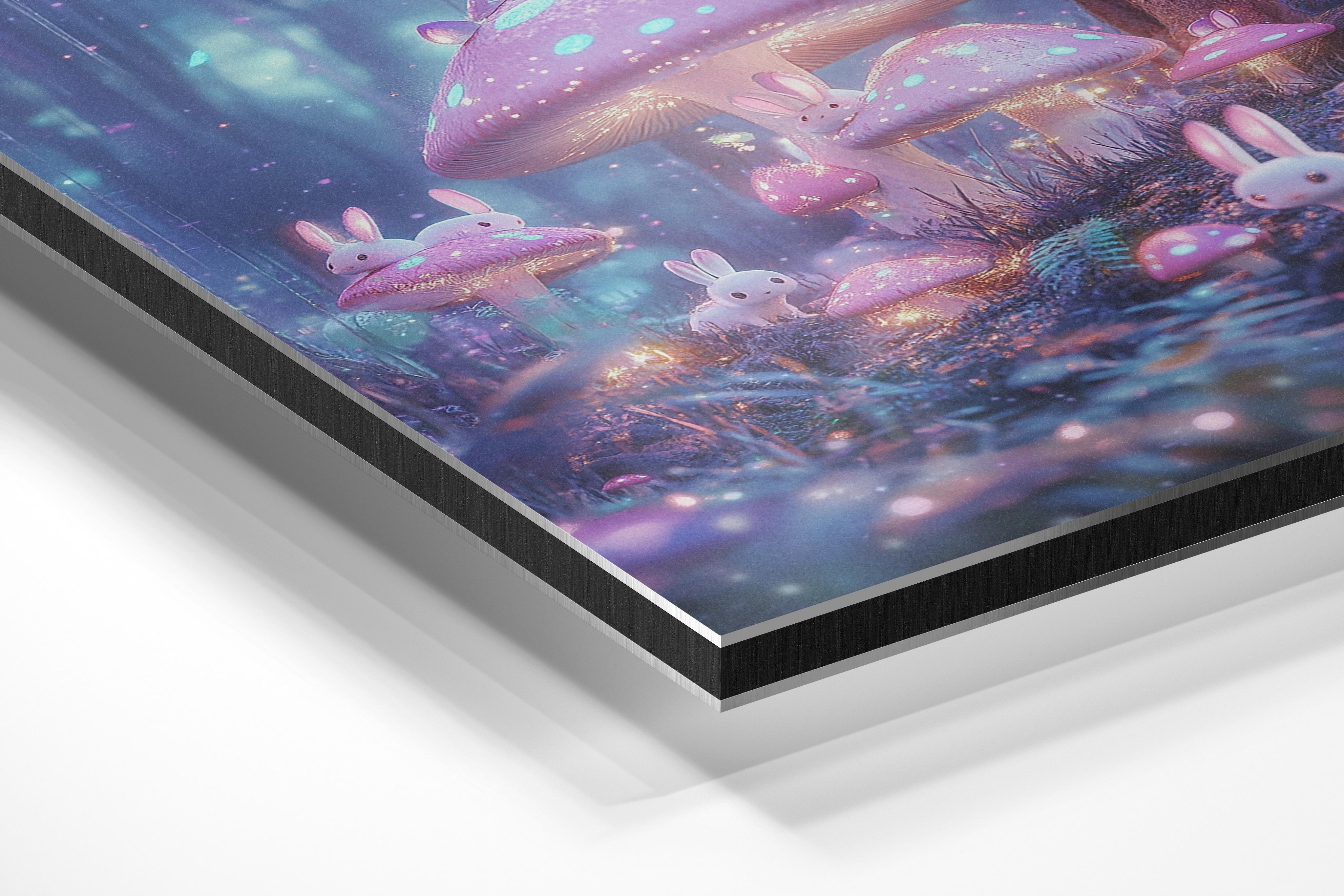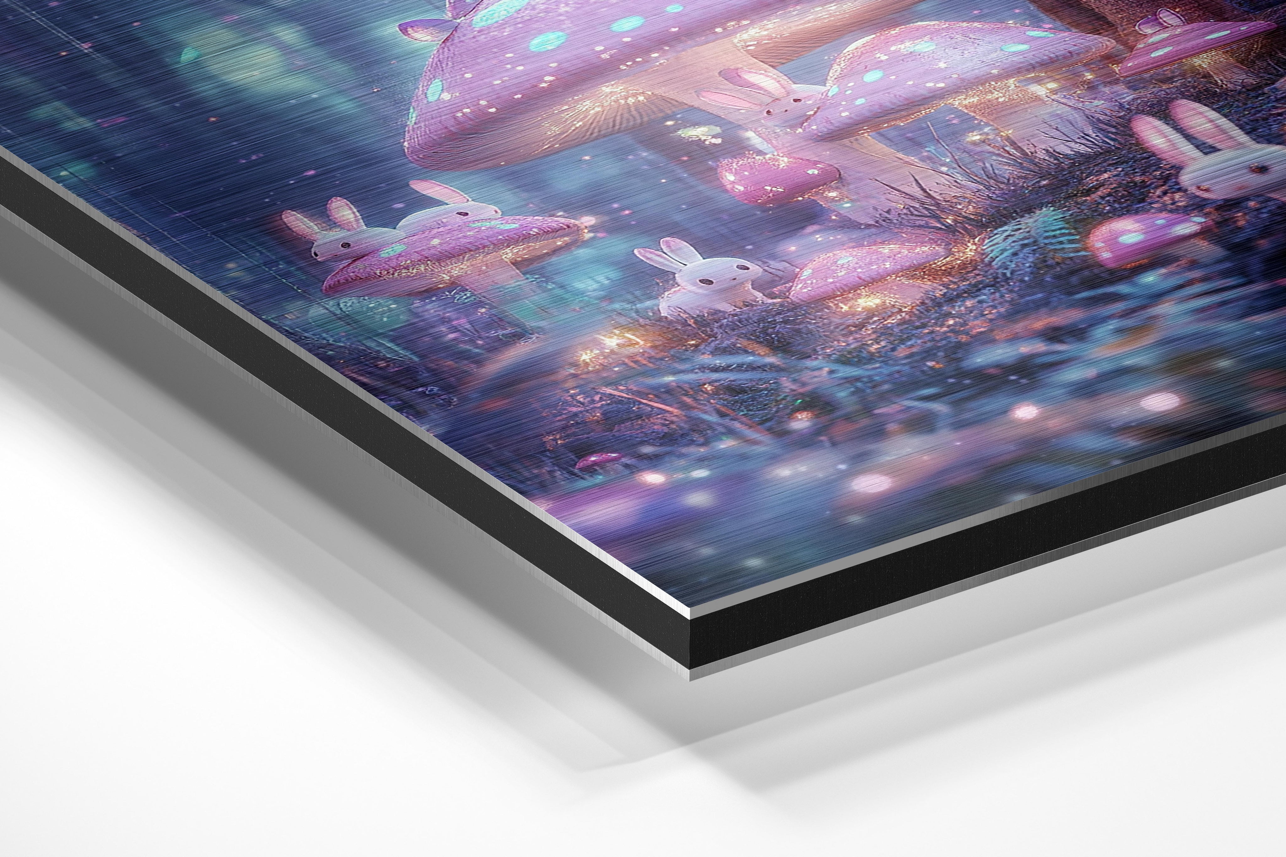 Step into a glowing forest where oversized mushrooms emit an enchanting light, casting a soft glow on the forest floor. This piece is further brought to life by the presence of adorable white bunnies, adding warmth and charm to the scene. The luminescent colors and whimsical composition evoke a sense of wonder, making it perfect for creating a serene and magical ambiance in children’s rooms or quiet corners where relaxation and imagination thrive.