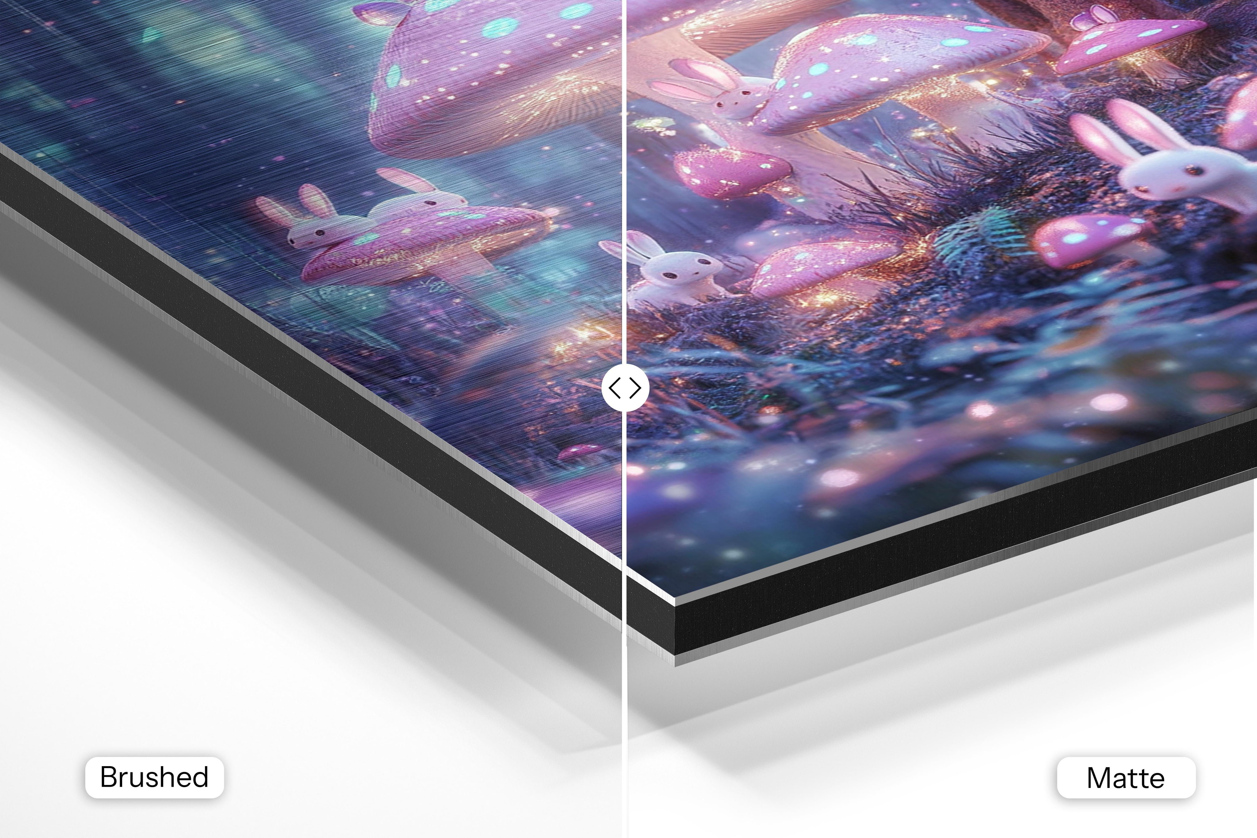 - Brushed Aluminum, on the other hand, features a raw metallic texture with visible brush strokes. Whites and highlights in your image let the silver surface show through, adding a dramatic, shimmering effect. Ideal for black-and-white images, minimalist designs, or abstract art, it creates a bold, industrial vibe with a modern edge.