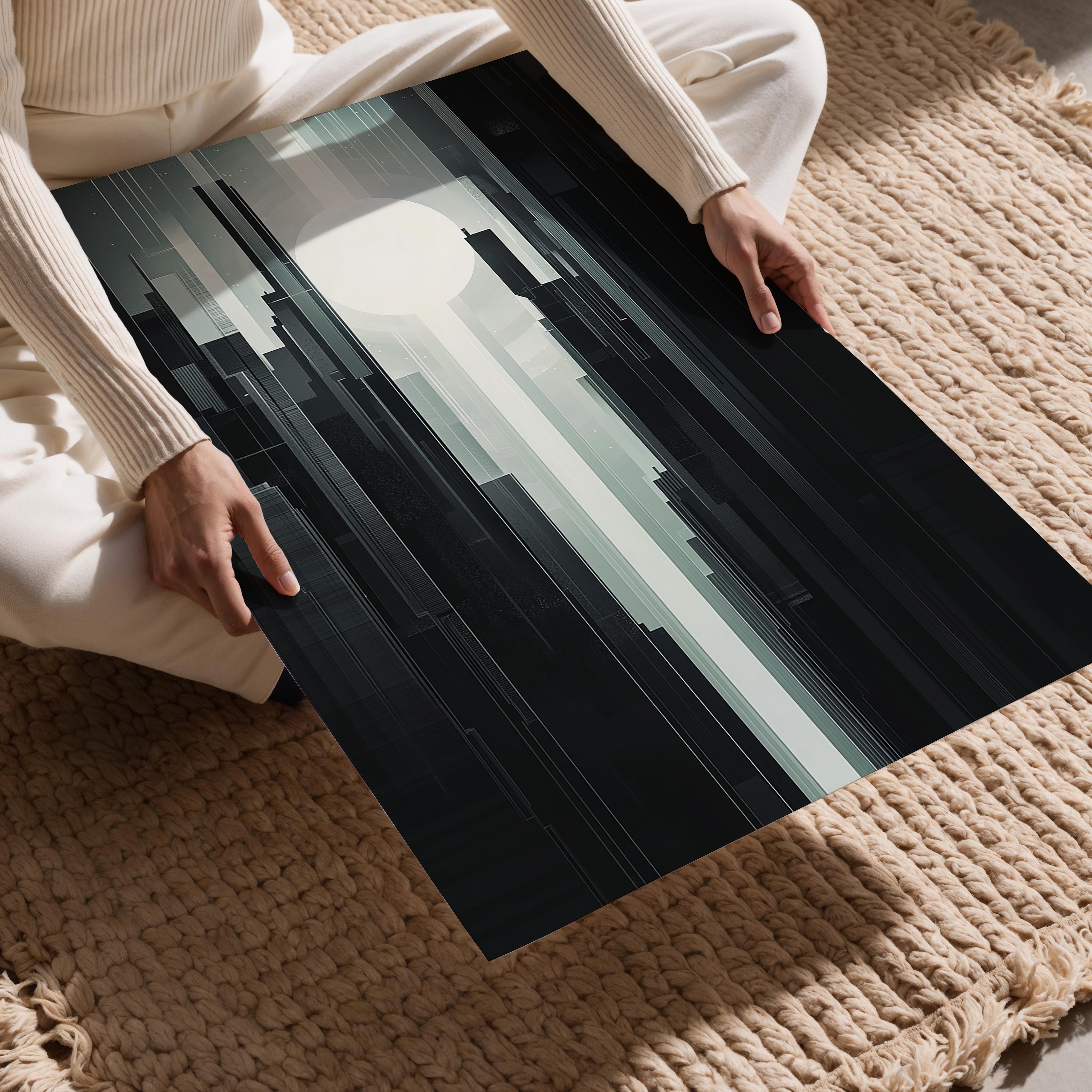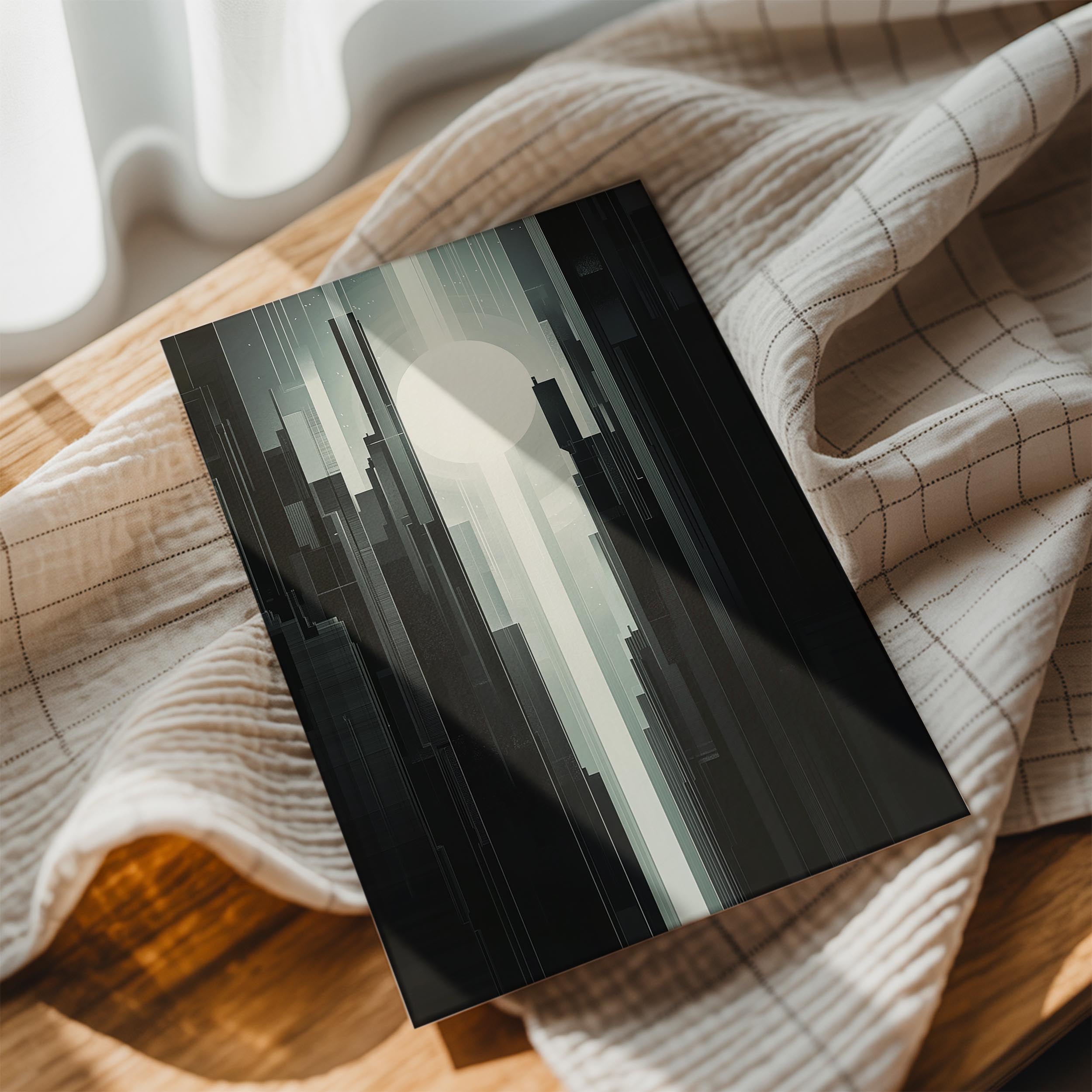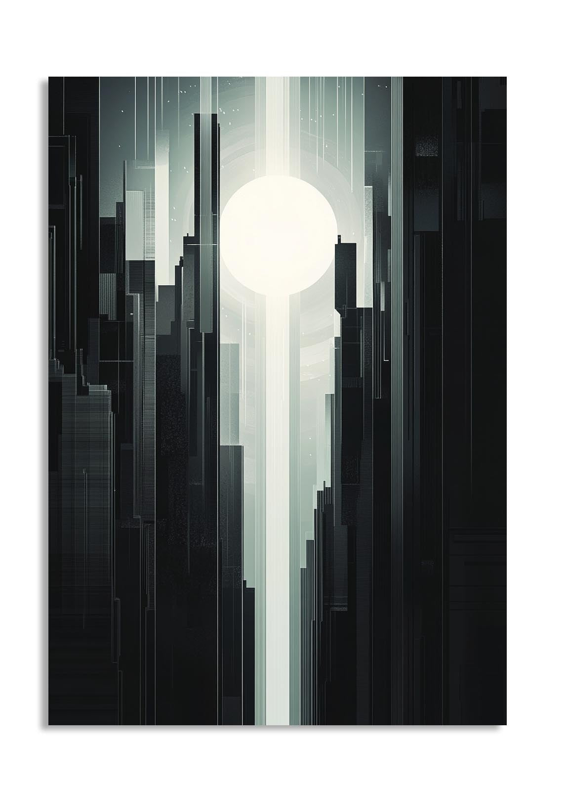 A mesmerizing depiction of a glowing central tower, surrounded by sharp geometric skyscrapers that reach toward the sky. The luminous white light emanating from the tower creates a dramatic focal point, symbolizing hope and progress. This artwork suits spaces with modern or futuristic decor, adding sophistication and intrigue. The minimalist color palette ensures it blends seamlessly into a variety of interiors, while the bold design captures the viewer's attention. It appeals to those who appreciate visionary architecture and urban landscapes reimagined with a sci-fi twist.