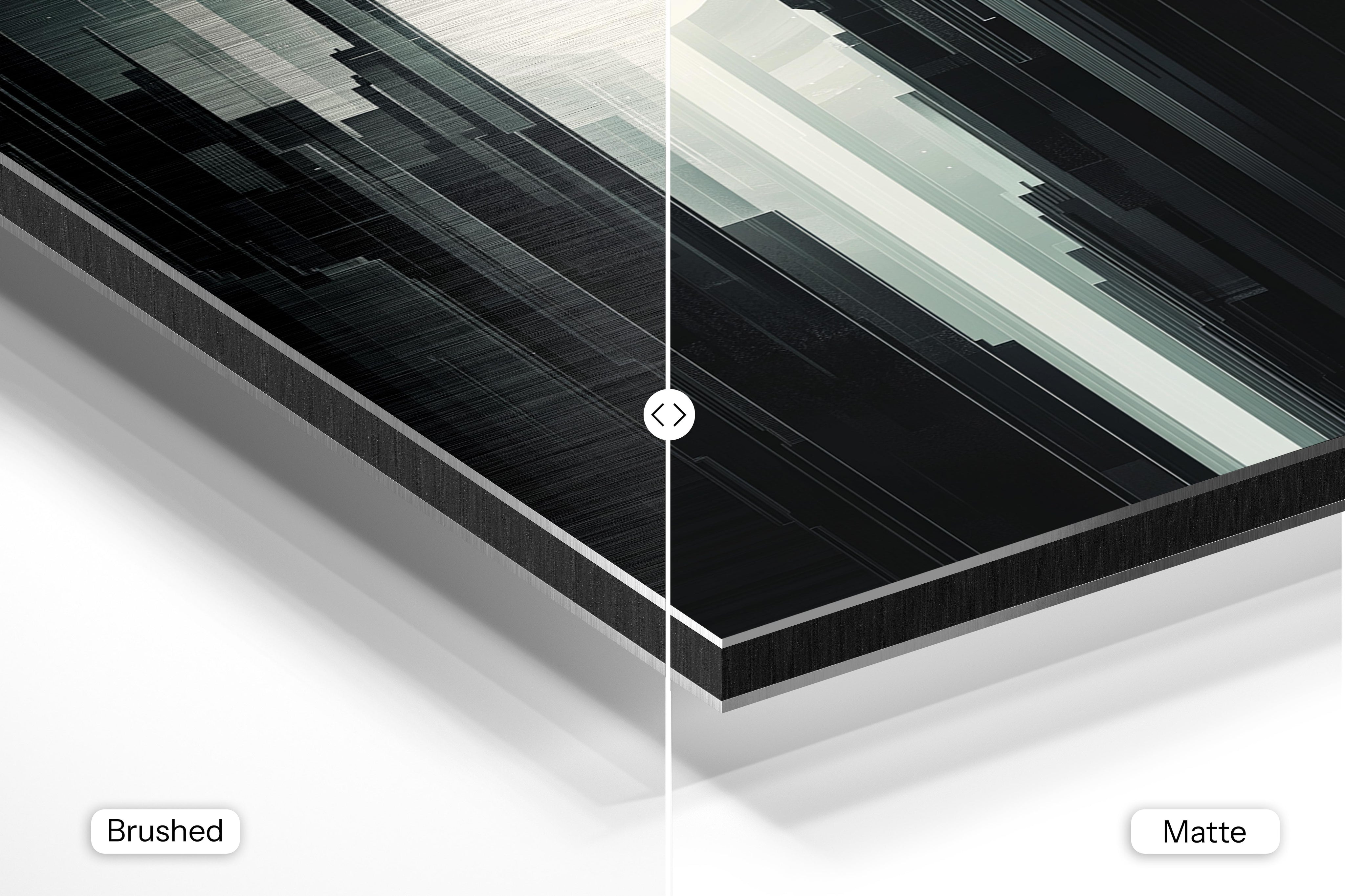 - Brushed Aluminum, on the other hand, features a raw metallic texture with visible brush strokes. Whites and highlights in your image let the silver surface show through, adding a dramatic, shimmering effect. Ideal for black-and-white images, minimalist designs, or abstract art, it creates a bold, industrial vibe with a modern edge.