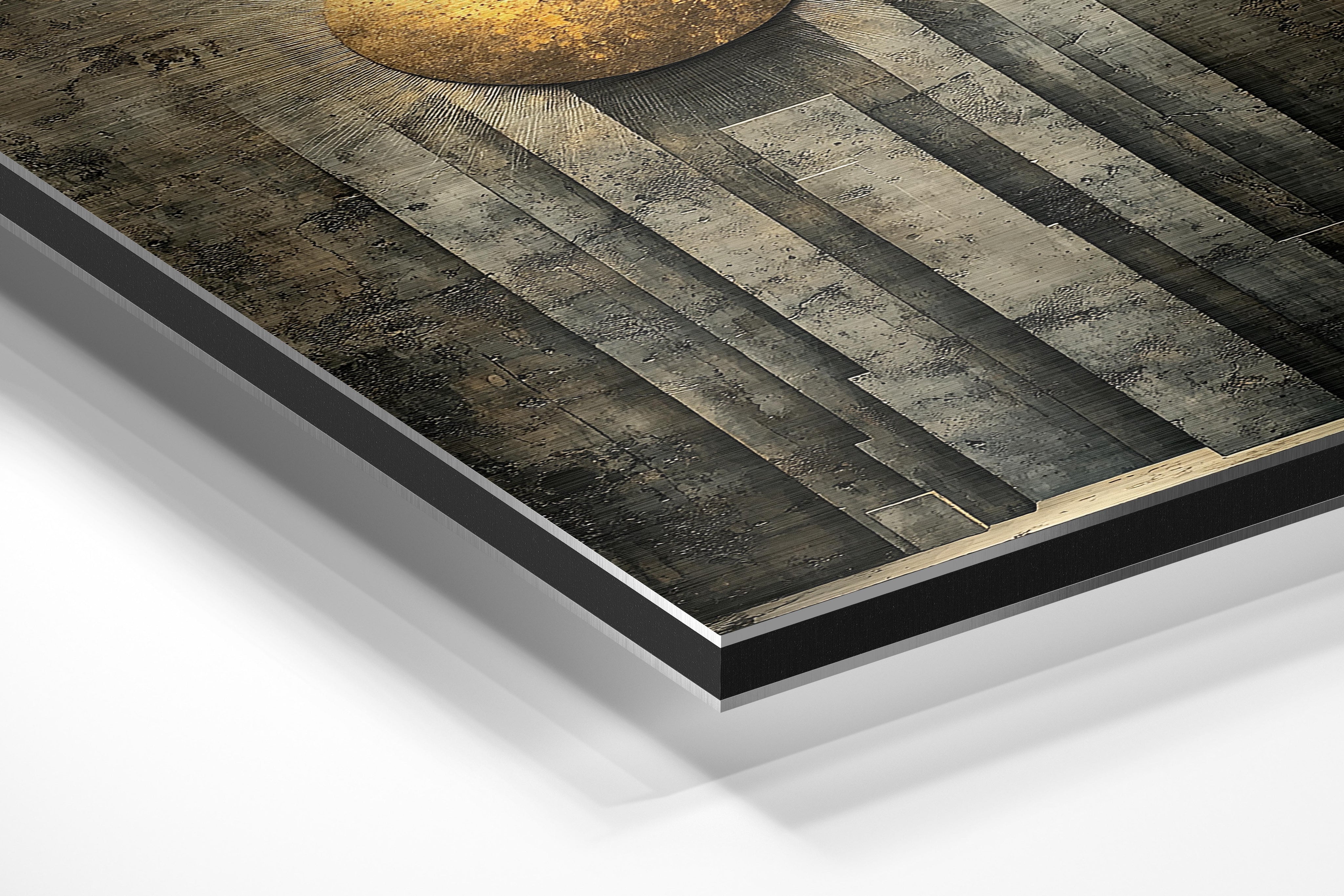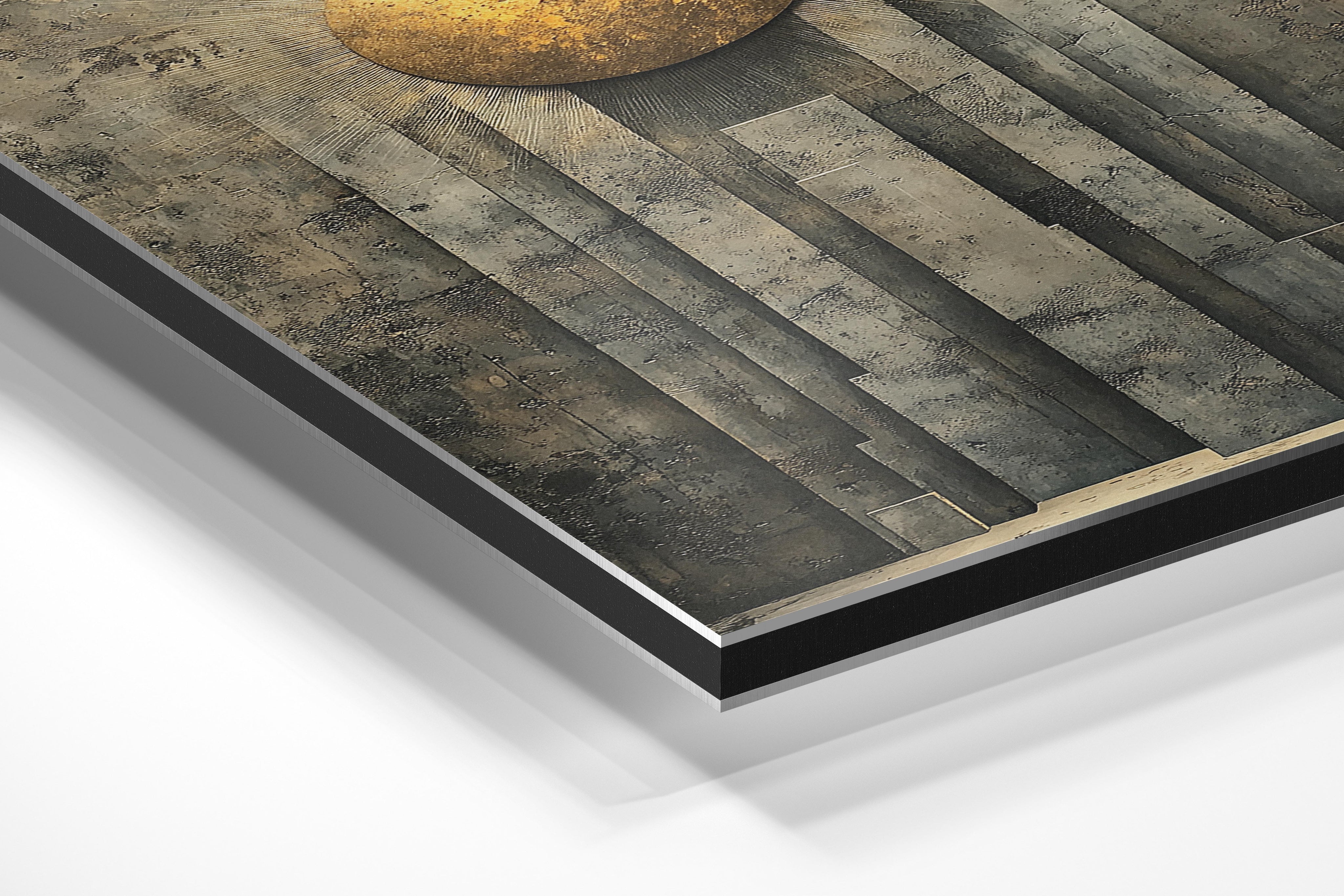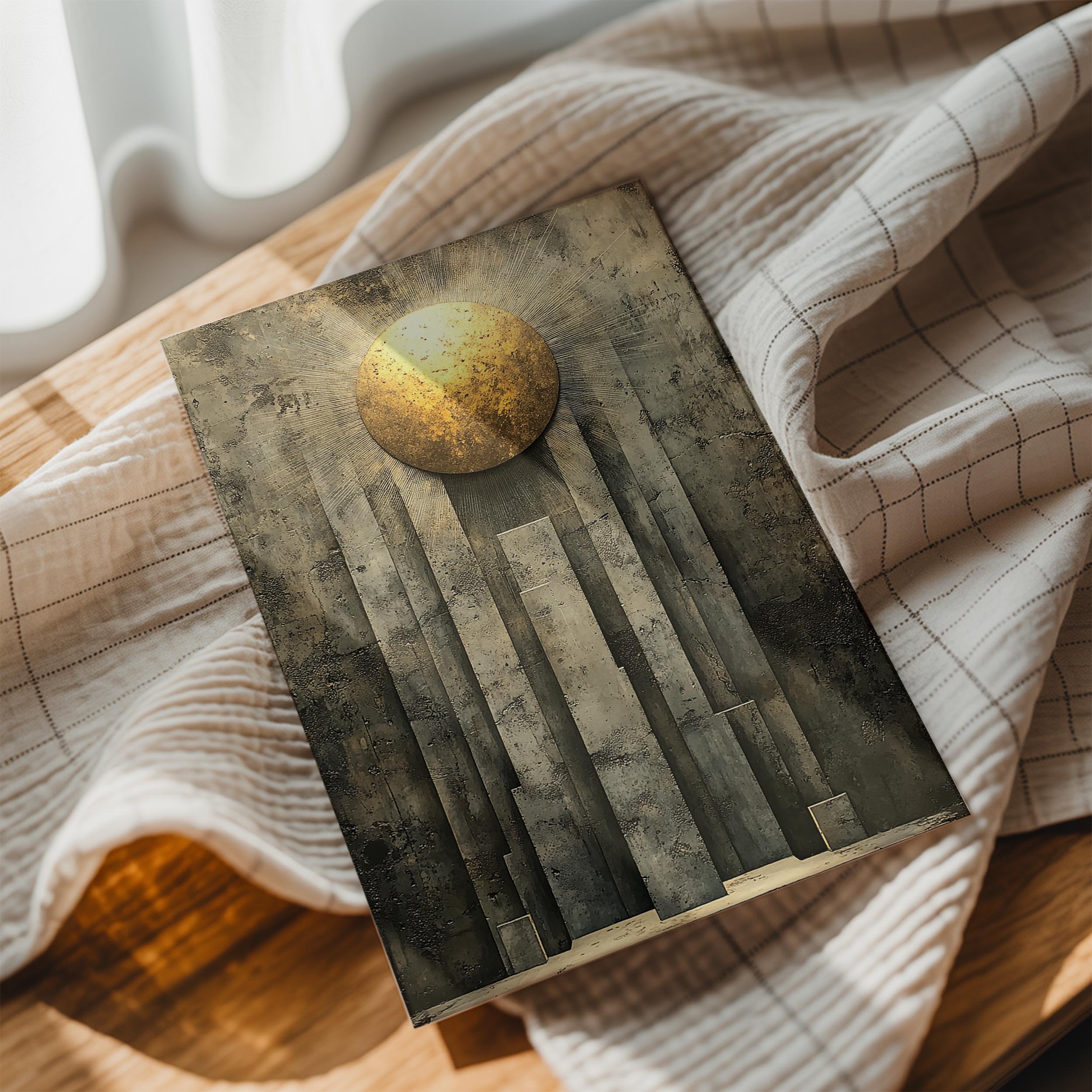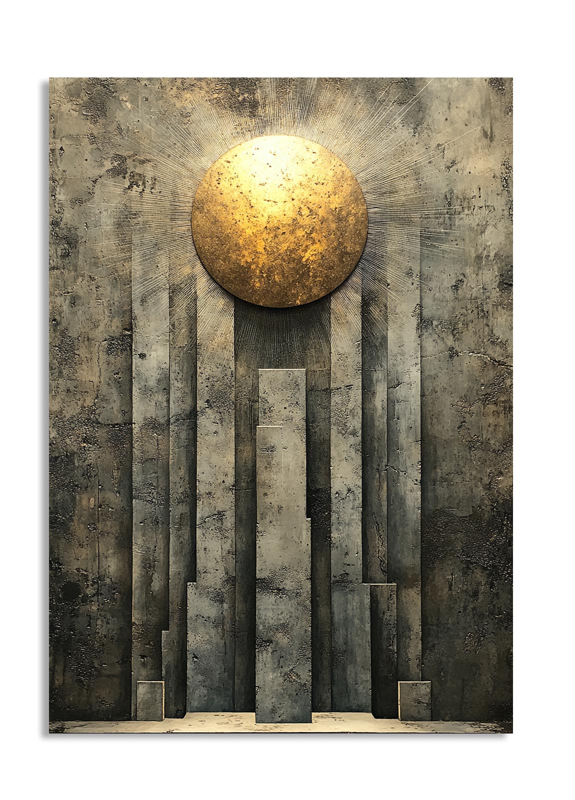 This powerful piece portrays a golden sun above vertical structures, symbolizing growth and ascension. The rich textures and muted tones highlight contrasts between light and shadow, creating a dramatic yet refined composition. This artwork is a striking addition to industrial or modern interiors, making a bold statement. Ideal for spaces that value symbolic and thought-provoking art, it transforms walls into showcases of creativity and elegance.