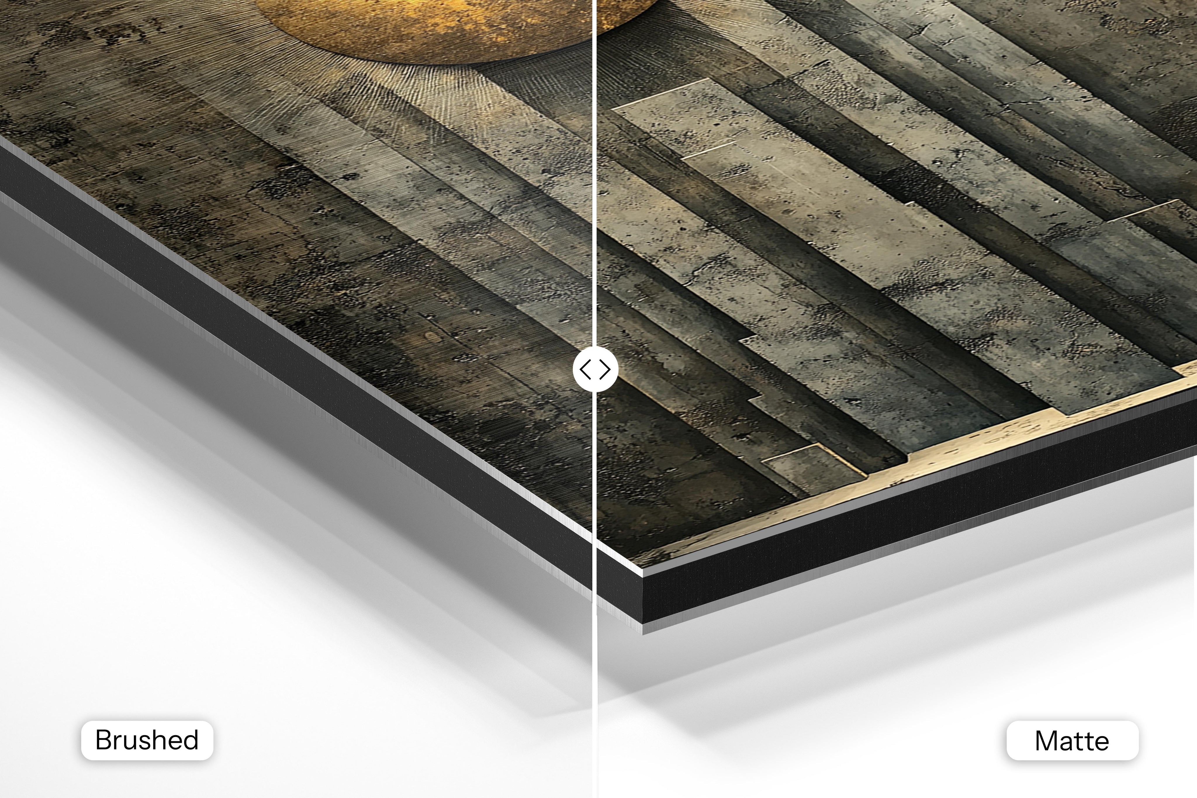- Brushed Aluminum, on the other hand, features a raw metallic texture with visible brush strokes. Whites and highlights in your image let the silver surface show through, adding a dramatic, shimmering effect. Ideal for black-and-white images, minimalist designs, or abstract art, it creates a bold, industrial vibe with a modern edge.