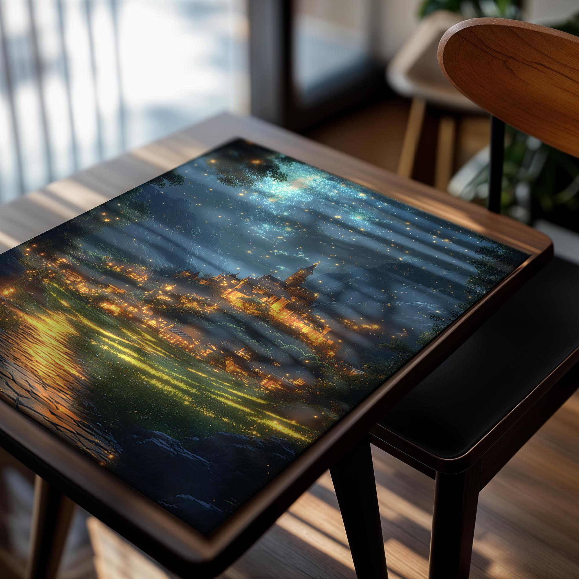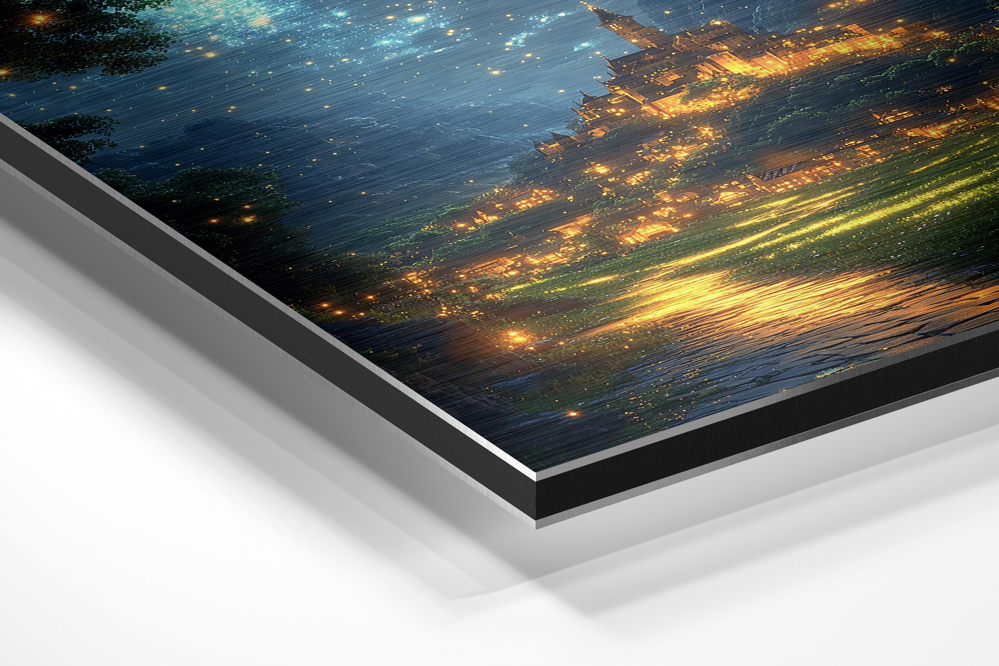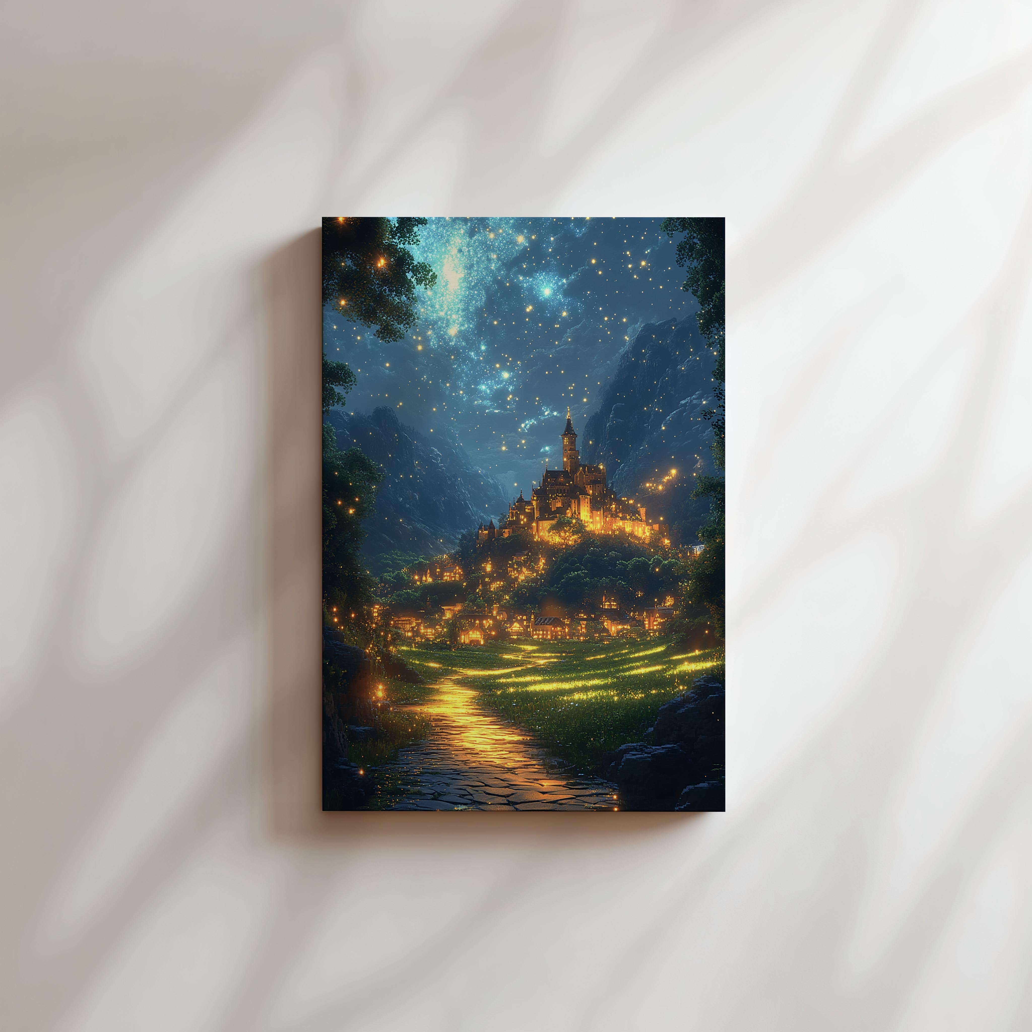 A majestic castle shines like a beacon under a breathtaking starry sky in this mesmerizing image. Surrounded by misty mountains and golden-lit cottages, the scene glows with warmth and mystery. The cobblestone path leading to the castle draws the viewer into a dreamlike world. The sky brims with shimmering stars and glowing clouds, evoking wonder and nostalgia. Perfect for fantasy lovers or as a centerpiece in a living room, this artwork encapsulates the magic of storytelling.