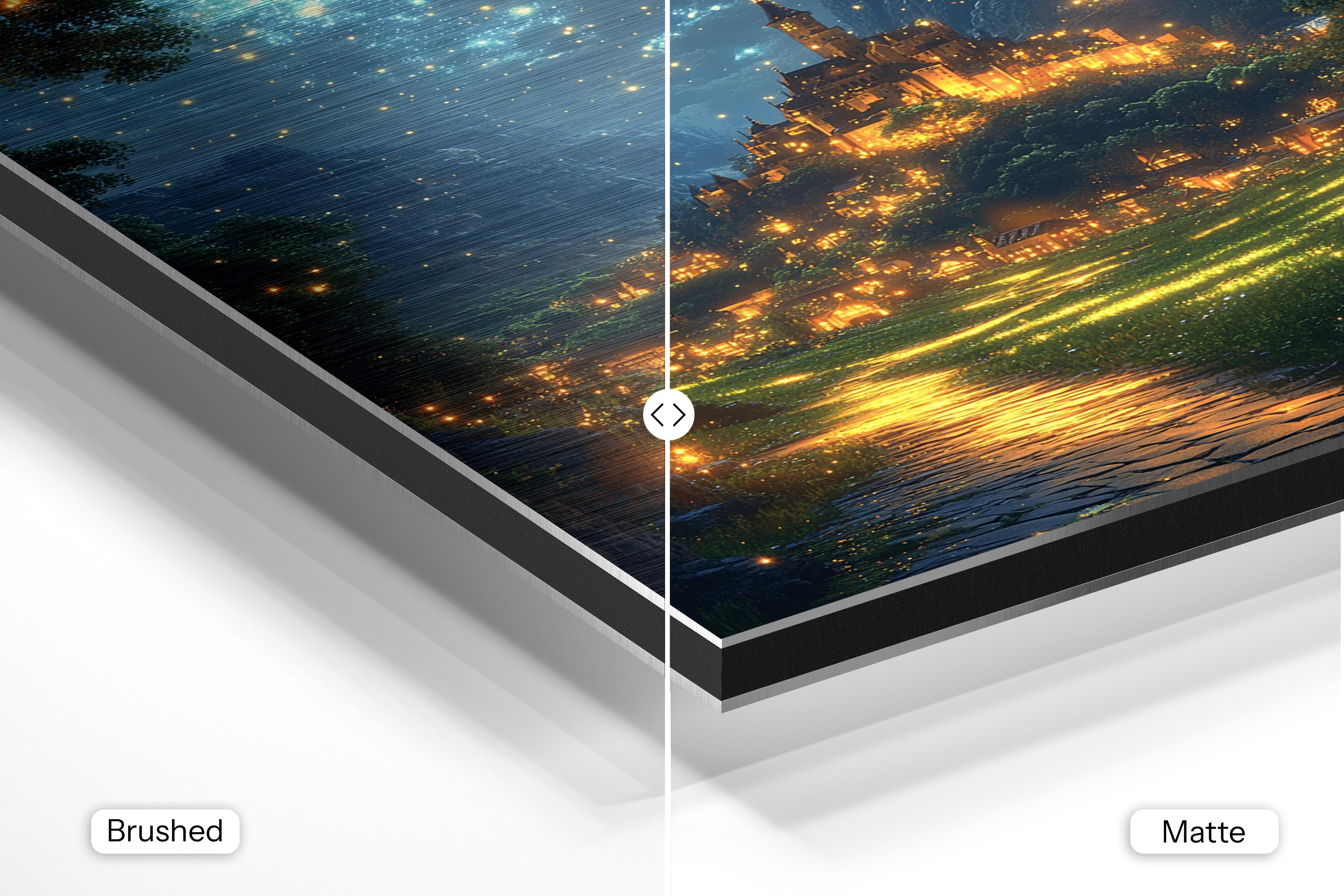 - Brushed Aluminum, on the other hand, features a raw metallic texture with visible brush strokes. Whites and highlights in your image let the silver surface show through, adding a dramatic, shimmering effect. Ideal for black-and-white images, minimalist designs, or abstract art, it creates a bold, industrial vibe with a modern edge.