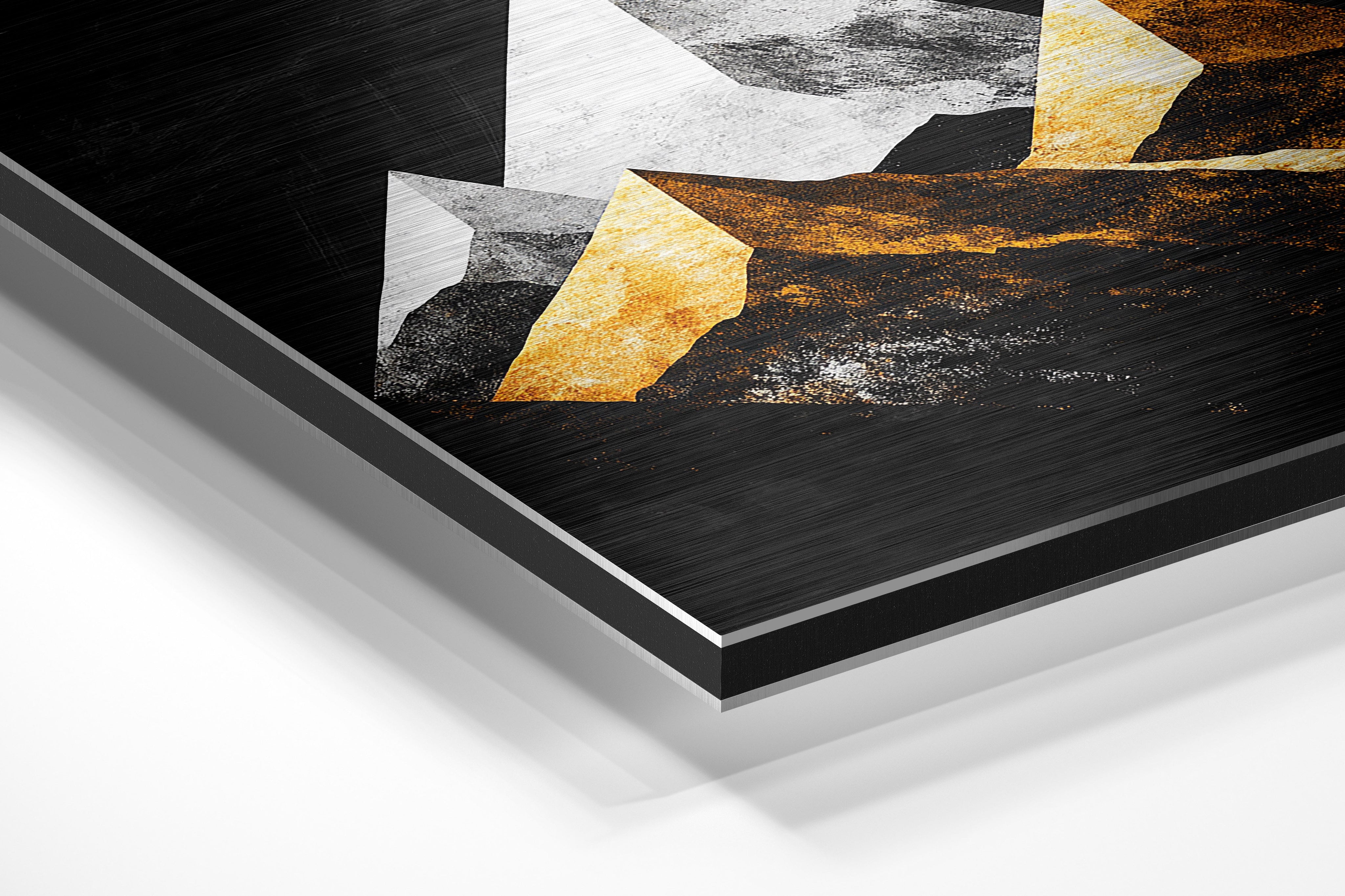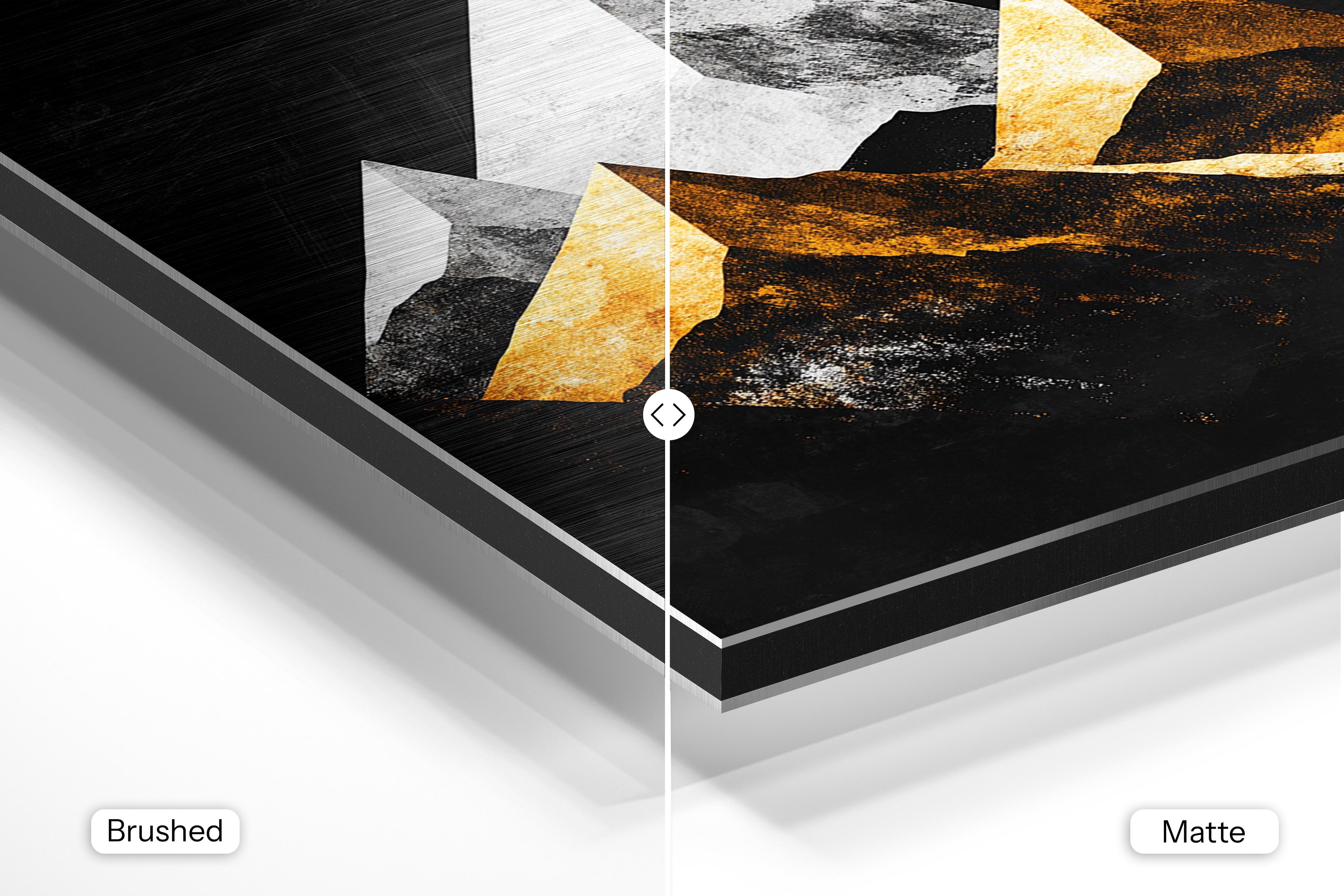 - Brushed Aluminum, on the other hand, features a raw metallic texture with visible brush strokes. Whites and highlights in your image let the silver surface show through, adding a dramatic, shimmering effect. Ideal for black-and-white images, minimalist designs, or abstract art, it creates a bold, industrial vibe with a modern edge.