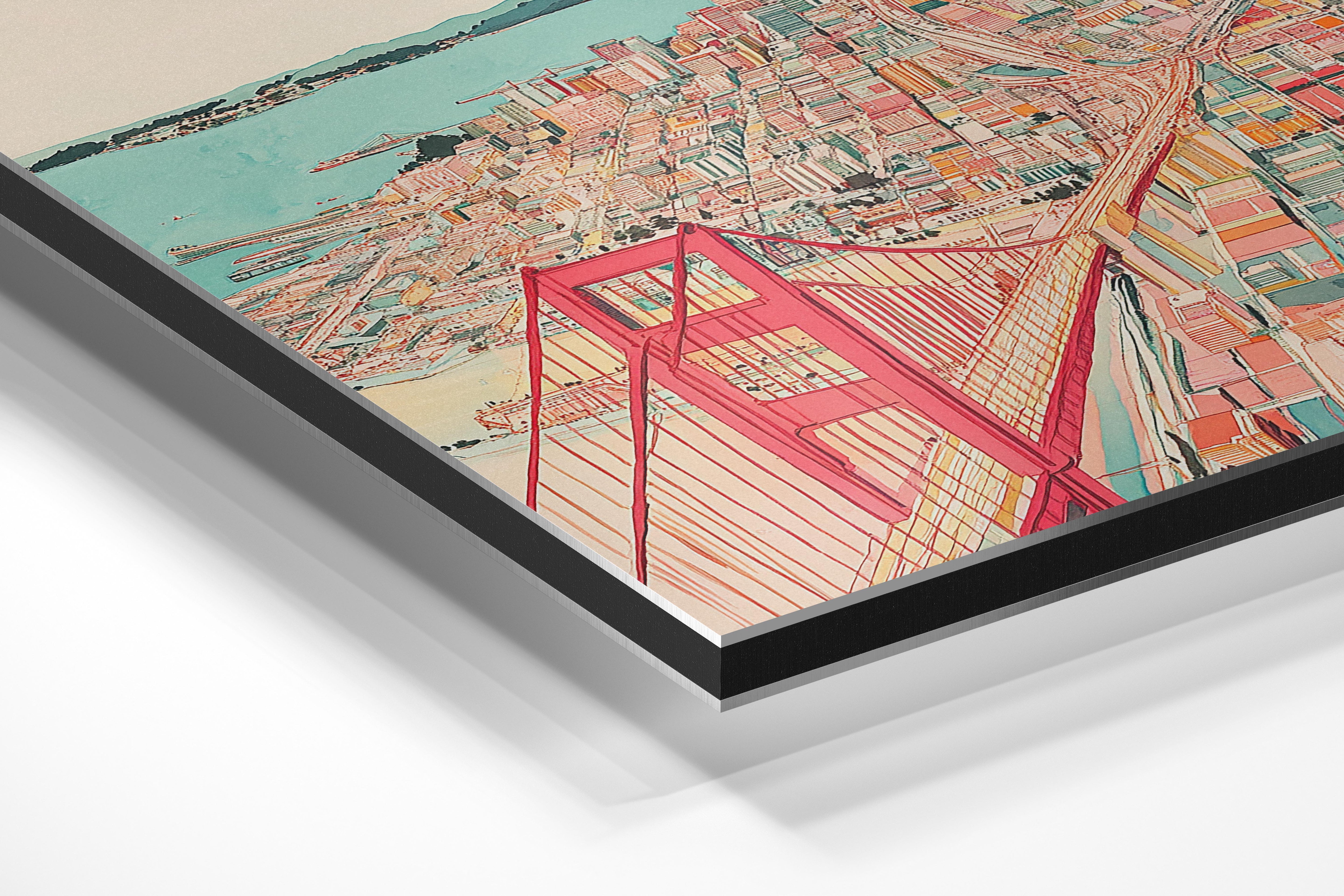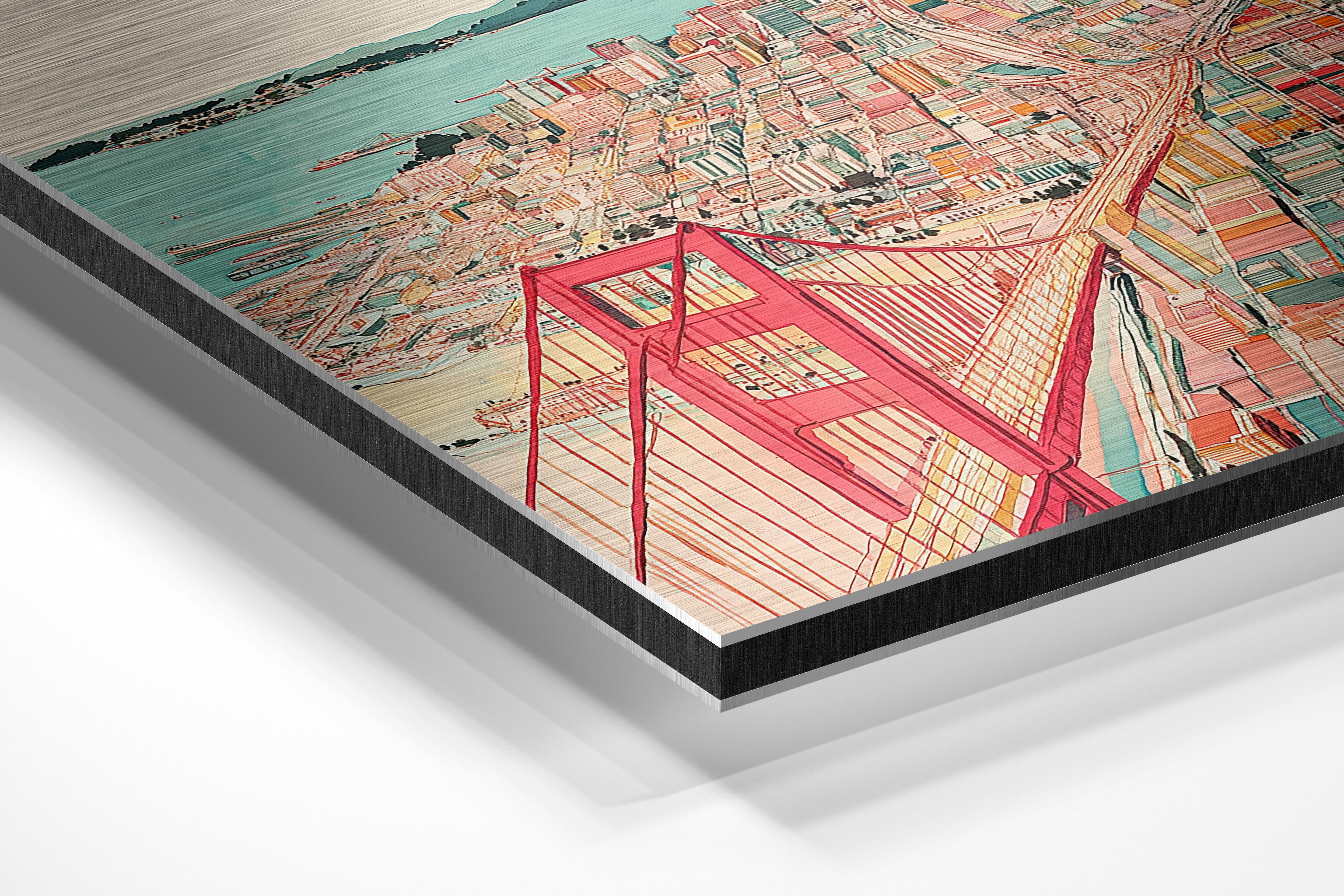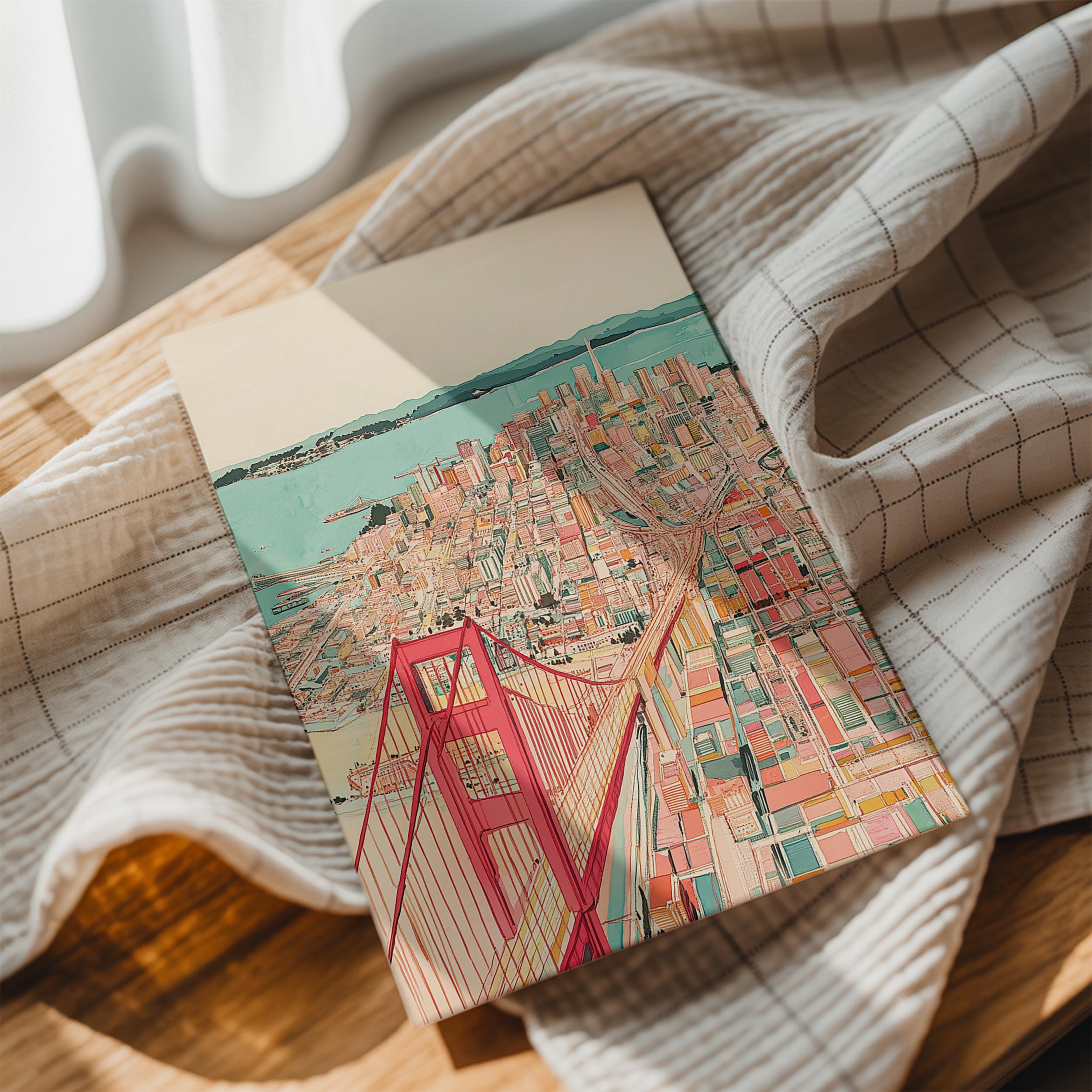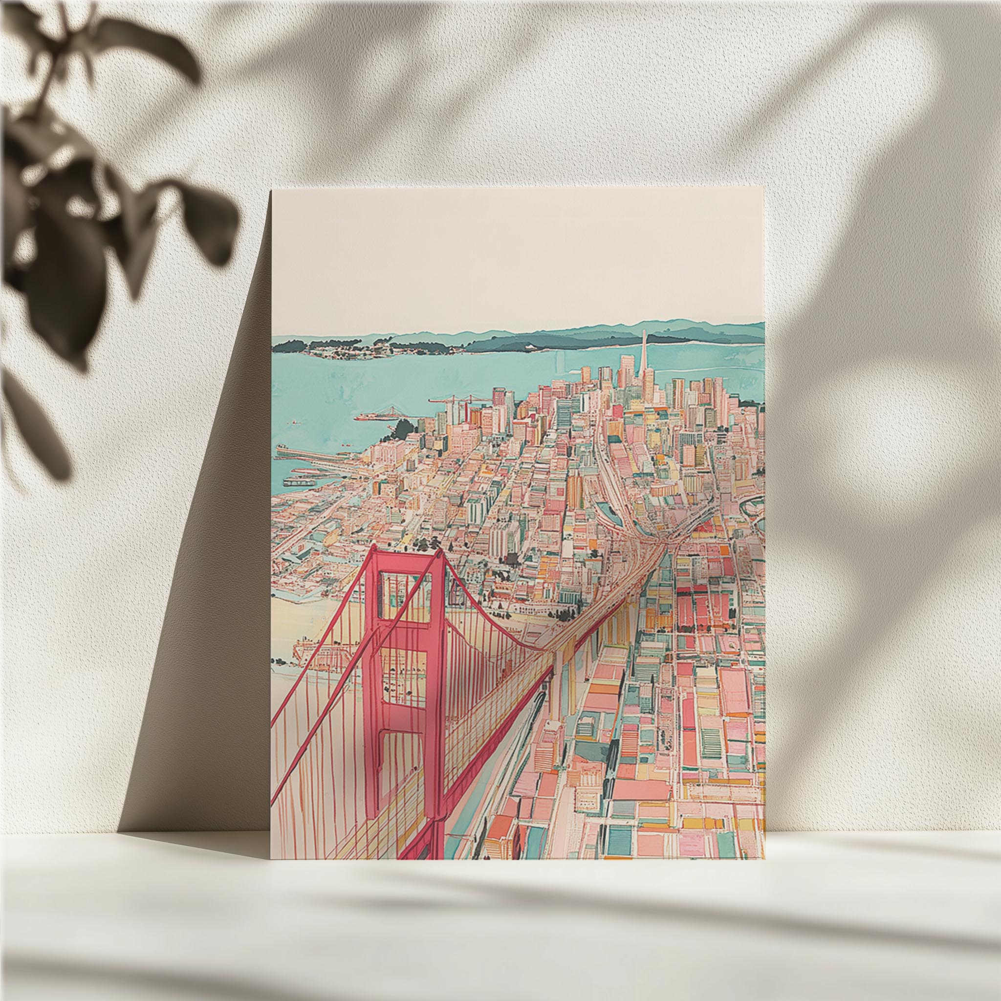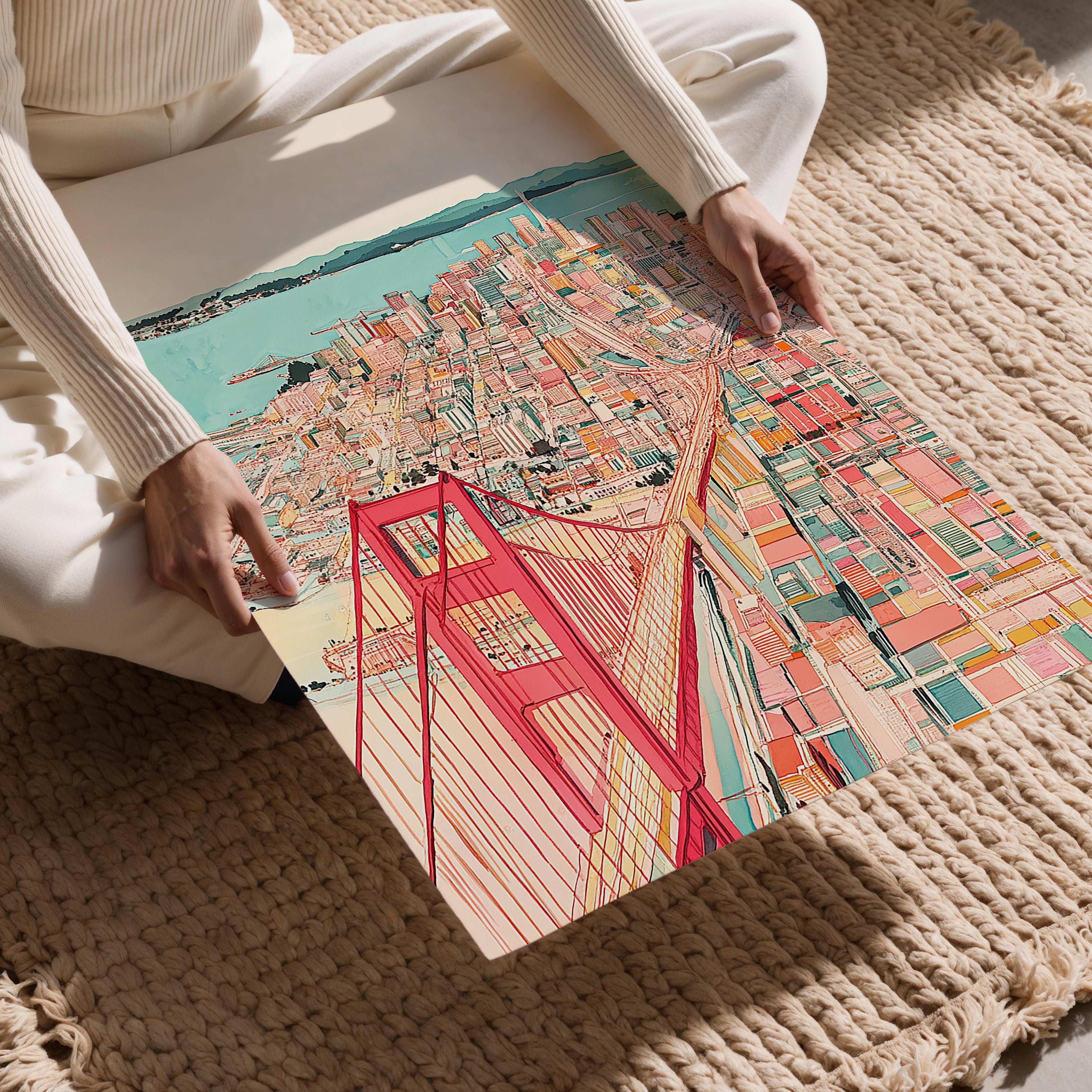 A colorful and artistic aerial perspective of San Francisco’s iconic Golden Gate Bridge and its surrounding cityscape. The pastel hues and detailed patterns lend it a vibrant, playful charm. This artwork is perfect for urban enthusiasts or spaces that celebrate creativity and architectural beauty. Its lively design brings energy and warmth to any room, making it ideal for living spaces or studios.
