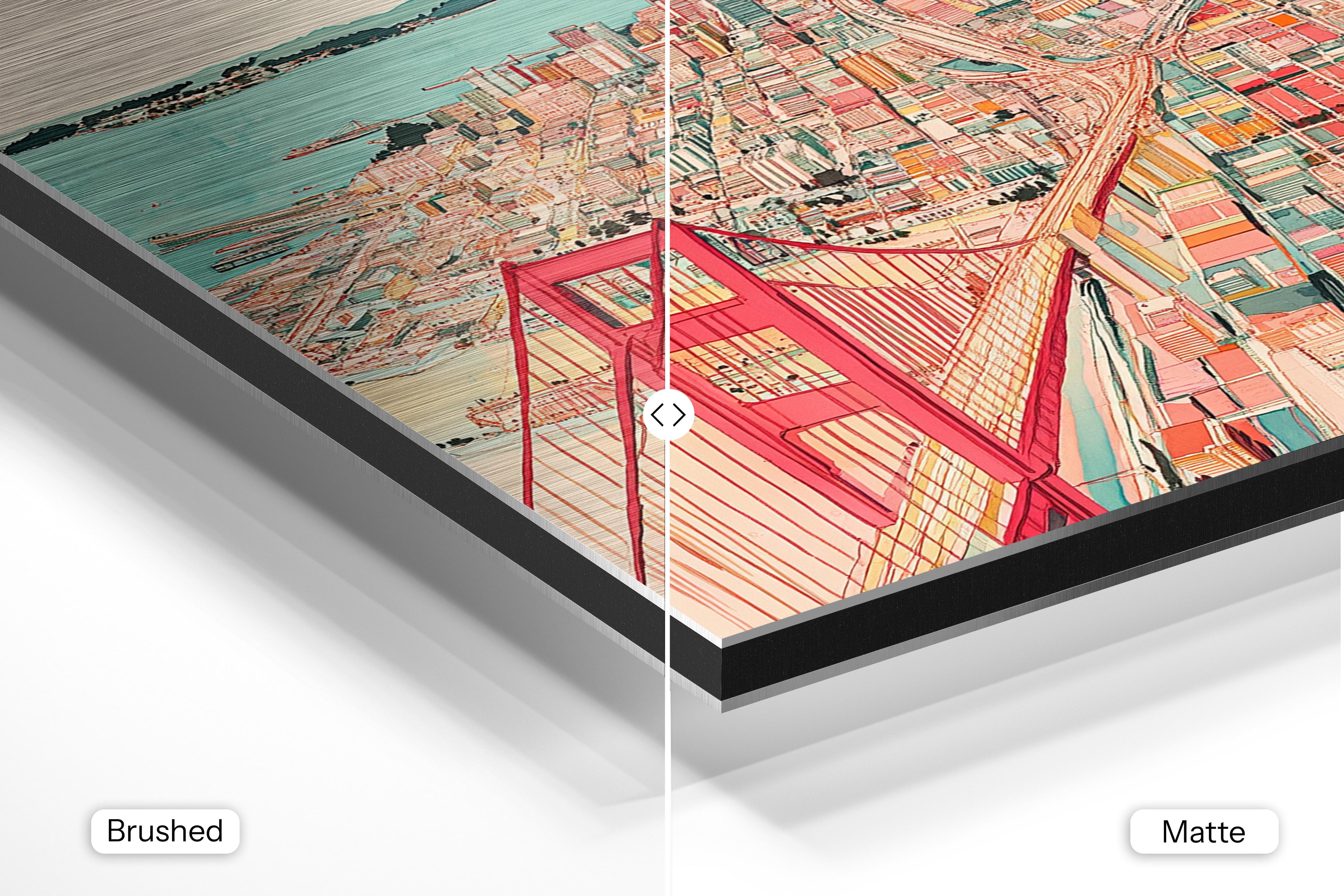 - Matte Aluminum offers a smooth, bright white surface that delivers crisp details and vibrant, true-to-life colors. With its non-reflective finish and subtle silky sheen, it’s perfect for photography, portraits, and colorful artwork—bringing a clean, polished look to any interior.