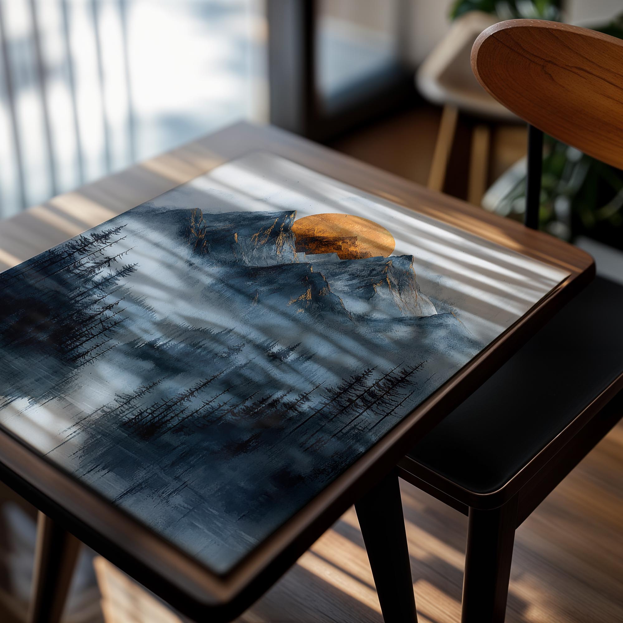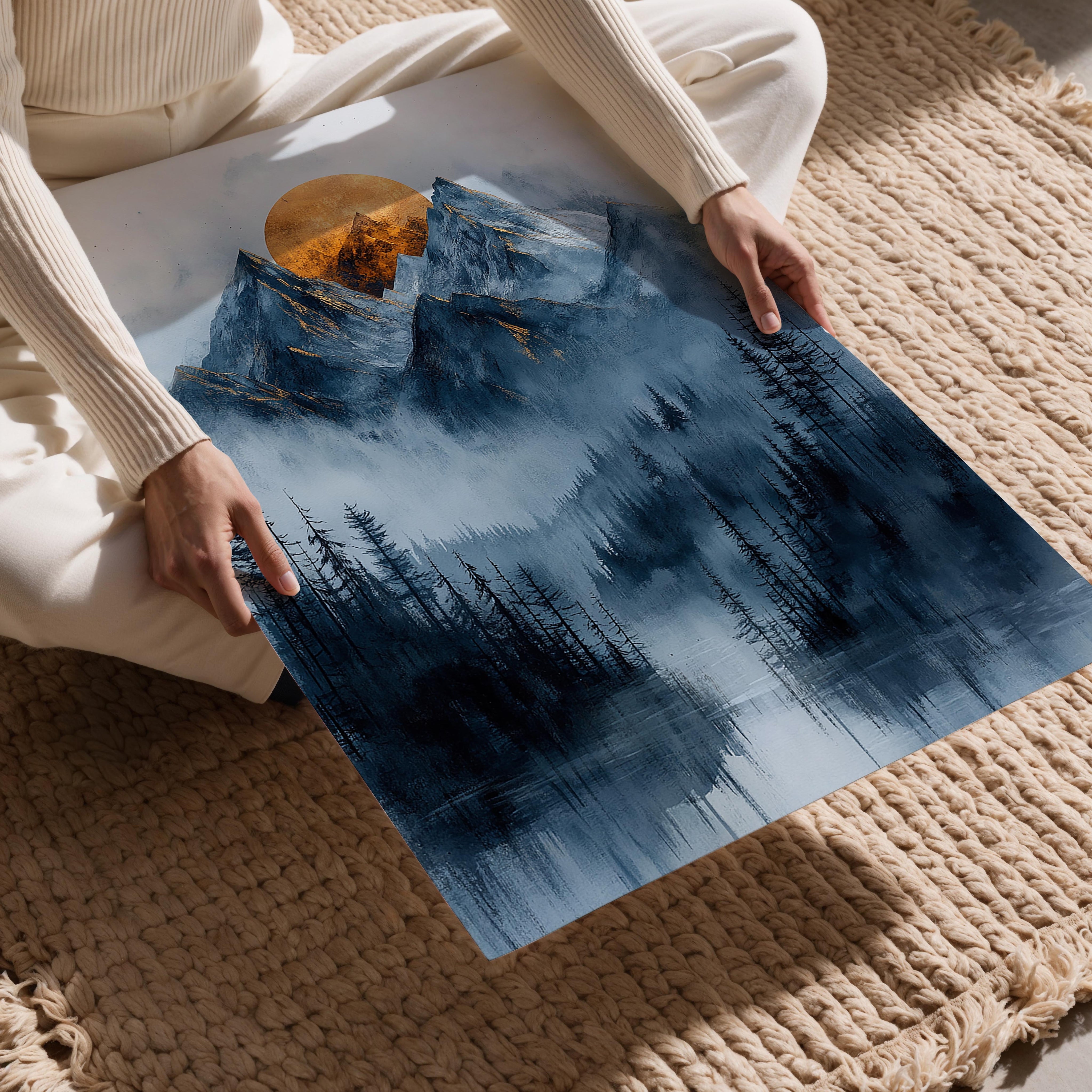 An ethereal composition of towering peaks illuminated by a soft golden sun. The blending of warm golden tones and misty blues creates an atmosphere of mystery and inspiration. Ideal for modern or rustic decor styles, this piece offers a sense of adventure and serenity, making it a stunning addition to living rooms or creative spaces.