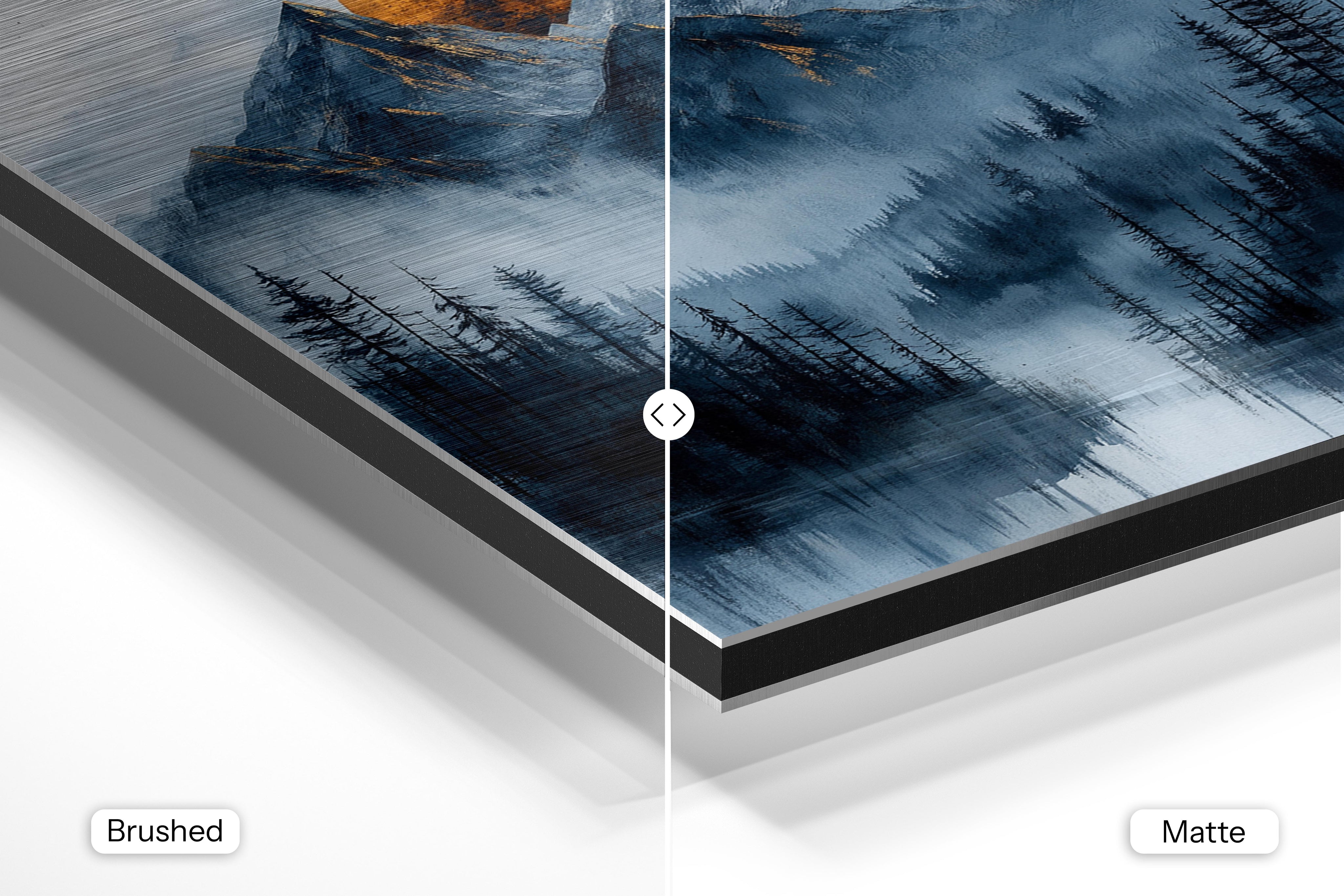 - Brushed Aluminum, on the other hand, features a raw metallic texture with visible brush strokes. Whites and highlights in your image let the silver surface show through, adding a dramatic, shimmering effect. Ideal for black-and-white images, minimalist designs, or abstract art, it creates a bold, industrial vibe with a modern edge.