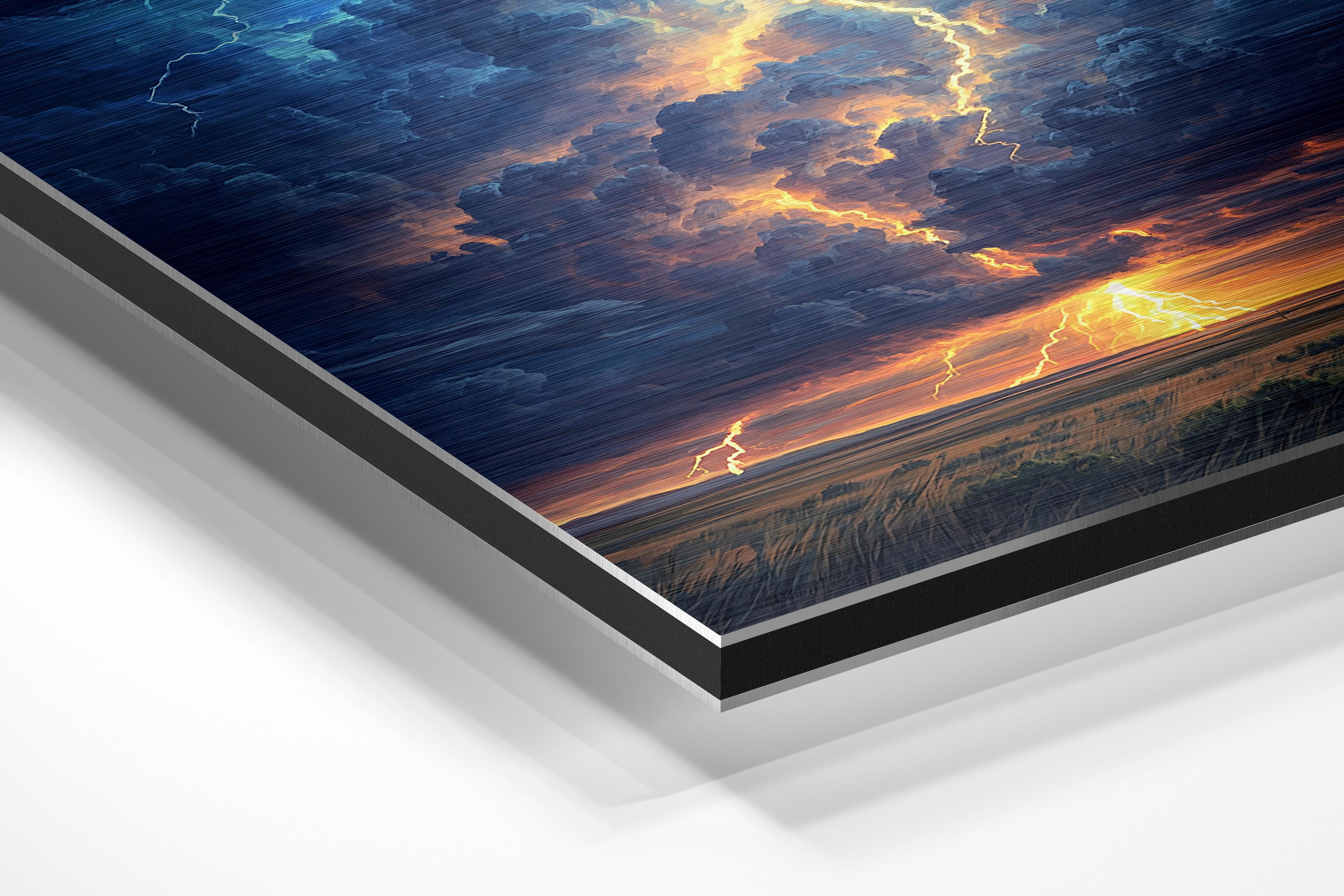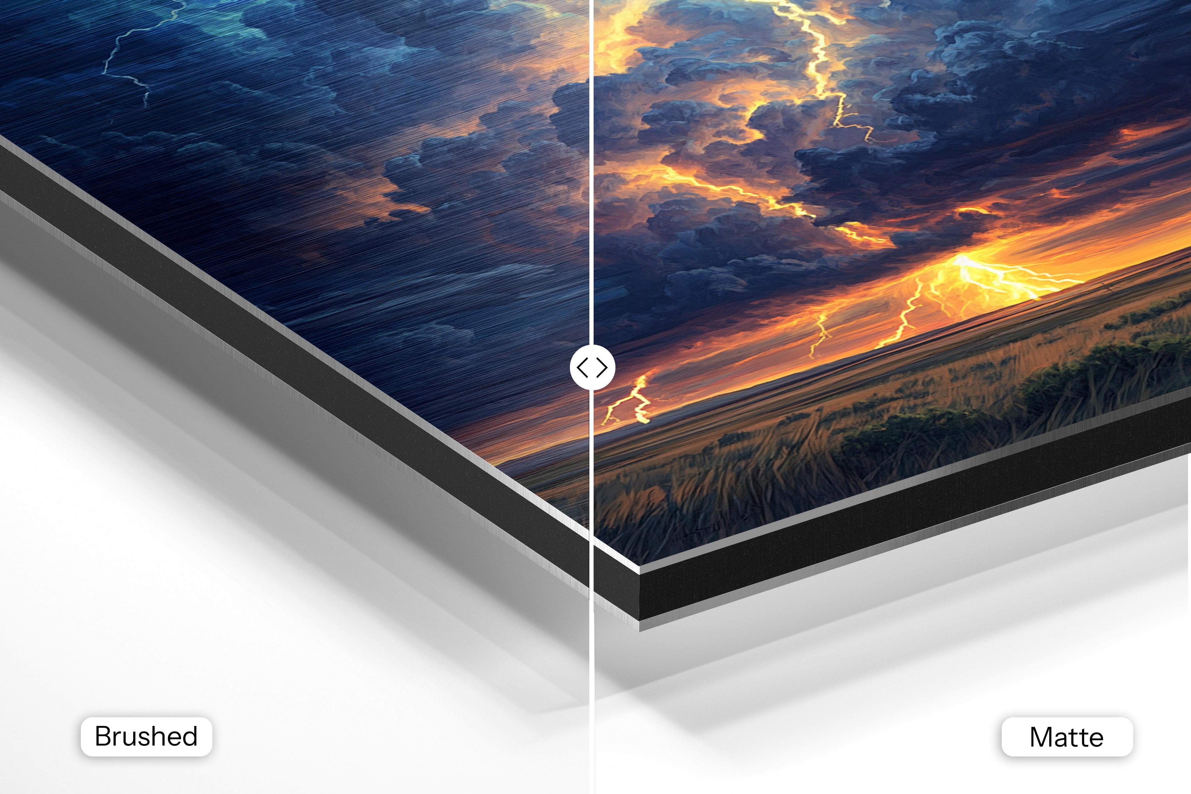 - Brushed Aluminum, on the other hand, features a raw metallic texture with visible brush strokes. Whites and highlights in your image let the silver surface show through, adding a dramatic, shimmering effect. Ideal for black-and-white images, minimalist designs, or abstract art, it creates a bold, industrial vibe with a modern edge.