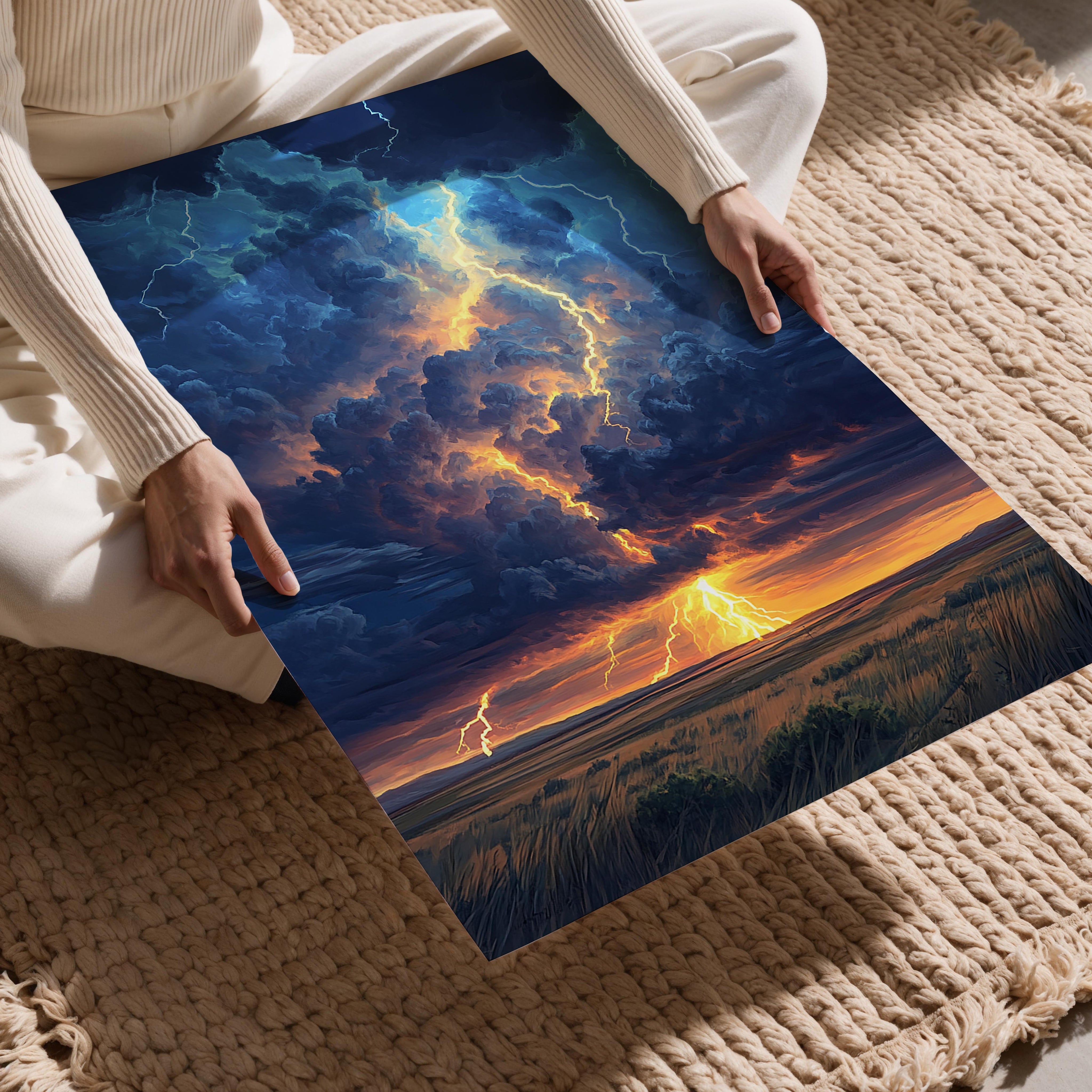 Golden lightning illuminates the expansive sky, blending warmth and power in one mesmerizing scene. The illuminated landscape beneath reflects the vibrant glow, creating an extraordinary moment of connection between sky and earth. This image speaks to the magnificence of nature’s lighting phenomena and provides a glimpse into the incredible artistry present in natural displays. The depth and colors make it truly captivating.