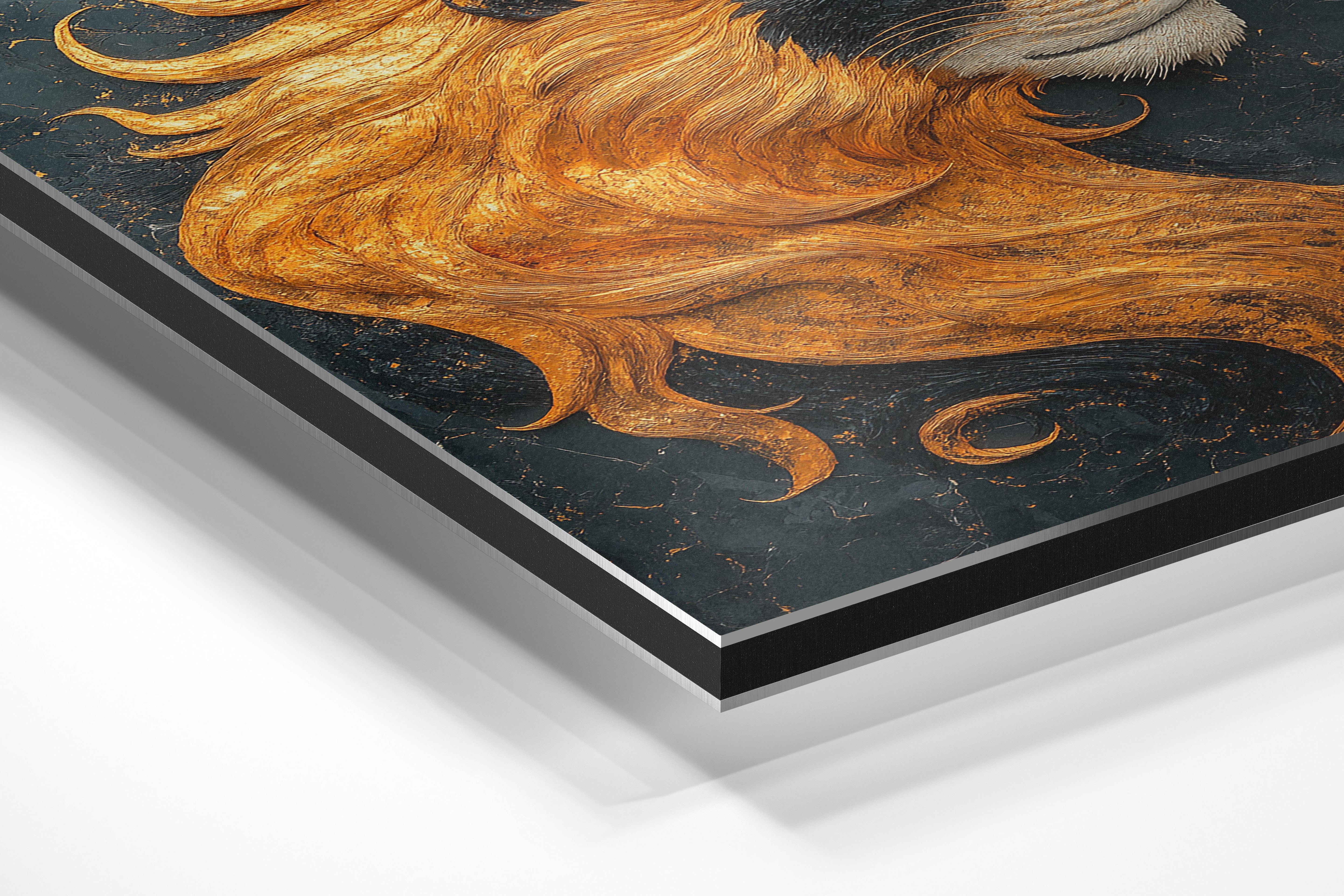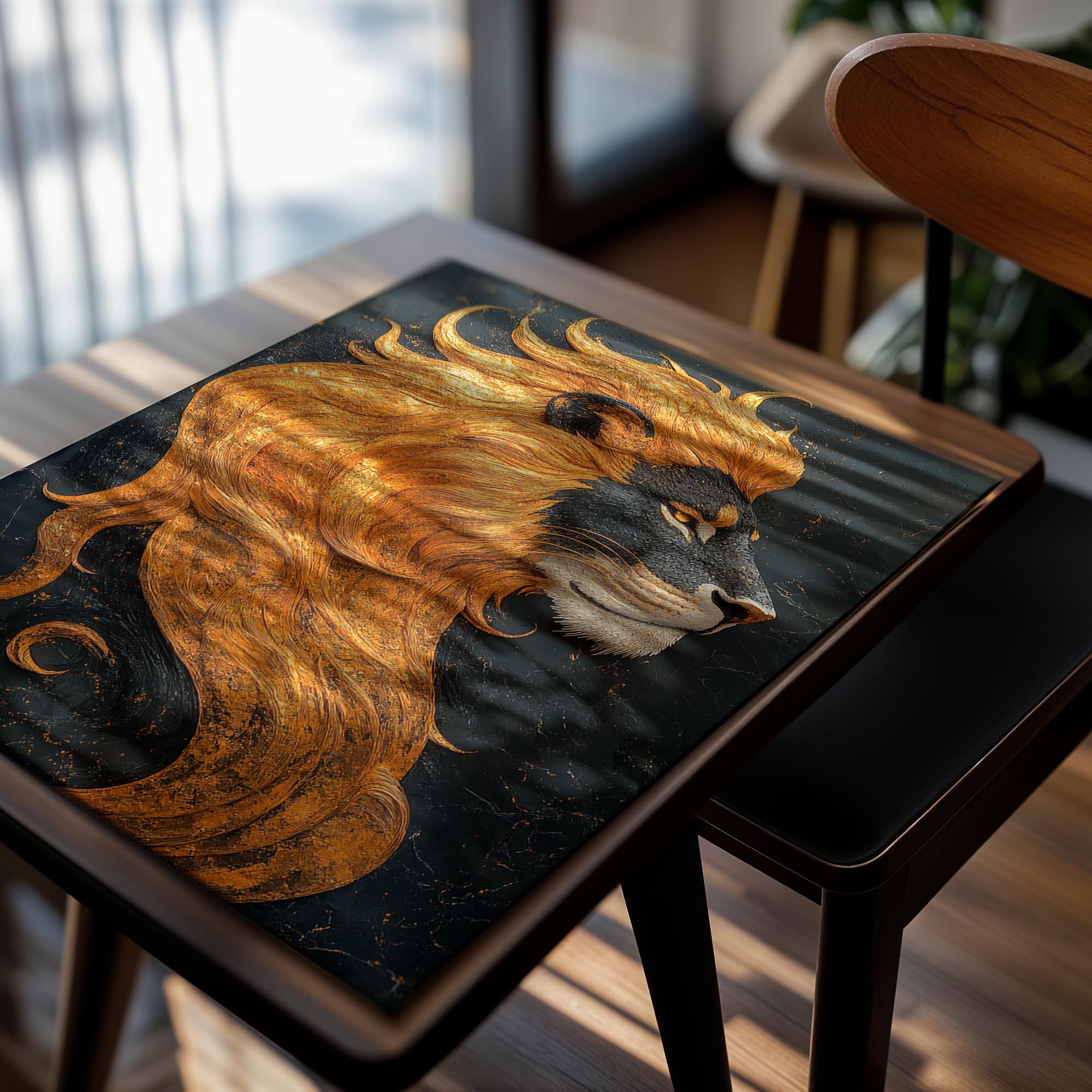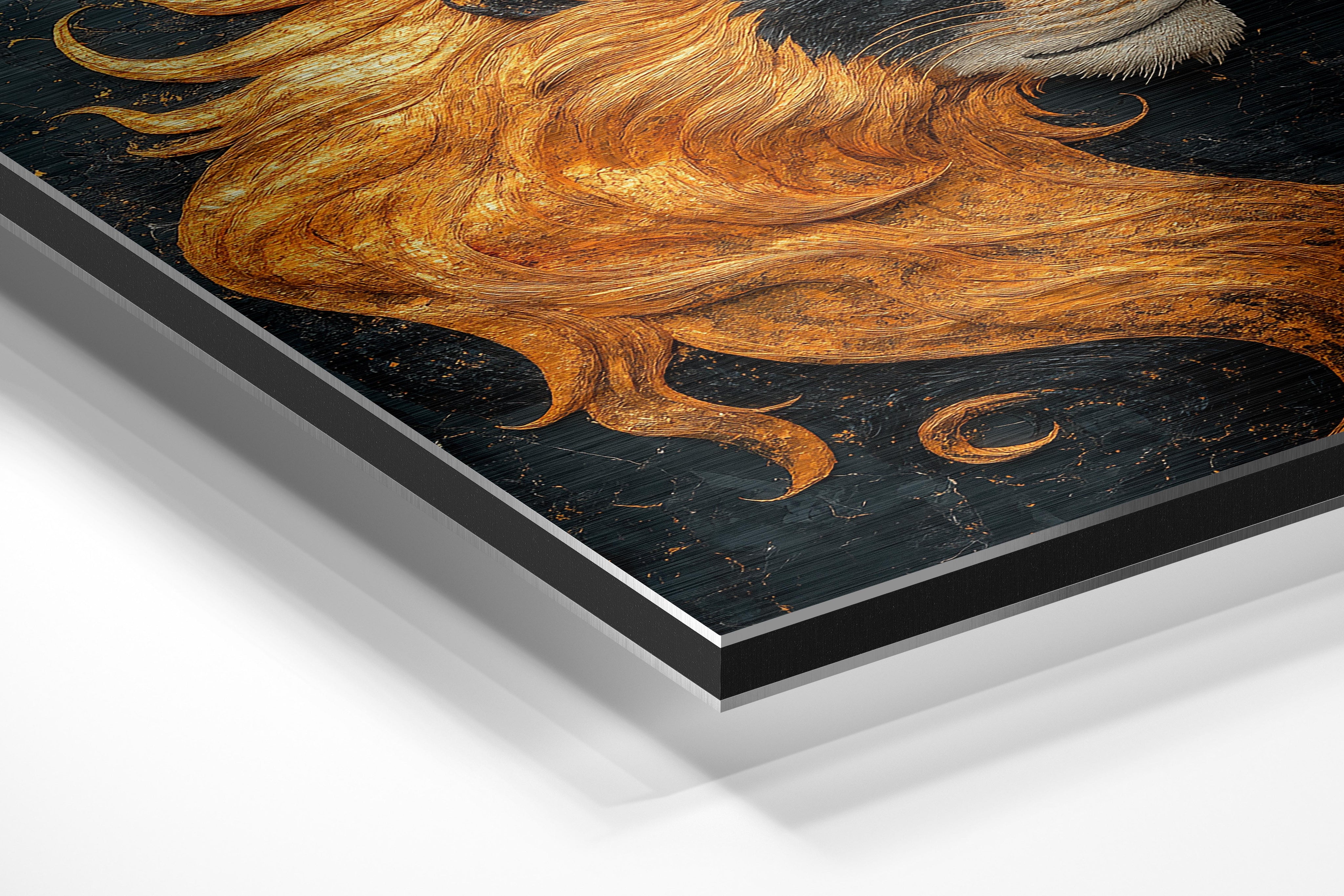 This luxurious artwork presents a lion’s head with an extravagant, golden mane flowing like waves of fire. The rich texture and meticulous details in the mane create an almost sculptural effect, making the lion appear regal and powerful. The dark background adds depth, allowing the golden tones to shine brilliantly. A perfect piece for grand interiors, luxury decor, or anyone who appreciates bold, dramatic art. It conveys strength, royalty, and artistic mastery, making it an unforgettable statement piece.