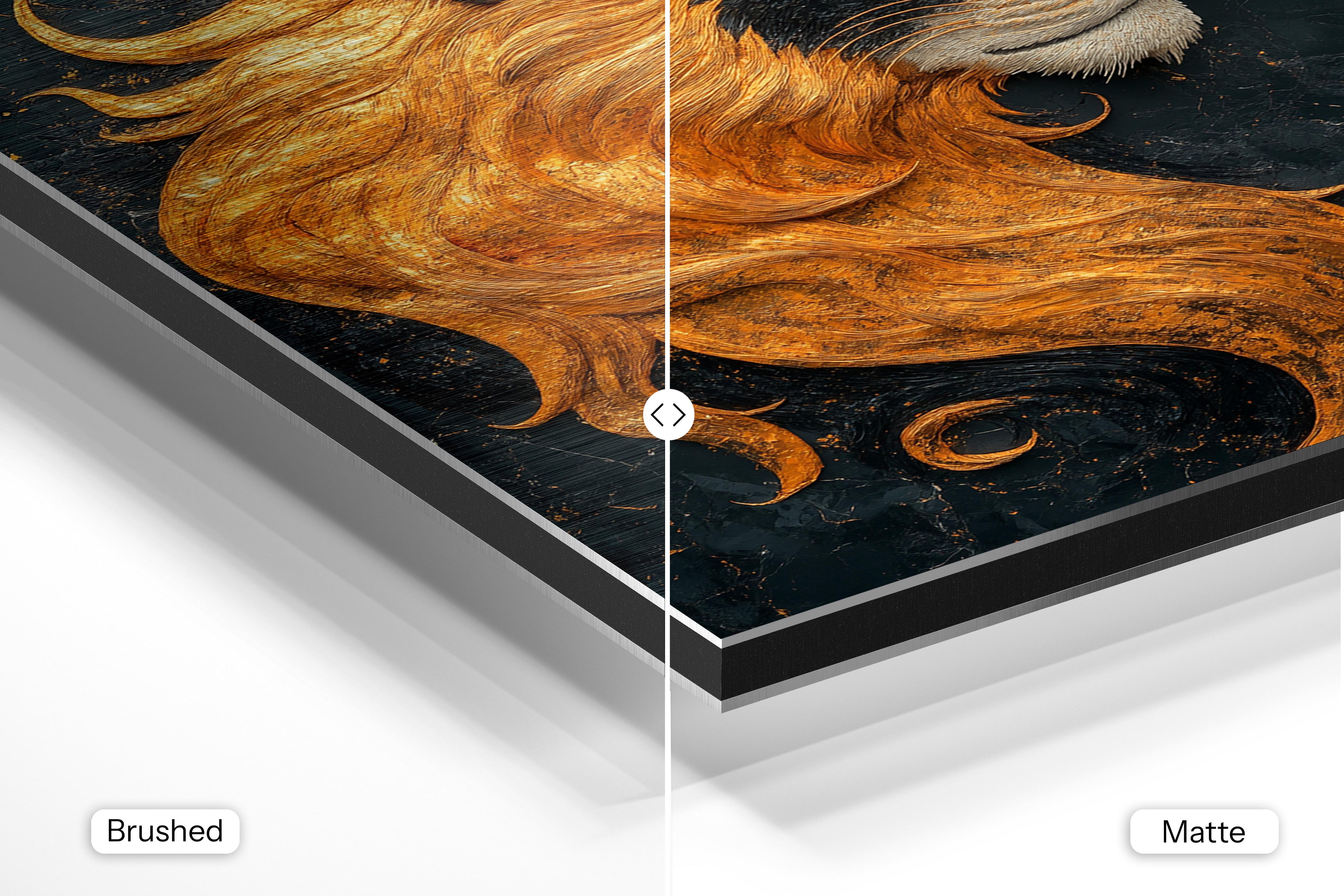 - Brushed Aluminum, on the other hand, features a raw metallic texture with visible brush strokes. Whites and highlights in your image let the silver surface show through, adding a dramatic, shimmering effect. Ideal for black-and-white images, minimalist designs, or abstract art, it creates a bold, industrial vibe with a modern edge.