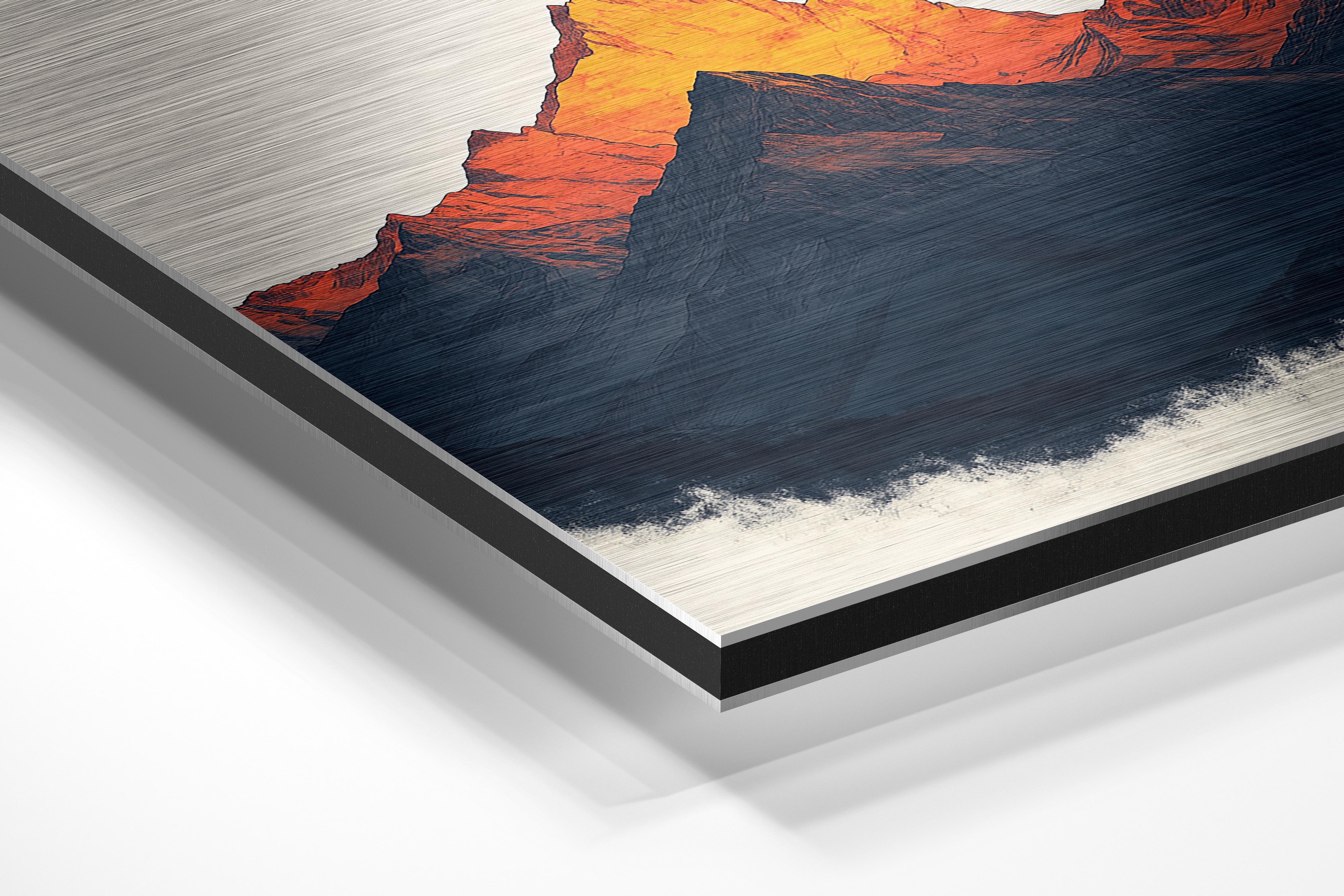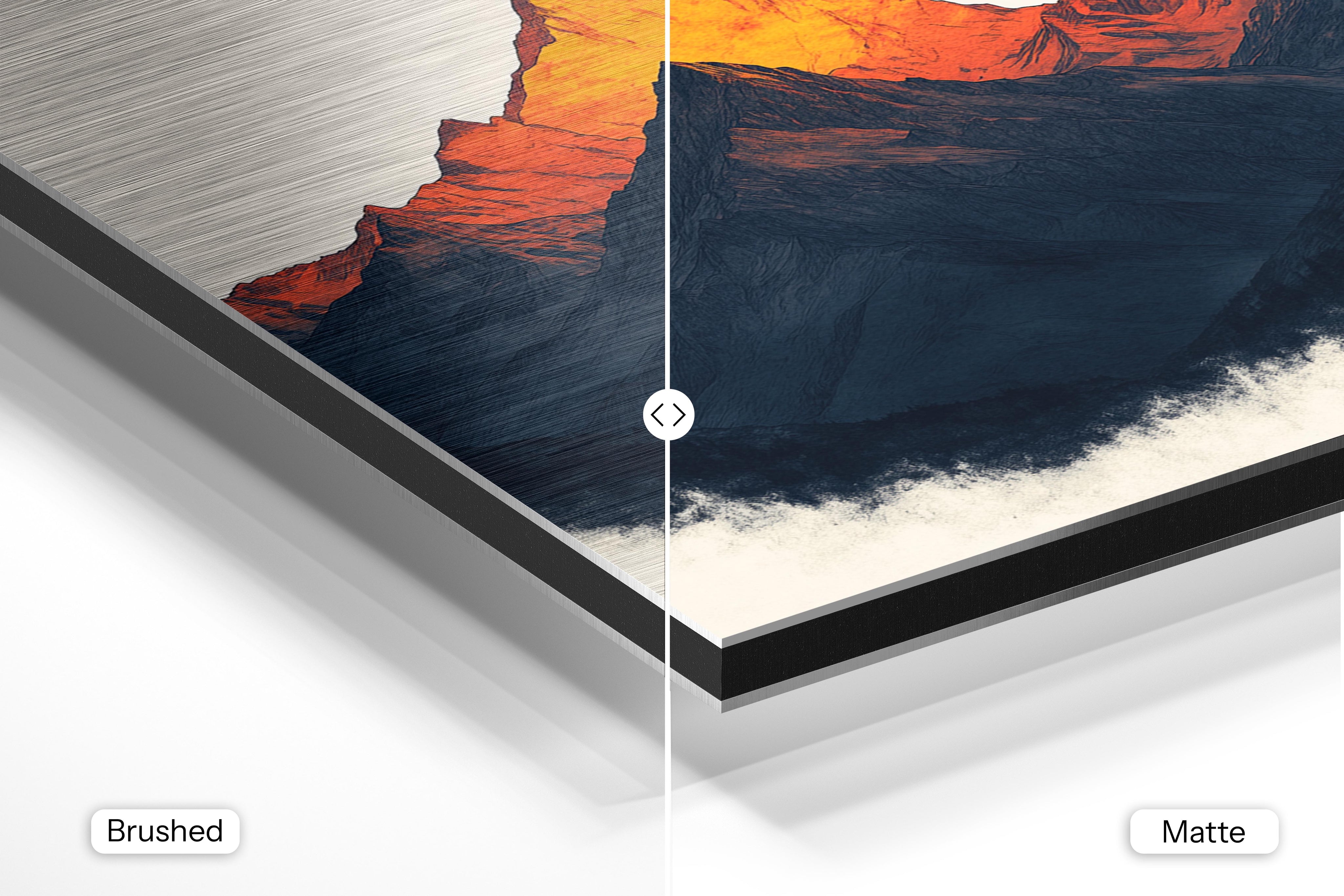 - Brushed Aluminum, on the other hand, features a raw metallic texture with visible brush strokes. Whites and highlights in your image let the silver surface show through, adding a dramatic, shimmering effect. Ideal for black-and-white images, minimalist designs, or abstract art, it creates a bold, industrial vibe with a modern edge.