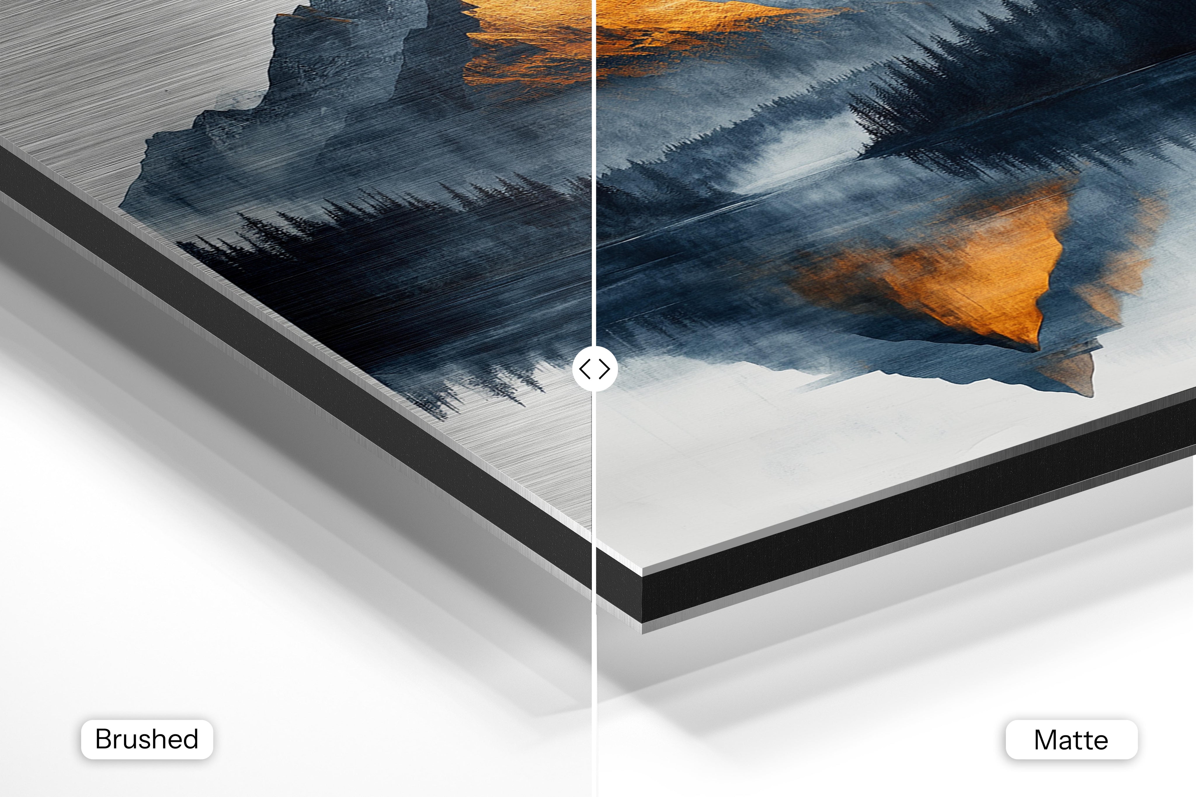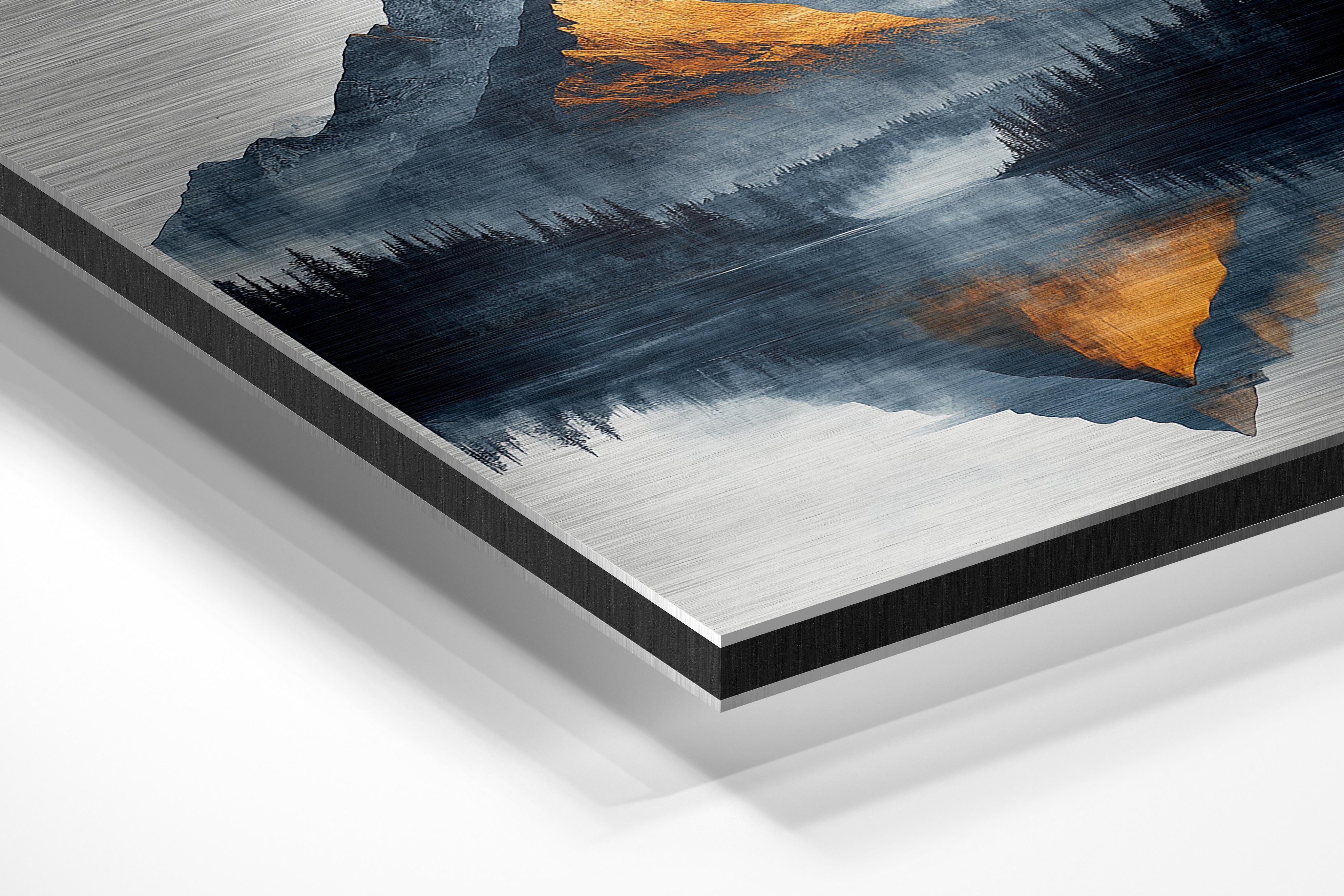 - Brushed Aluminum, on the other hand, features a raw metallic texture with visible brush strokes. Whites and highlights in your image let the silver surface show through, adding a dramatic, shimmering effect. Ideal for black-and-white images, minimalist designs, or abstract art, it creates a bold, industrial vibe with a modern edge.