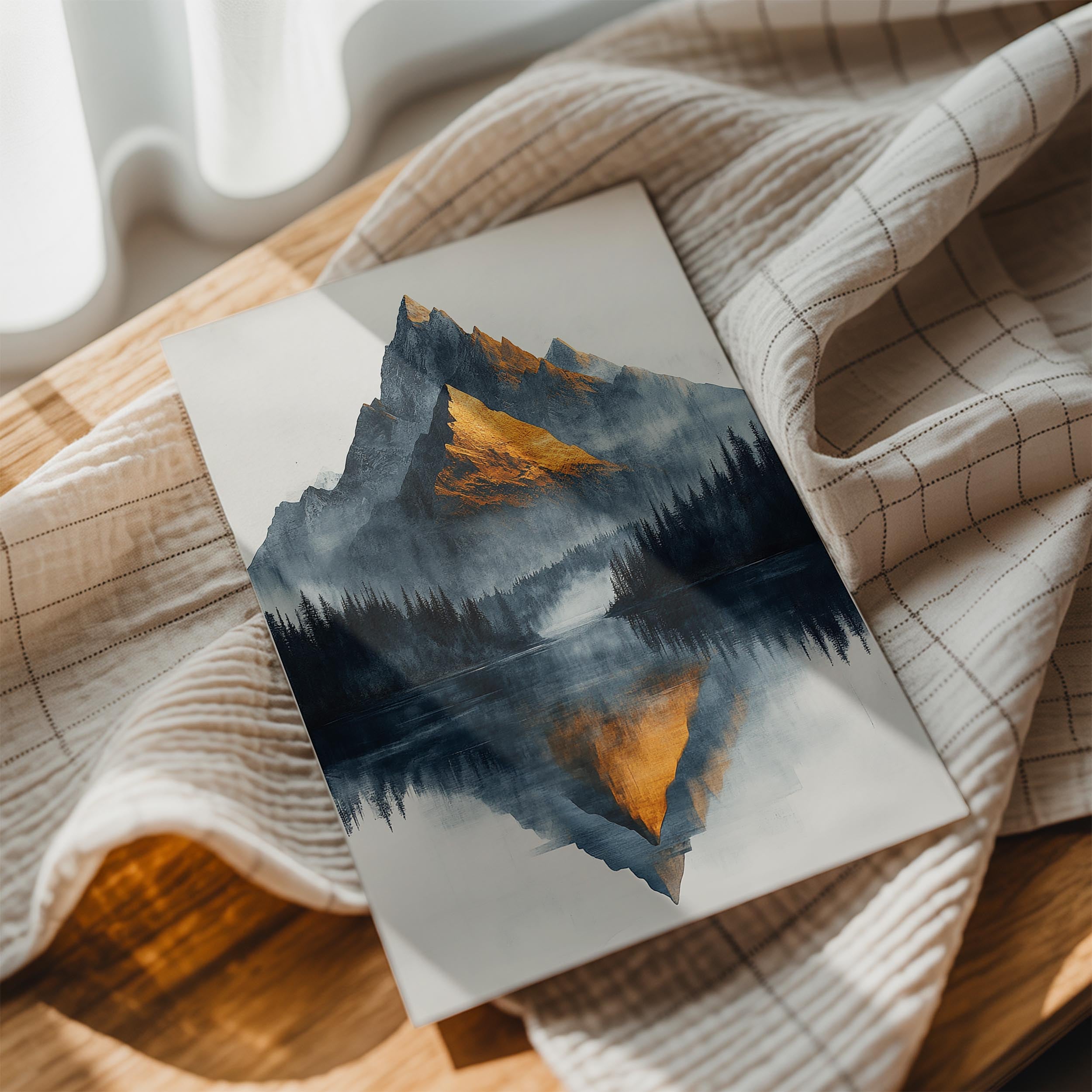 This serene image captures a majestic mountain cloaked in golden light, reflected perfectly in a still lake. The combination of warm, golden tones with cool, misty blues creates a harmonious balance that would suit minimalist and elegant interior designs. Ideal for meditation spaces, offices, or living rooms seeking a calming and visually stunning centerpiece.