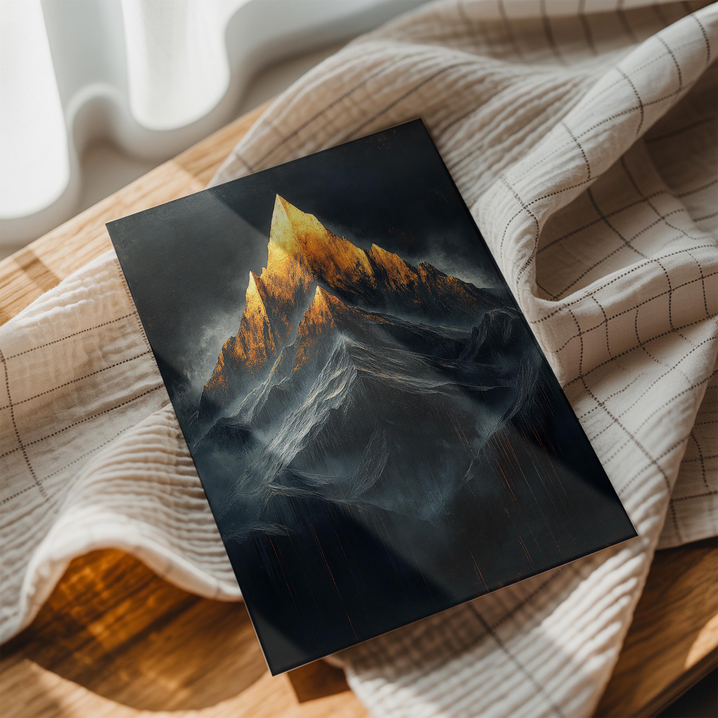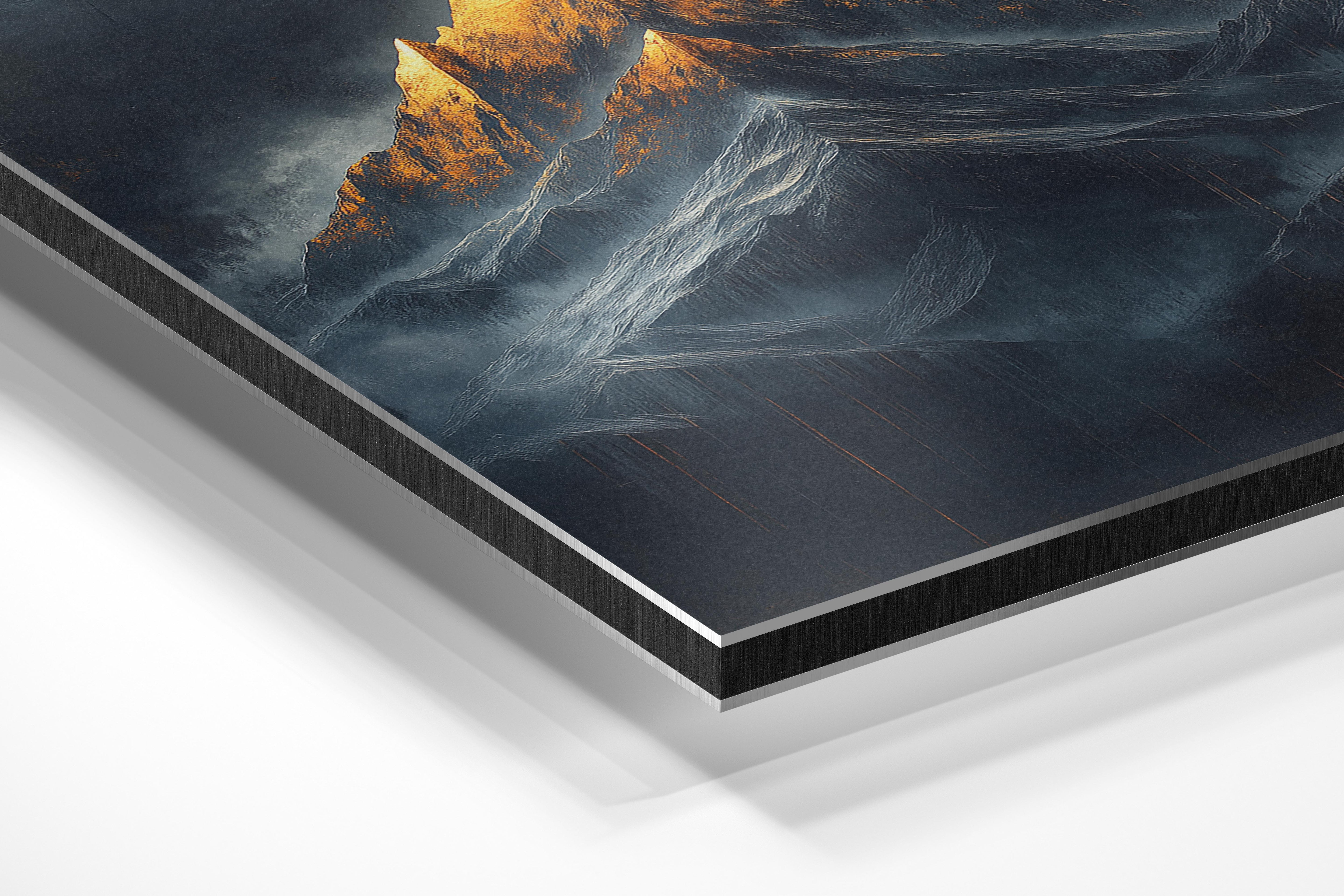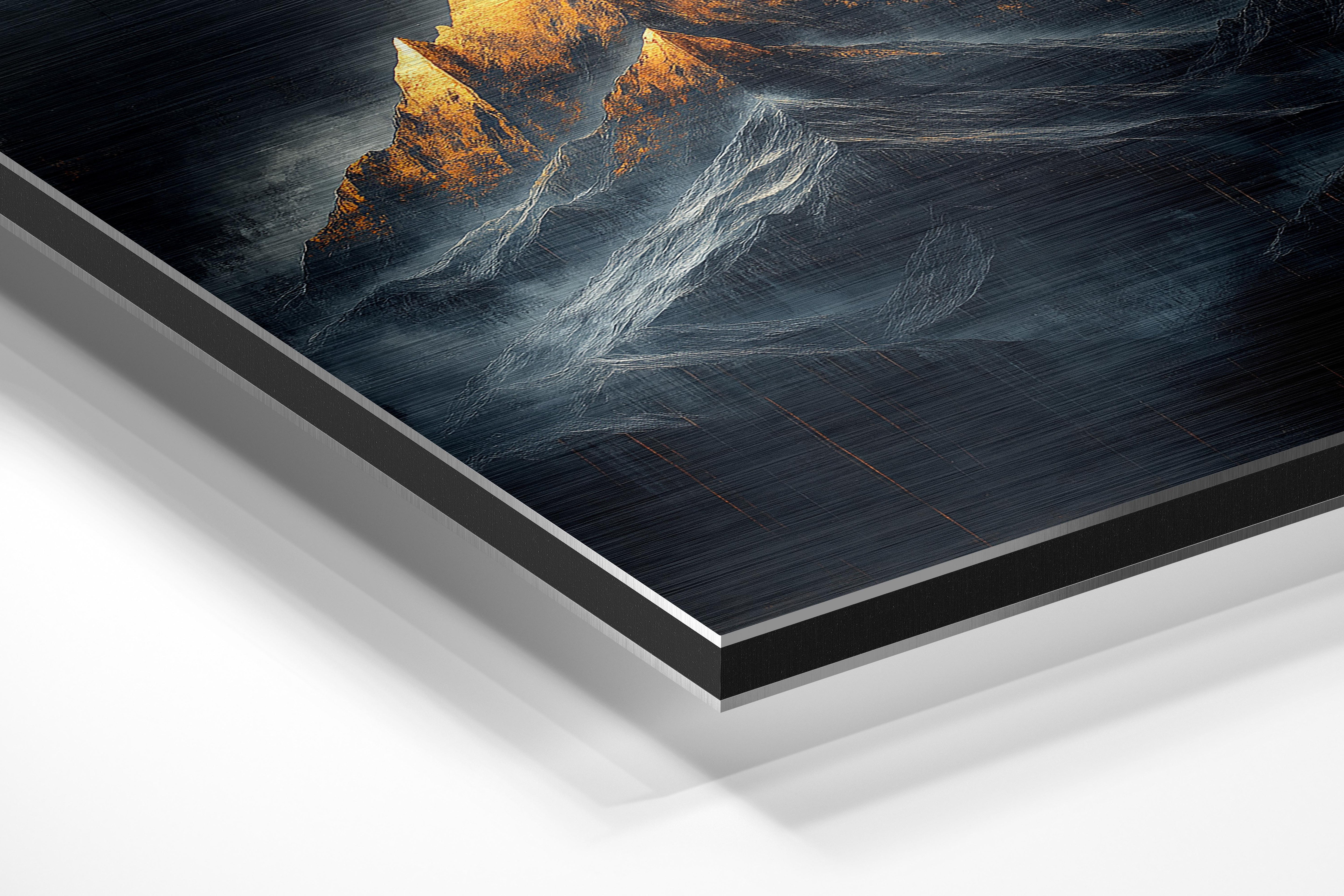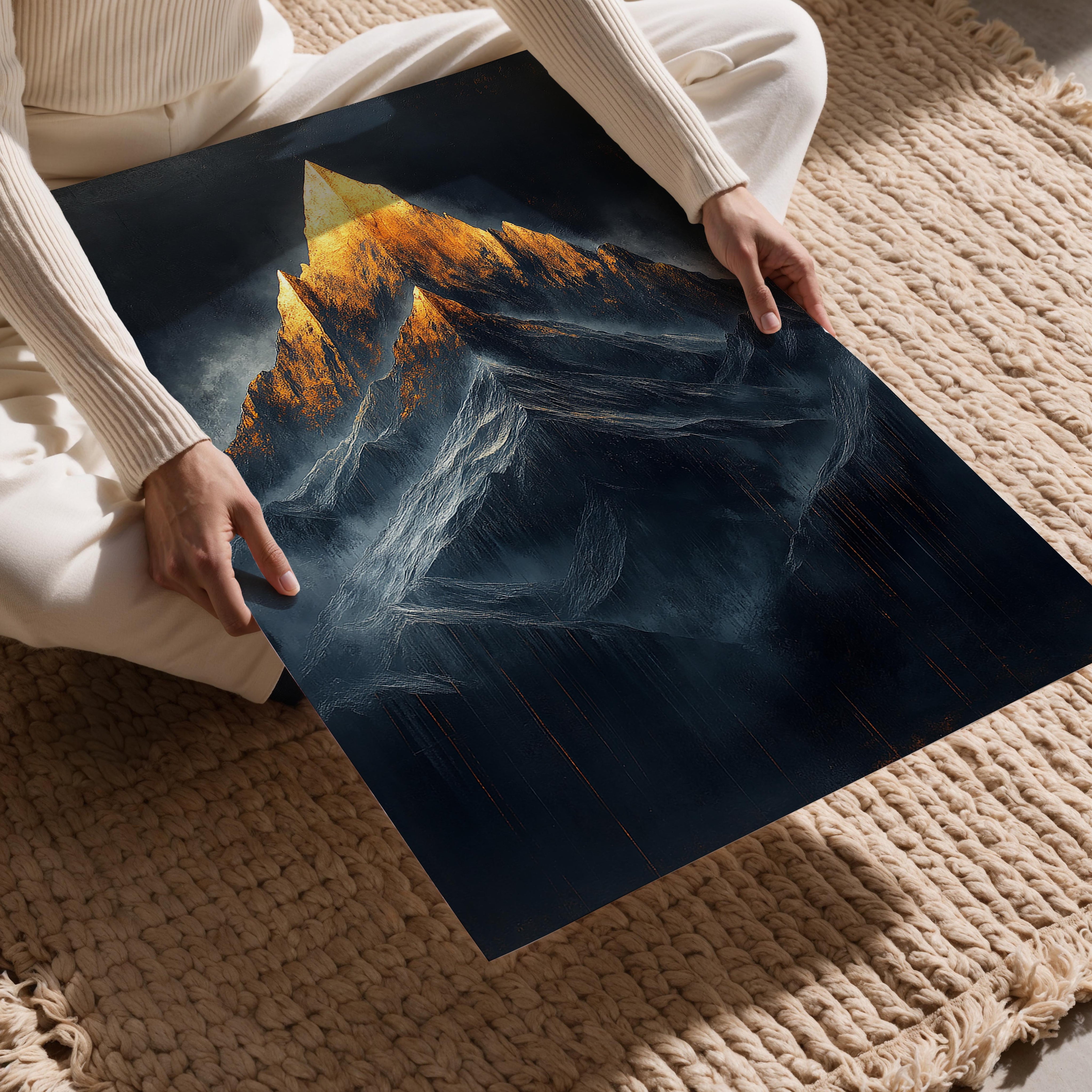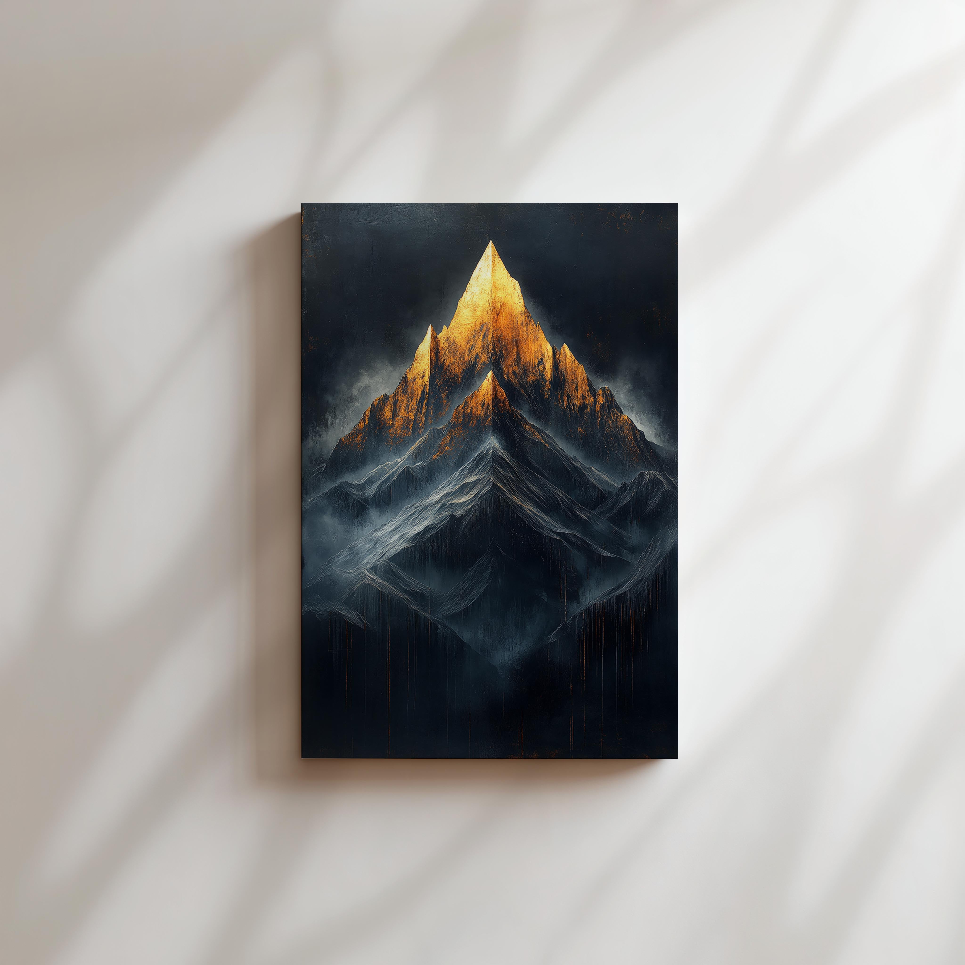 This dramatic depiction of a mountain with a glowing golden peak exudes power and majesty. The intricate textures and contrast between the dark surroundings and bright summit make it a captivating piece for modern and industrial-style interiors.