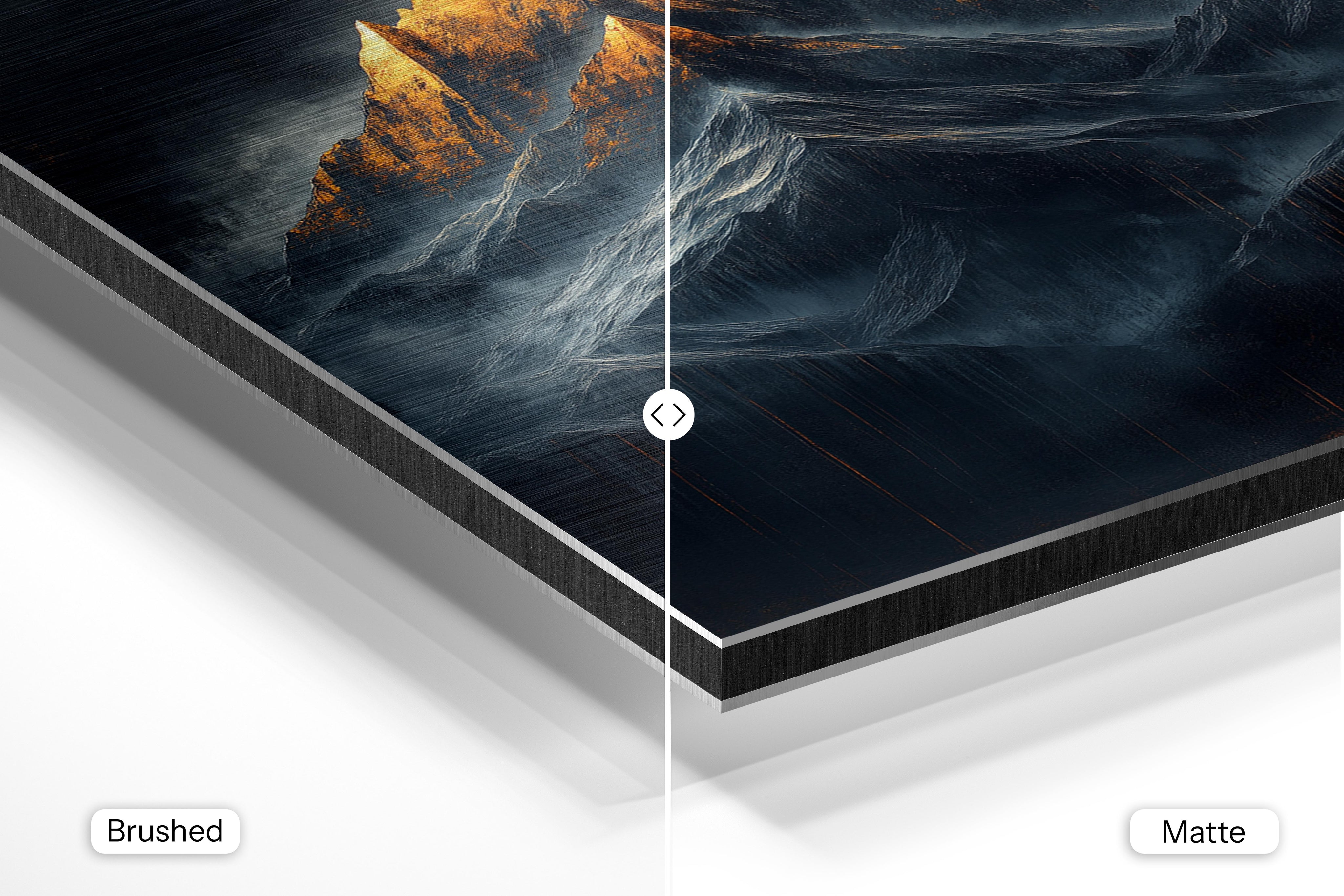 - Brushed Aluminum, on the other hand, features a raw metallic texture with visible brush strokes. Whites and highlights in your image let the silver surface show through, adding a dramatic, shimmering effect. Ideal for black-and-white images, minimalist designs, or abstract art, it creates a bold, industrial vibe with a modern edge.