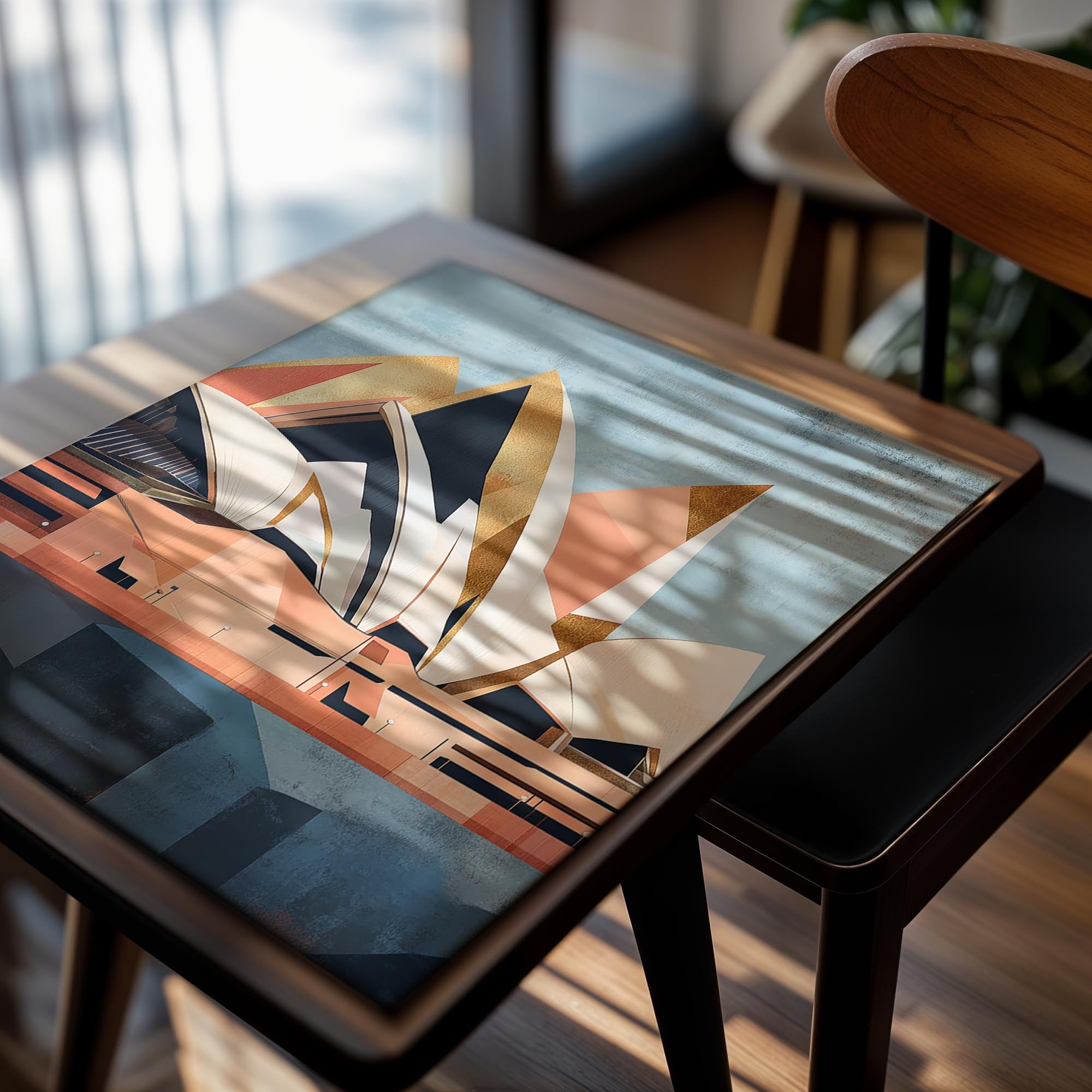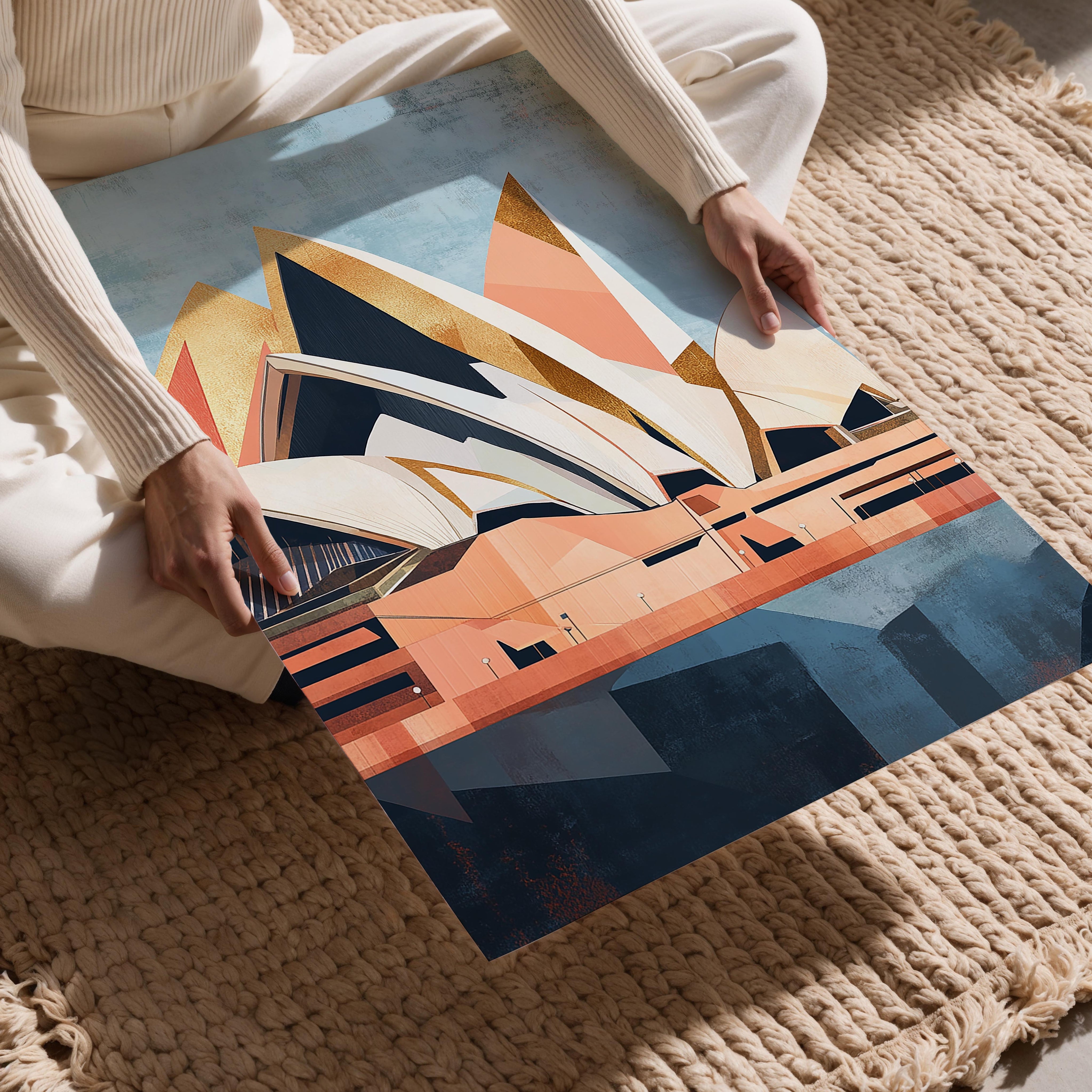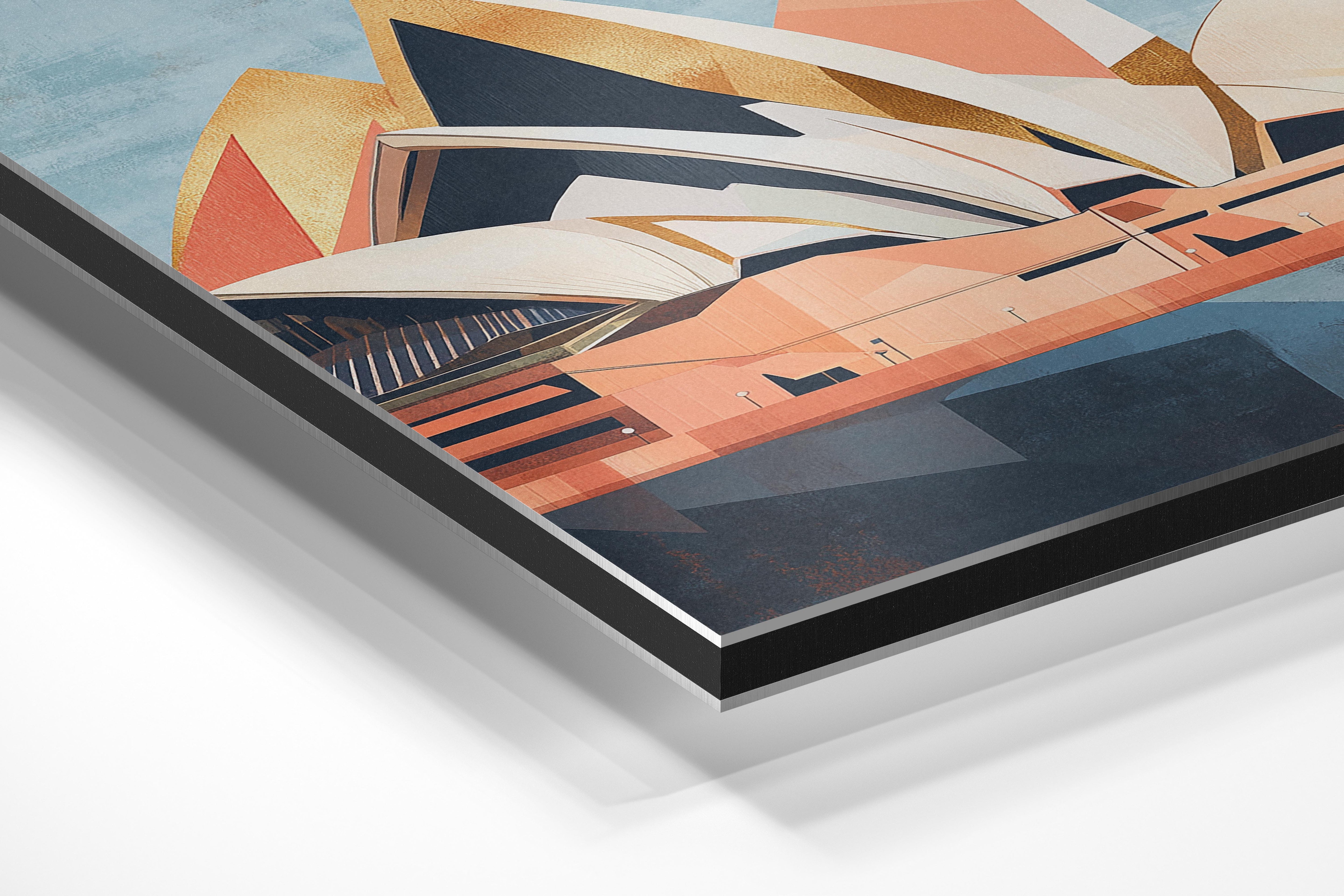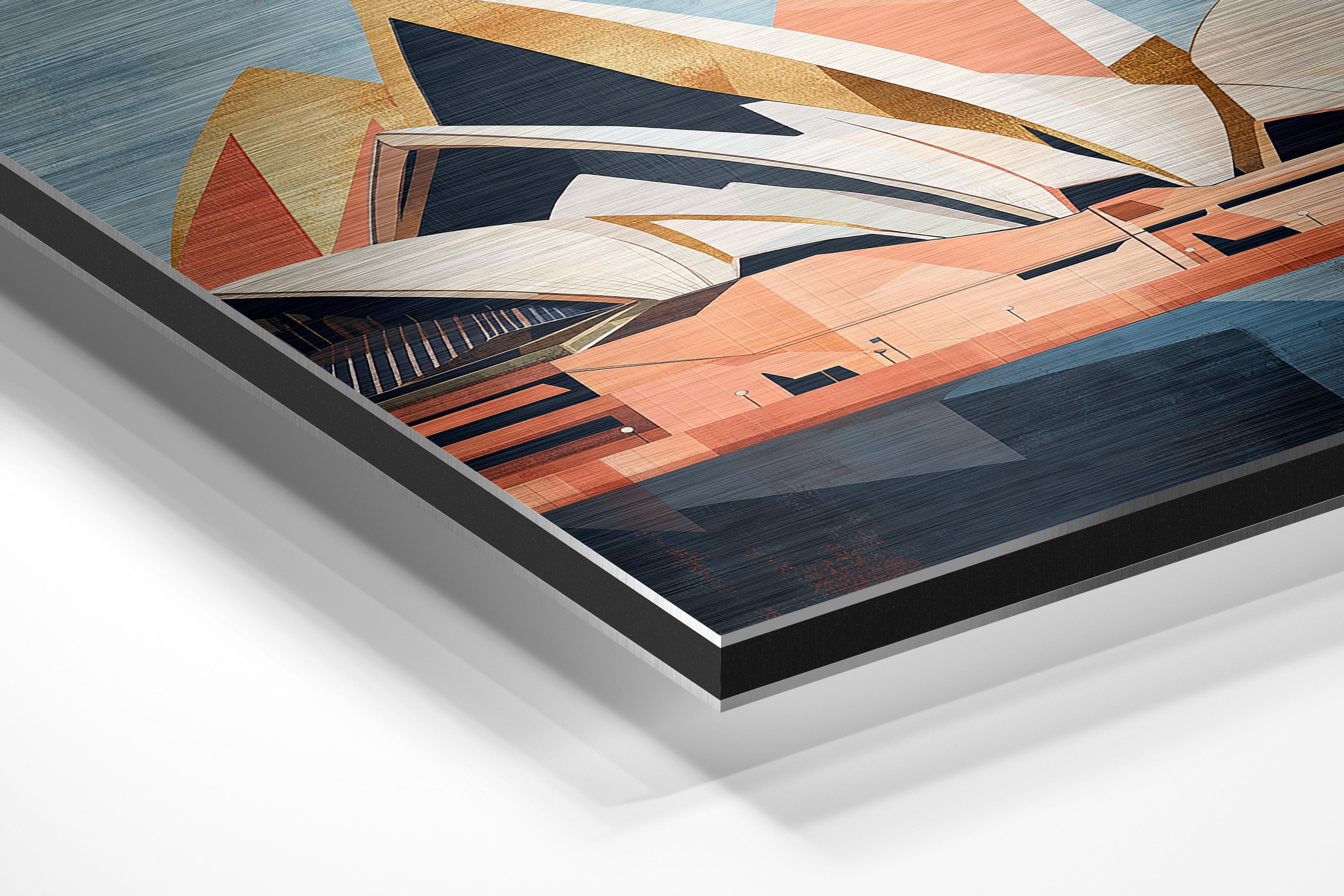 A unique abstract portrayal of the Sydney Opera House with golden accents, blending modern design and historic cultural significance. The artwork’s subdued palette adds a touch of sophistication, ideal for boardrooms, upscale residences, or art galleries. The intricate patterns and use of gold tones make it a statement piece, symbolizing the innovation and timeless allure of iconic architecture. It is a harmonious blend of art, culture, and modern aesthetics.