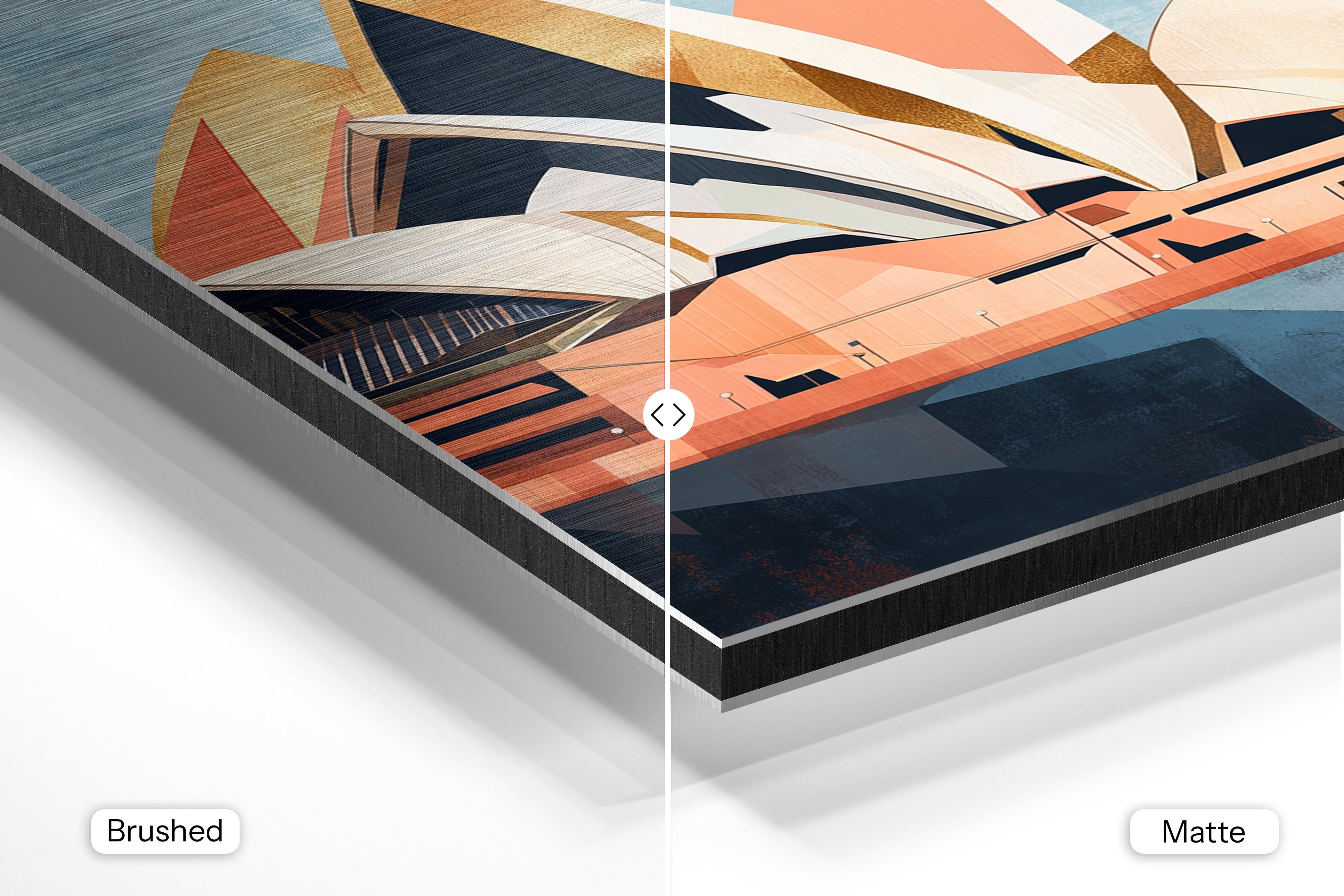 - Brushed Aluminum, on the other hand, features a raw metallic texture with visible brush strokes. Whites and highlights in your image let the silver surface show through, adding a dramatic, shimmering effect. Ideal for black-and-white images, minimalist designs, or abstract art, it creates a bold, industrial vibe with a modern edge.