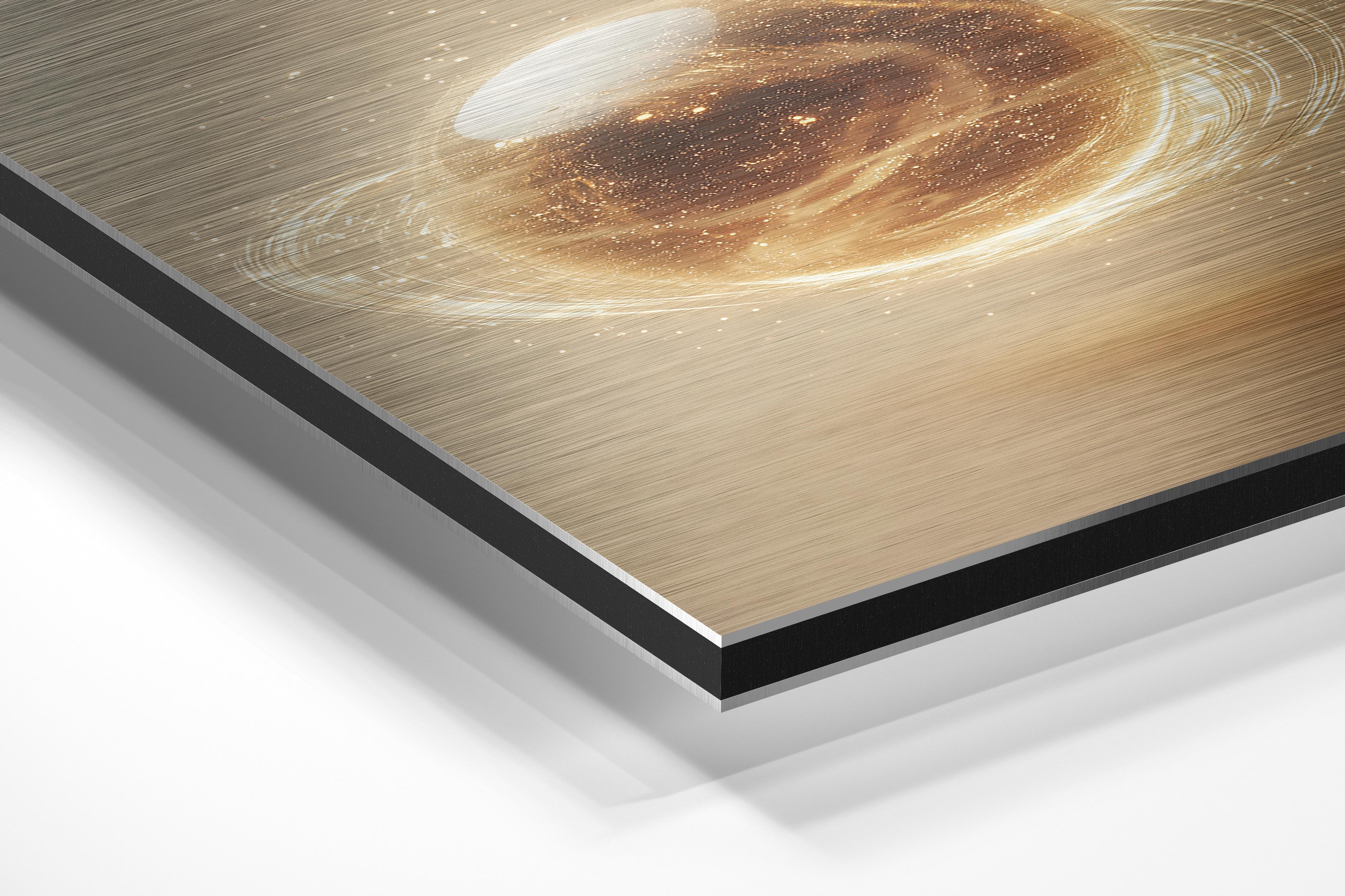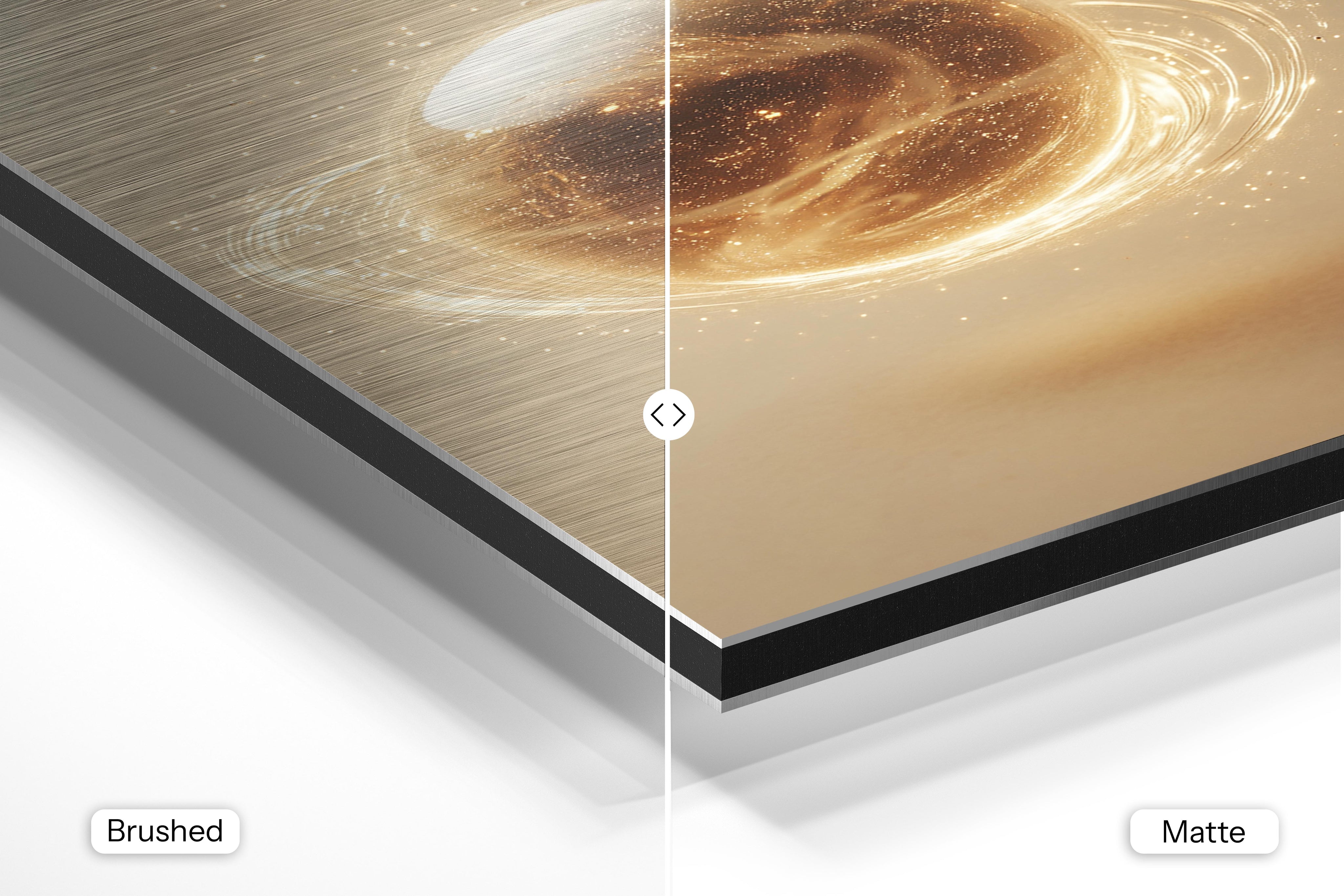 - Brushed Aluminum, on the other hand, features a raw metallic texture with visible brush strokes. Whites and highlights in your image let the silver surface show through, adding a dramatic, shimmering effect. Ideal for black-and-white images, minimalist designs, or abstract art, it creates a bold, industrial vibe with a modern edge.
