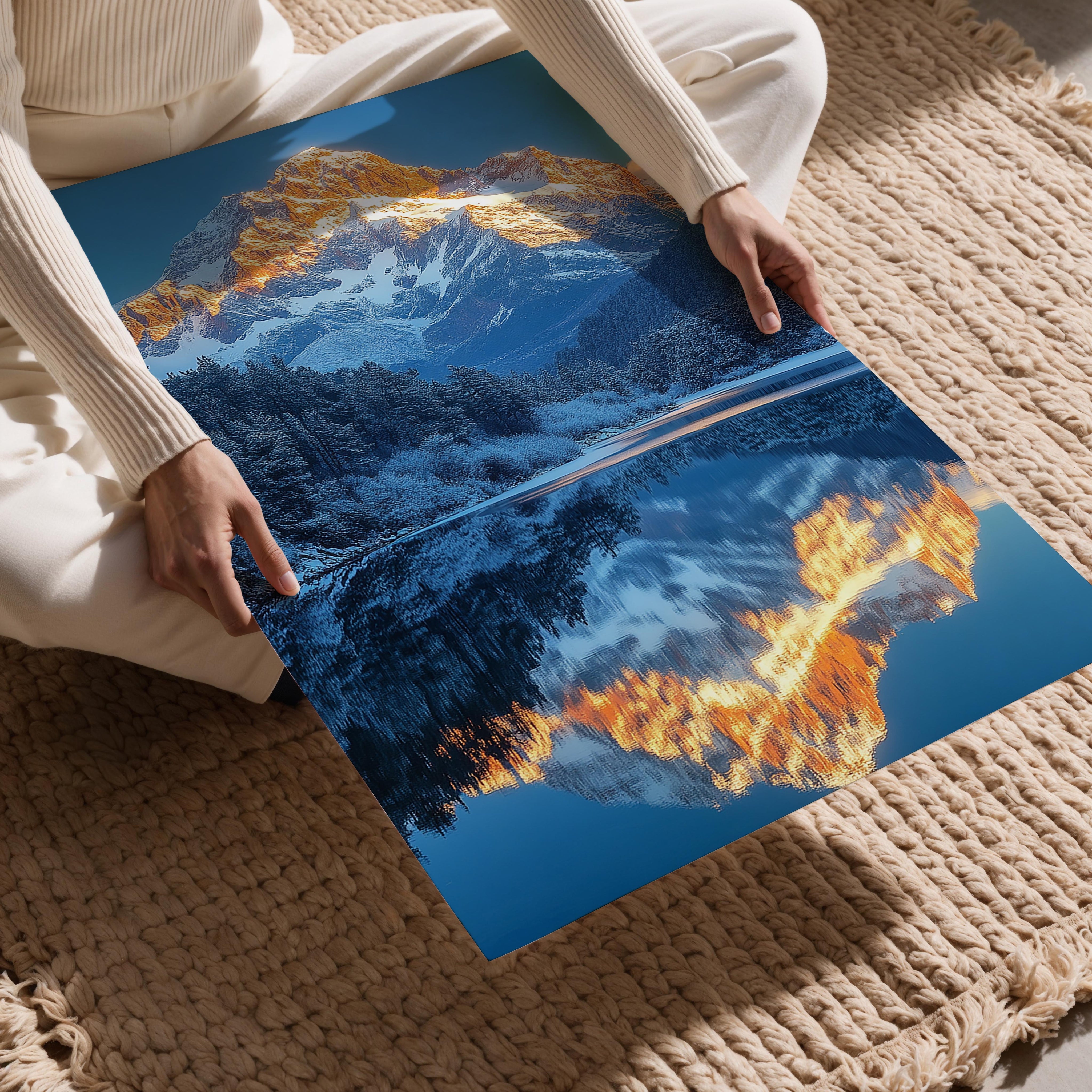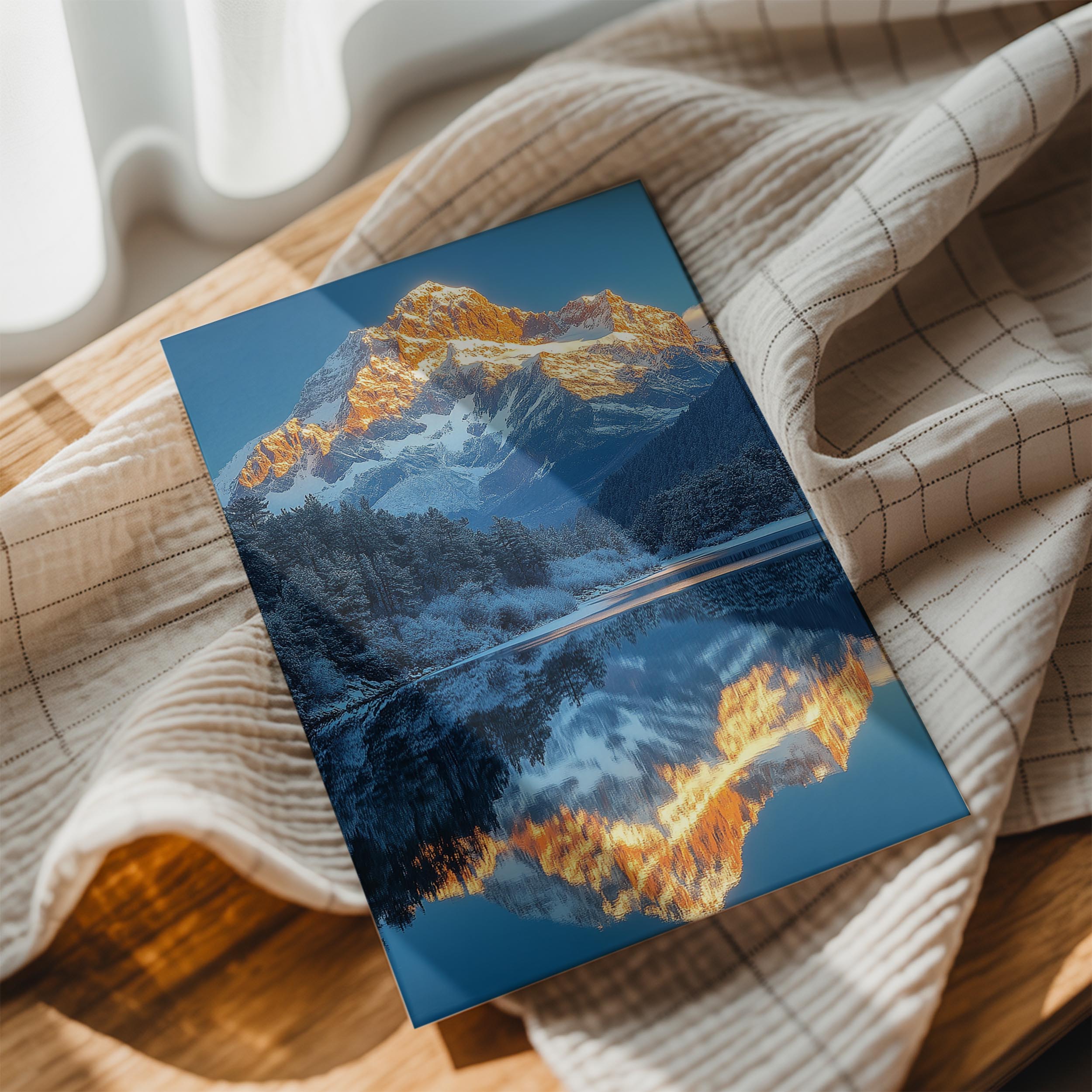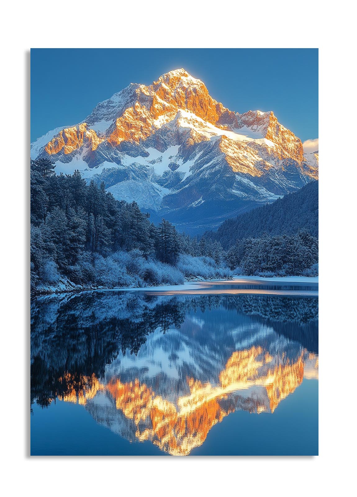 A majestic golden-hued mountain mirrored in a crystal-clear lake. This image captures the grandeur of towering peaks illuminated by the soft, warm light of sunset. The lake’s surface, as smooth as glass, creates a flawless reflection that doubles the beauty of the scene. Ideal for showcasing the timeless splendor of mountainous landscapes, this photograph evokes feelings of wonder and appreciation for the natural world. A striking depiction of alpine beauty that appeals to adventurers and nature lovers alike.