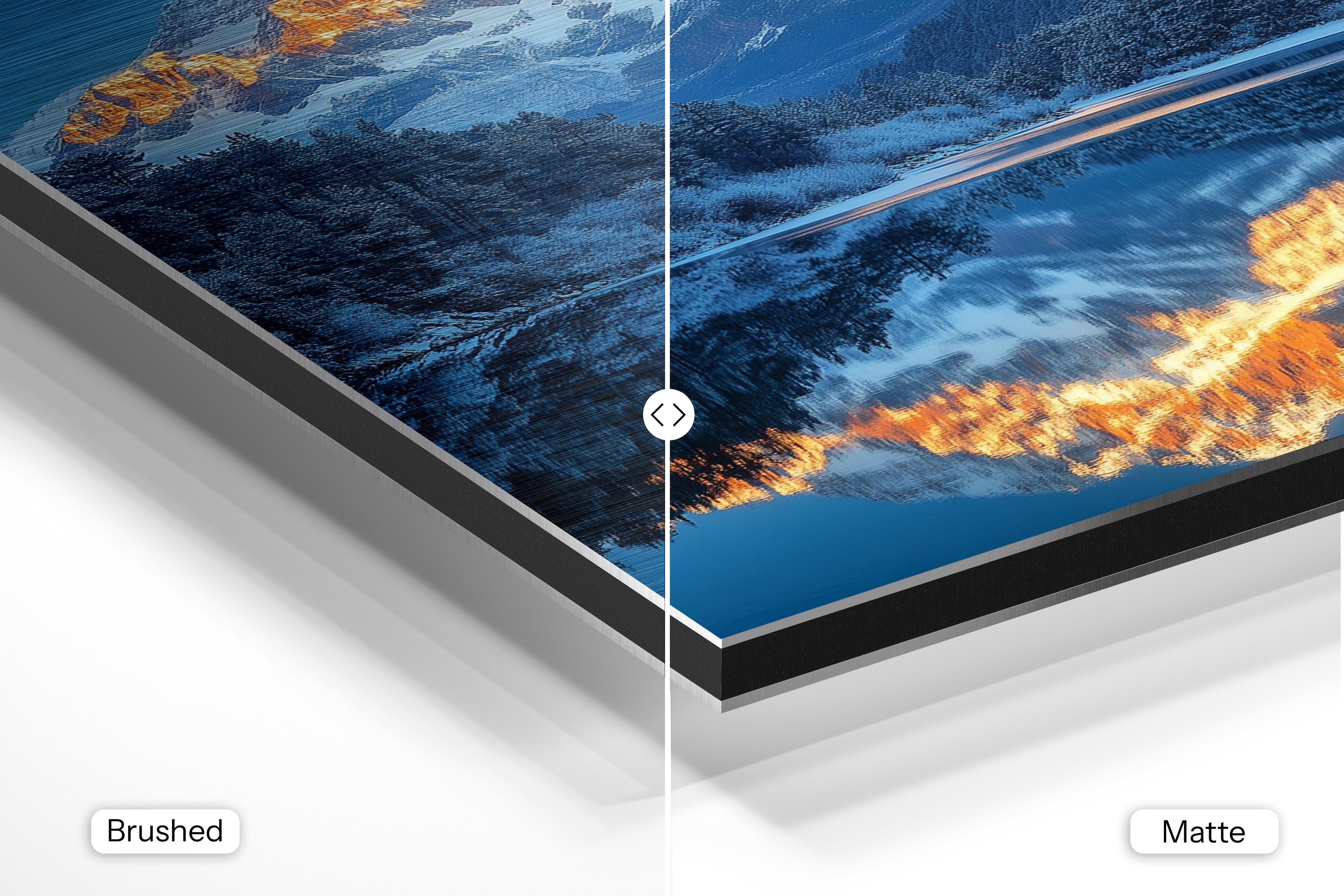 - Matte Aluminum offers a smooth, bright white surface that delivers crisp details and vibrant, true-to-life colors. With its non-reflective finish and subtle silky sheen, it’s perfect for photography, portraits, and colorful artwork—bringing a clean, polished look to any interior.