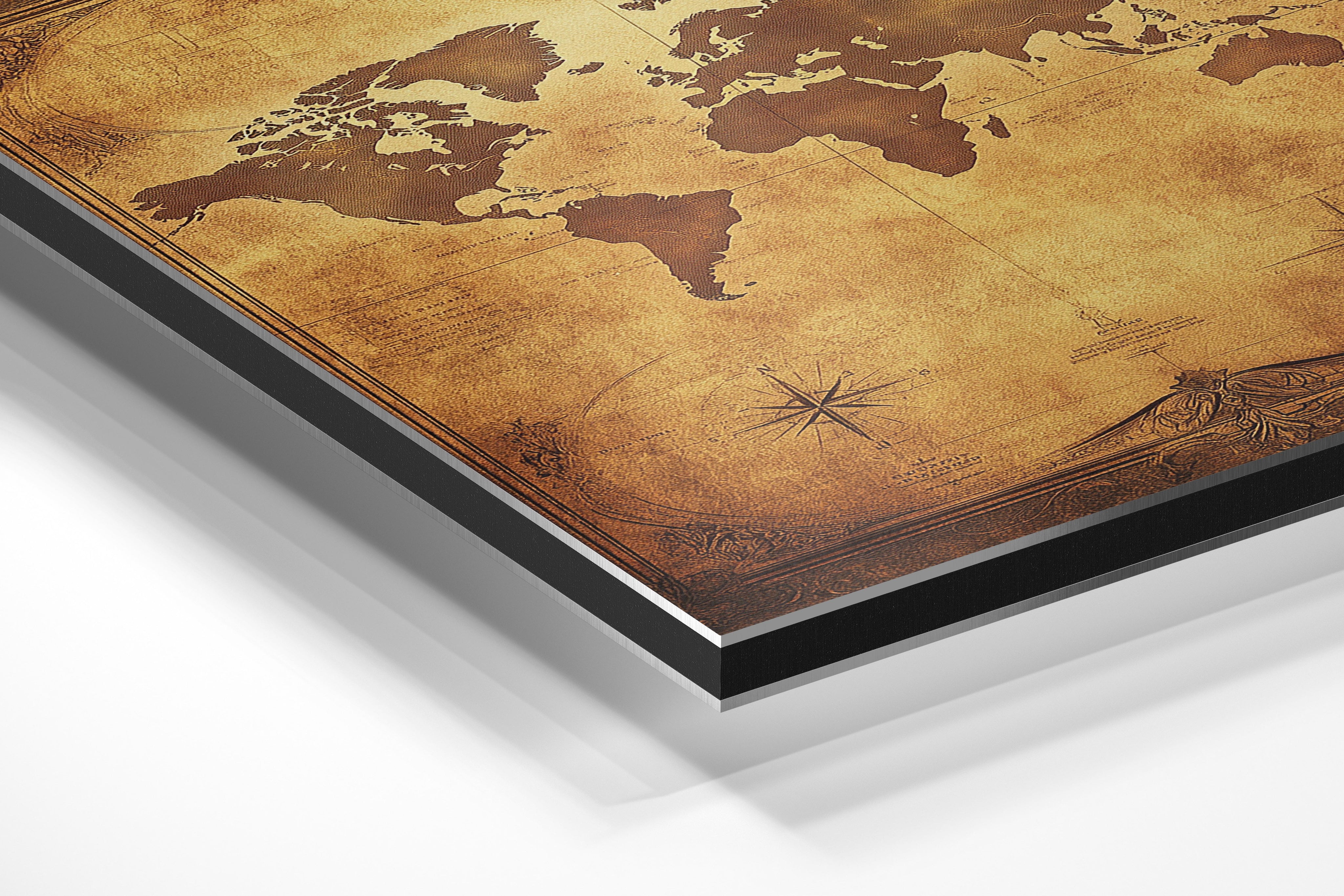 A luxurious map of the world rendered in golden tones, this piece exudes elegance and grandeur. The intricate detailing and antique finish make it a statement piece for offices, libraries, or study spaces. It appeals to those with a passion for geography and a love of timeless design. Its warm hues and ornate frame create a sophisticated ambiance, making it a stunning focal point in classic or contemporary interiors.