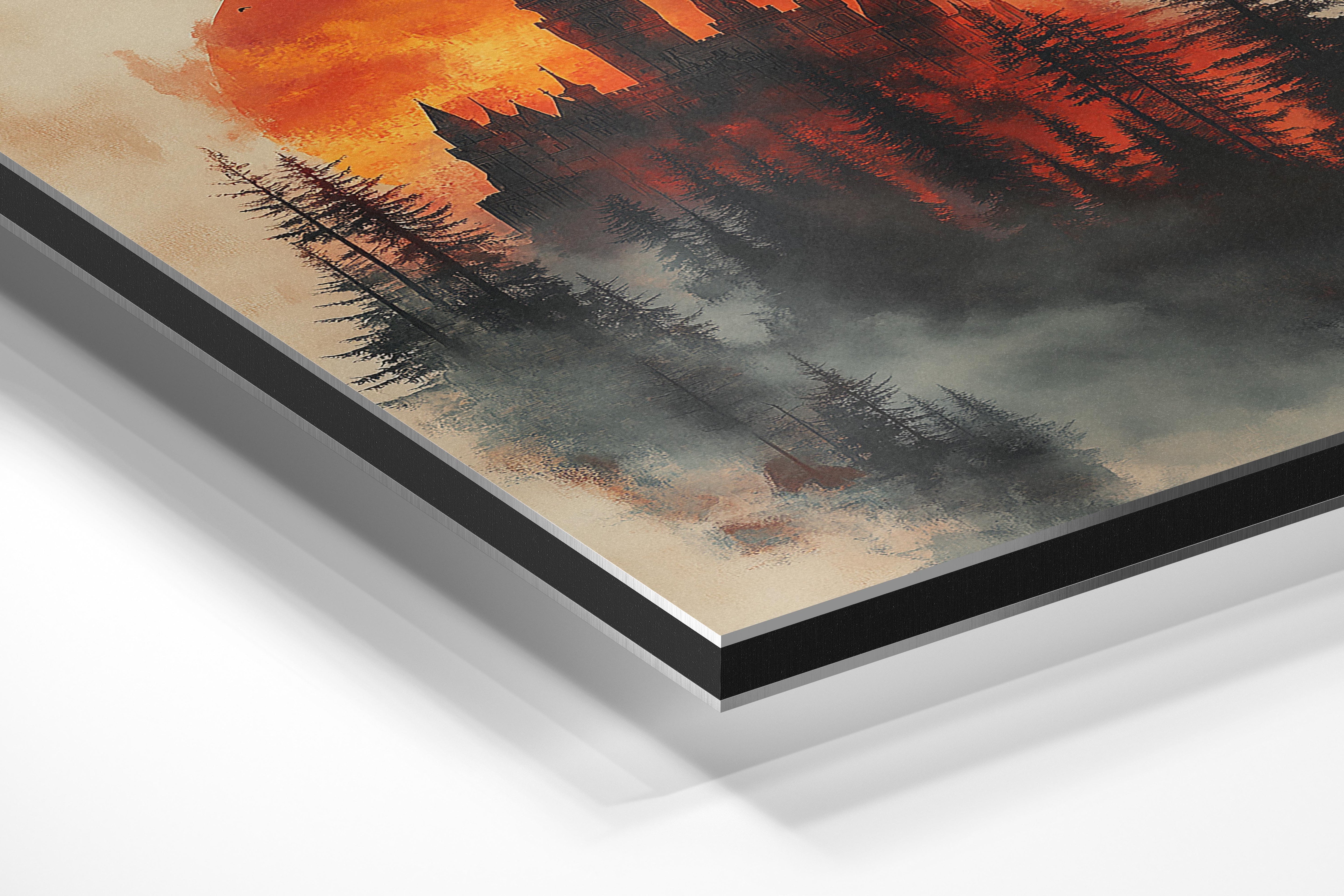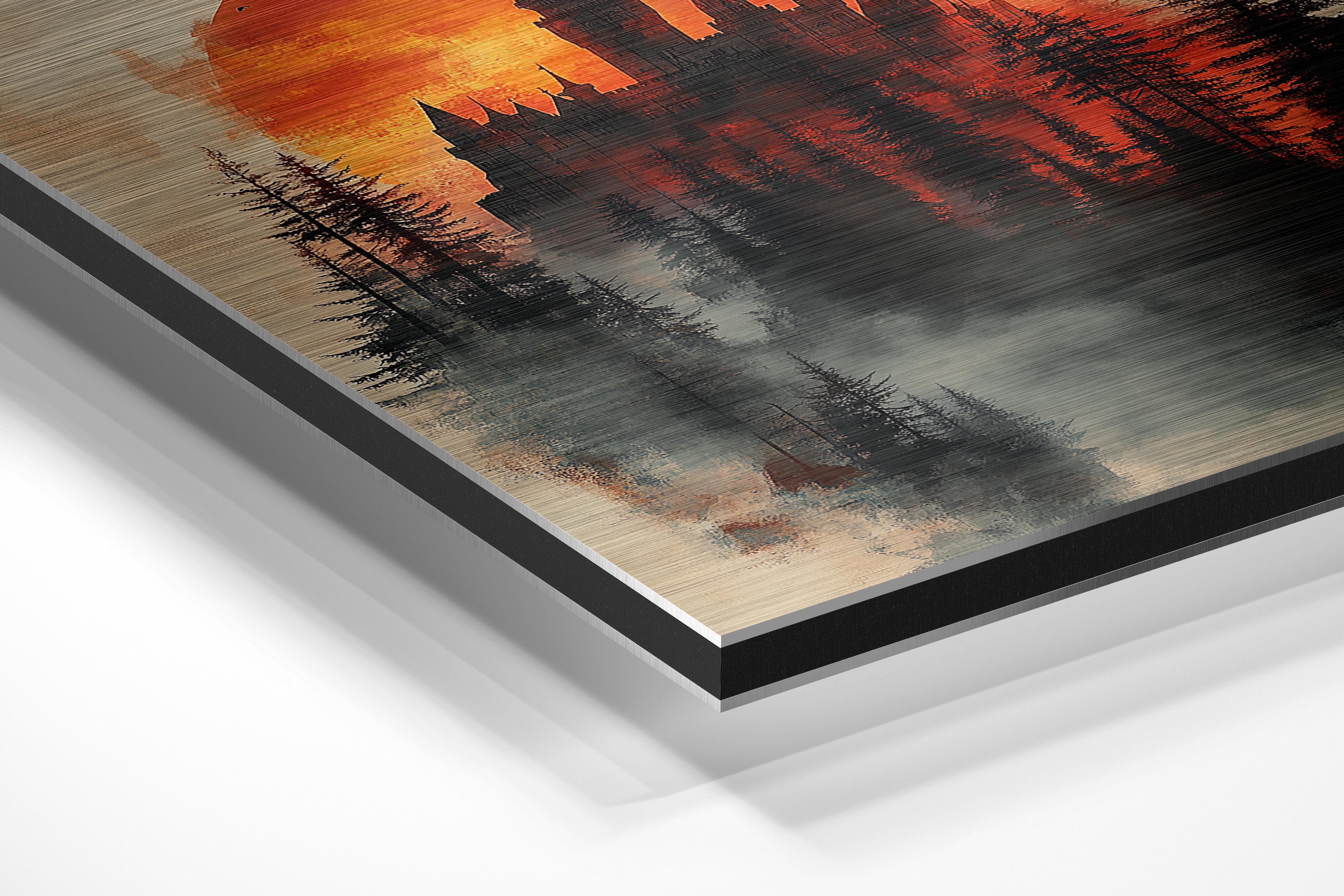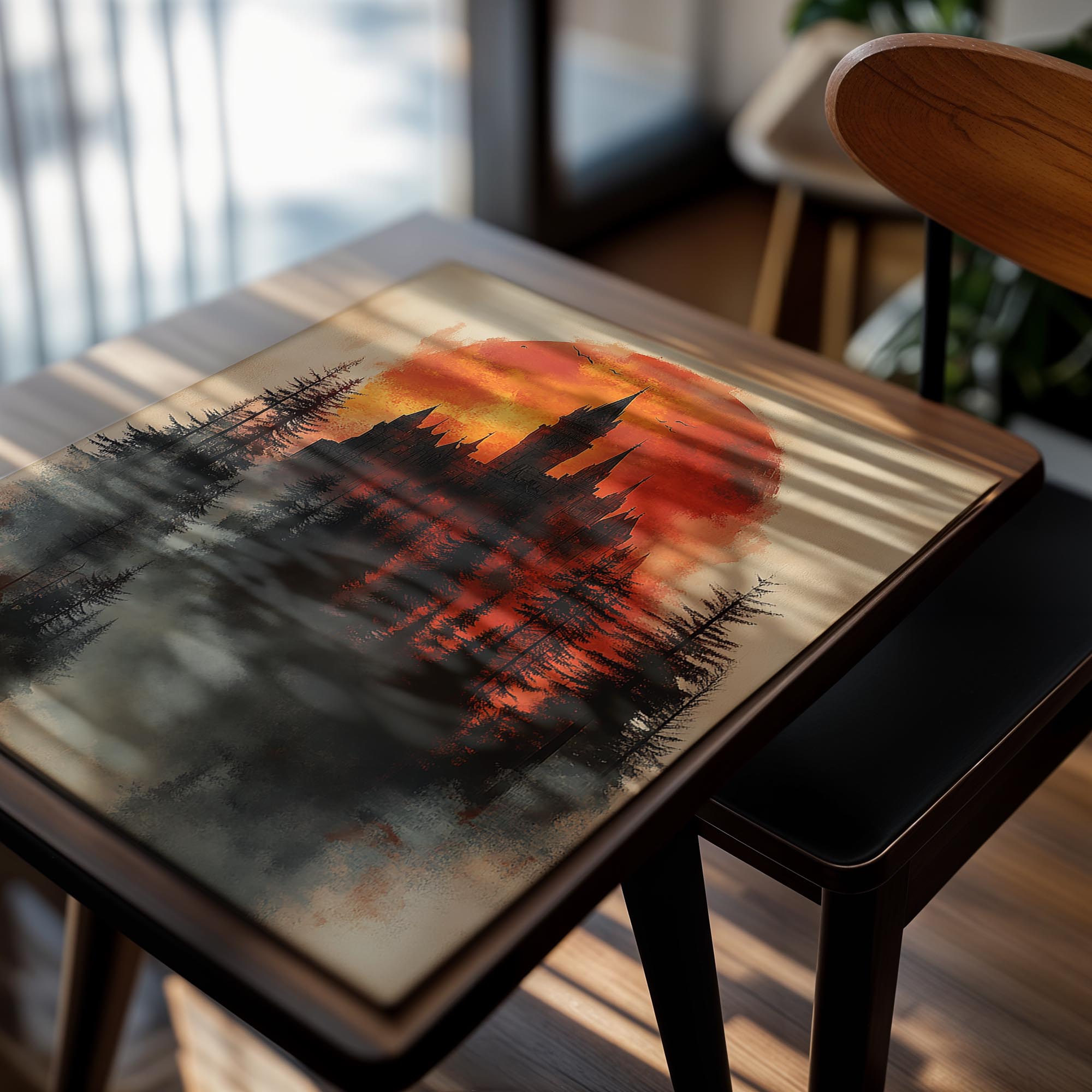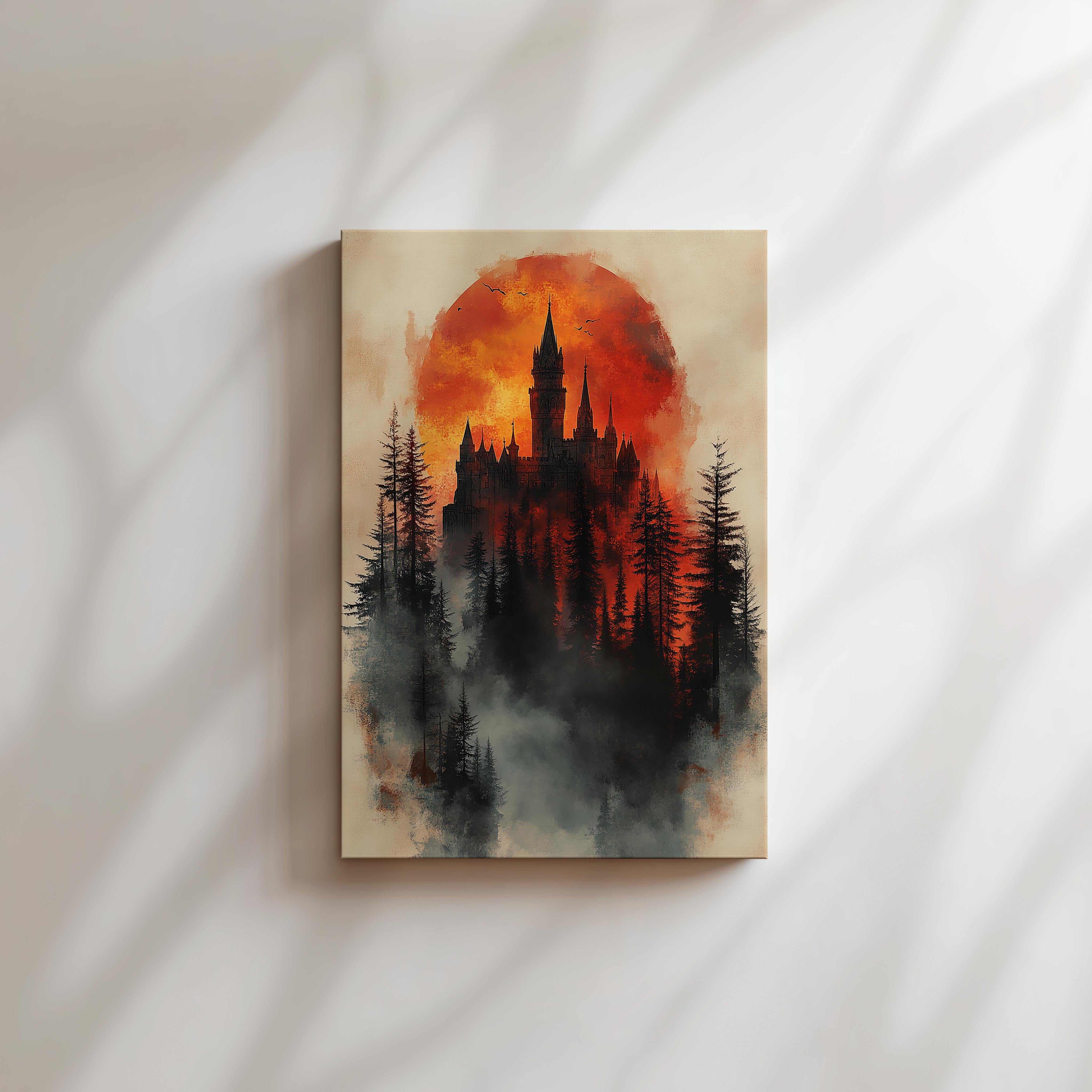 A dramatic and eerie illustration of a towering gothic castle silhouetted against a burning red-orange sunset. The dark pine trees in the foreground contrast starkly with the castle’s silhouette, while misty fog swirls around the scene, enhancing the atmosphere of mystery and intrigue. A few birds soar in the sky, further adding to the eerie yet captivating ambiance. This piece is perfect for lovers of gothic and fantasy art, ideal for an office, living room, or creative space, where its moody tones will add depth and drama.
