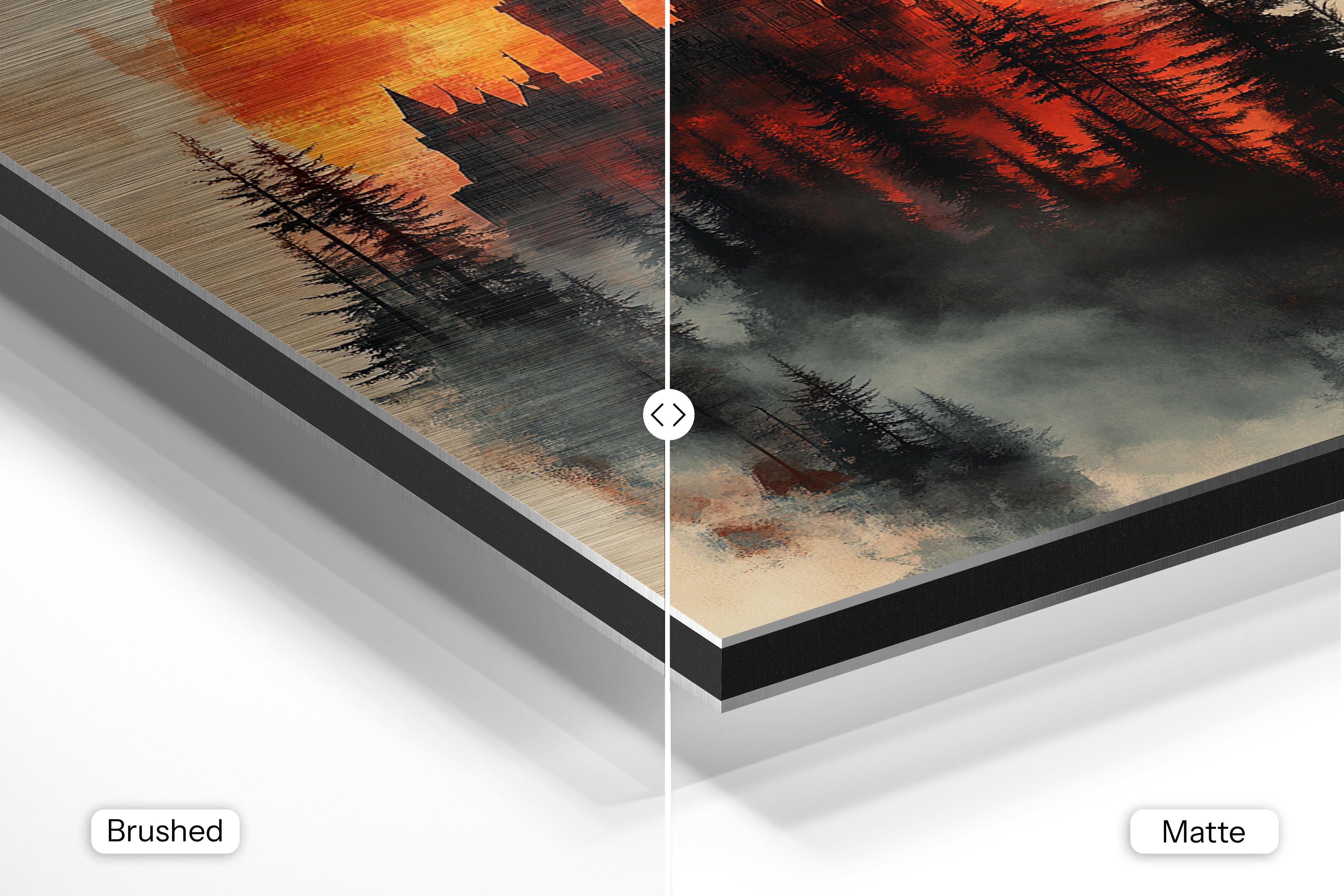 - Brushed Aluminum, on the other hand, features a raw metallic texture with visible brush strokes. Whites and highlights in your image let the silver surface show through, adding a dramatic, shimmering effect. Ideal for black-and-white images, minimalist designs, or abstract art, it creates a bold, industrial vibe with a modern edge.