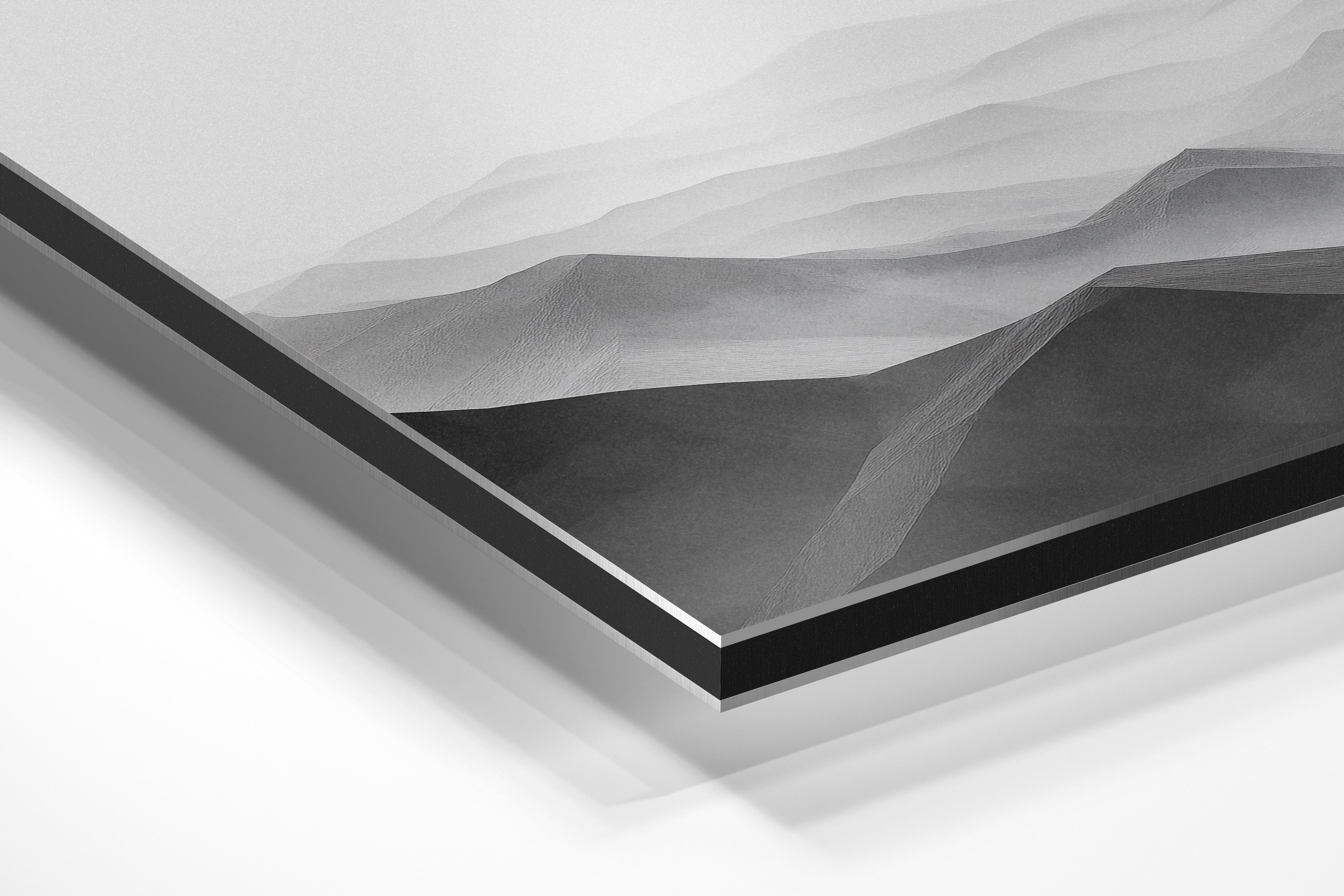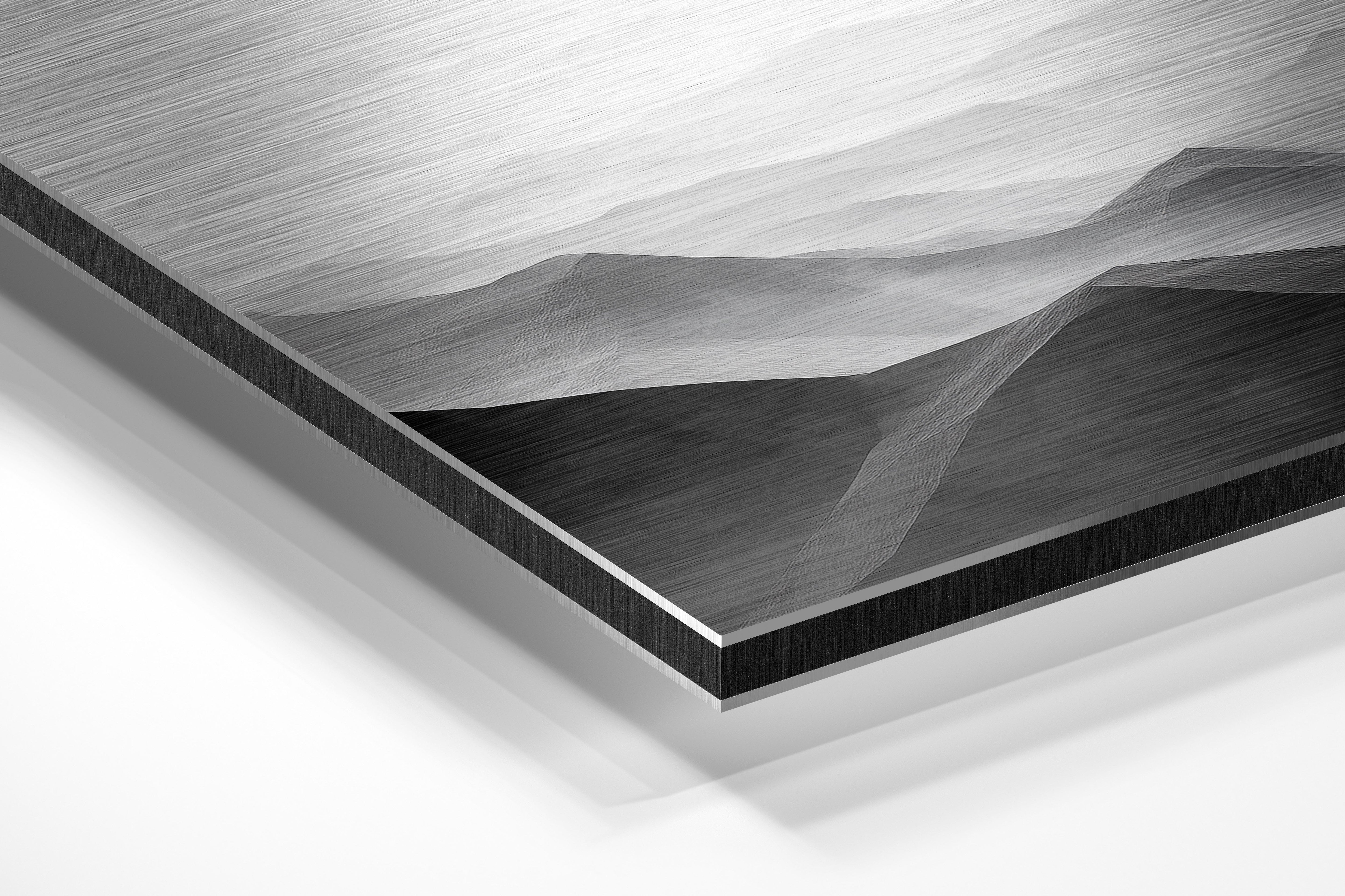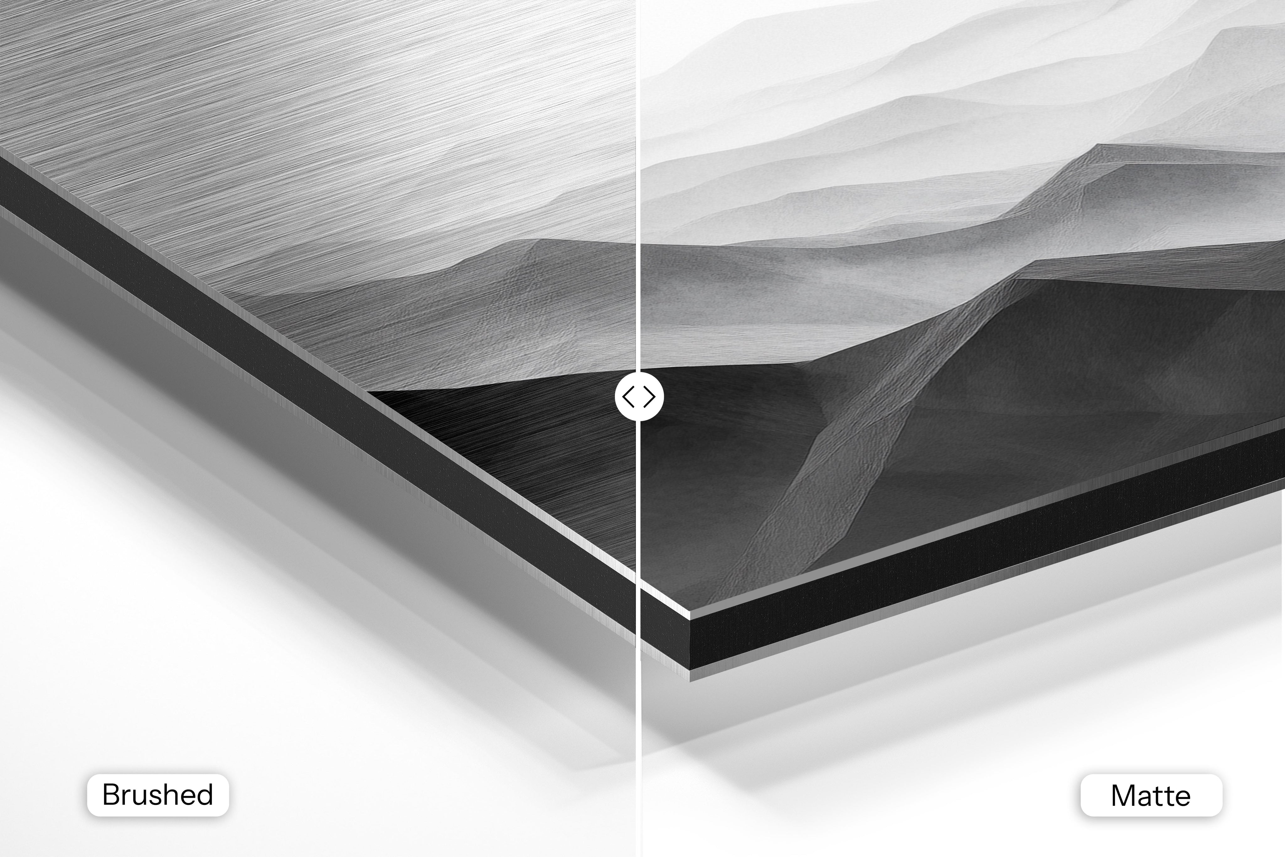- Brushed Aluminum, on the other hand, features a raw metallic texture with visible brush strokes. Whites and highlights in your image let the silver surface show through, adding a dramatic, shimmering effect. Ideal for black-and-white images, minimalist designs, or abstract art, it creates a bold, industrial vibe with a modern edge.