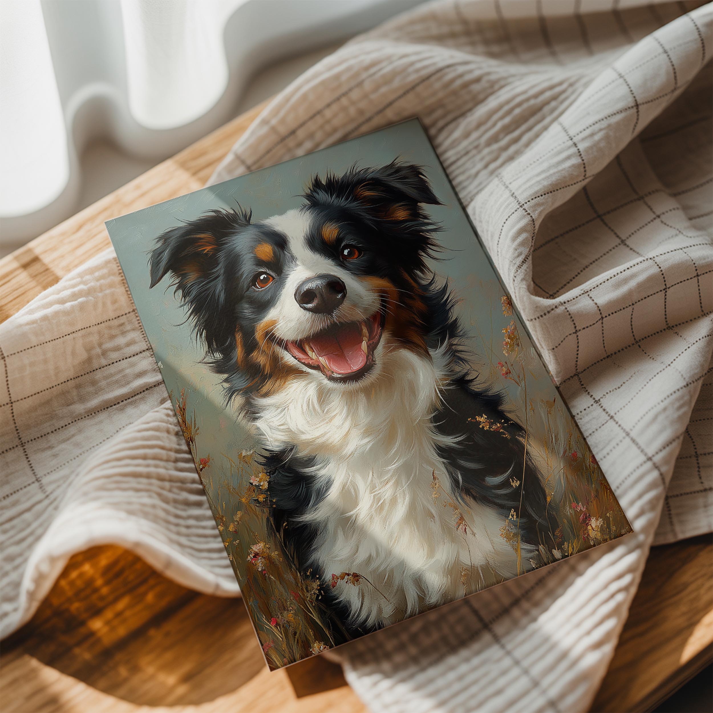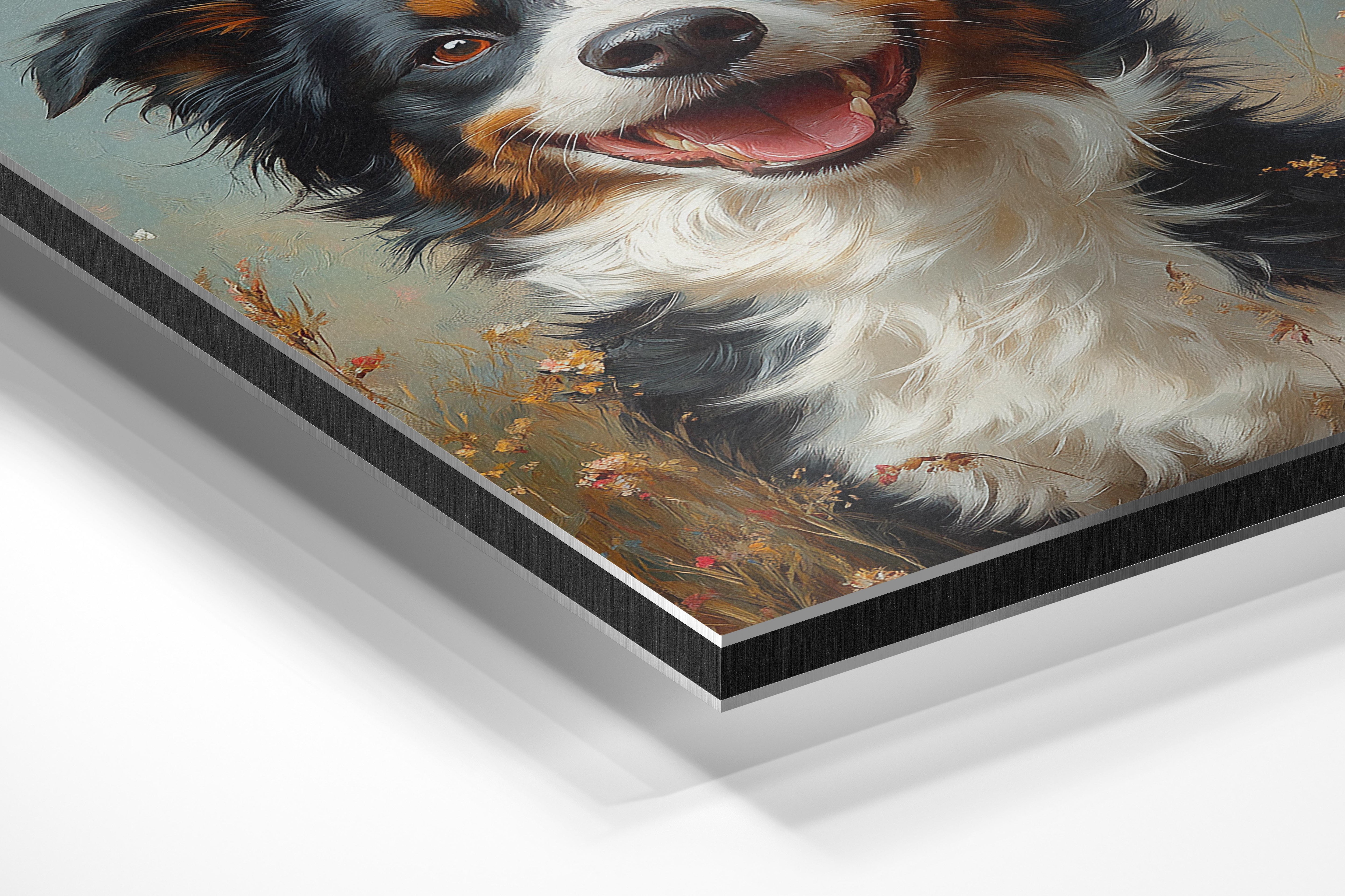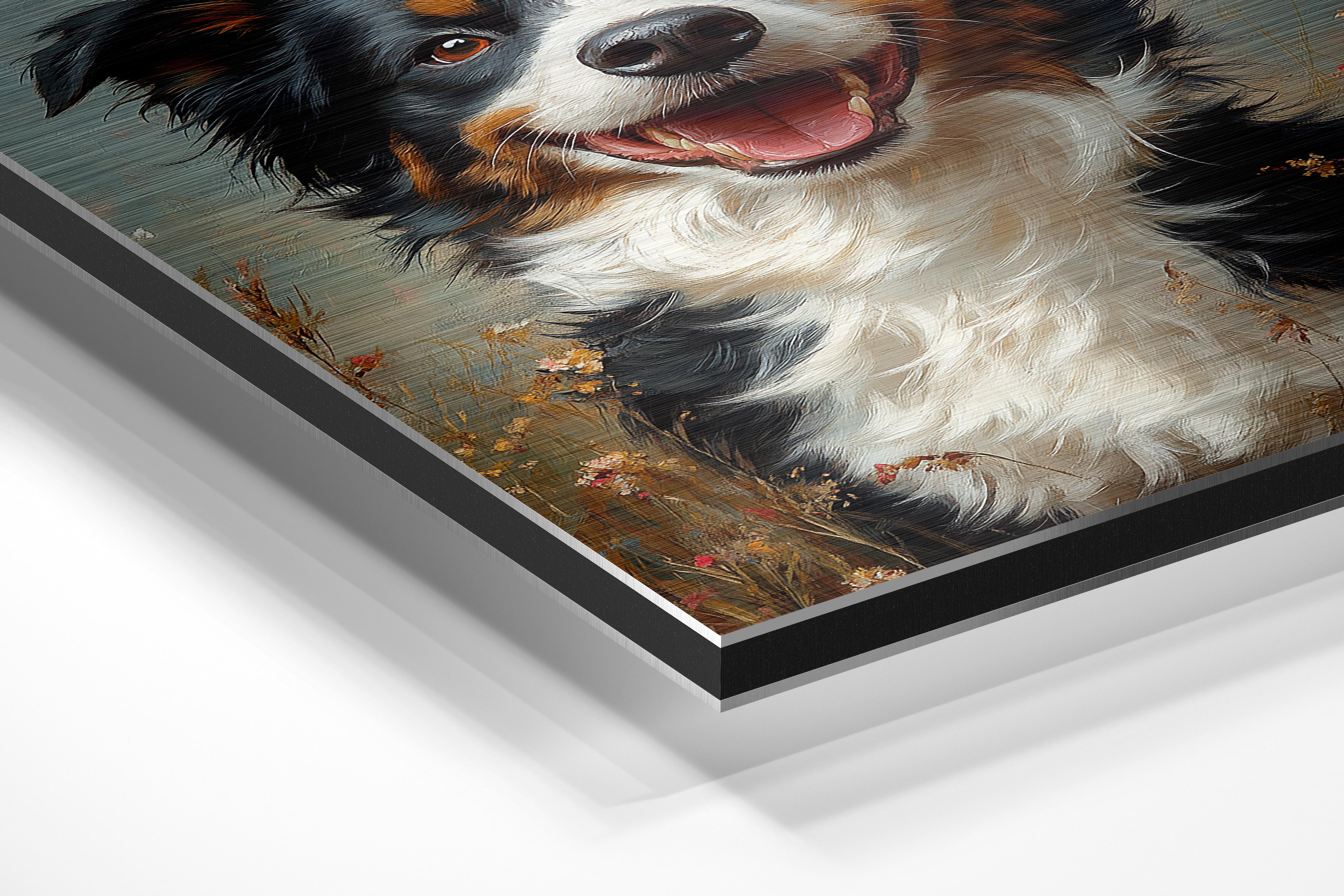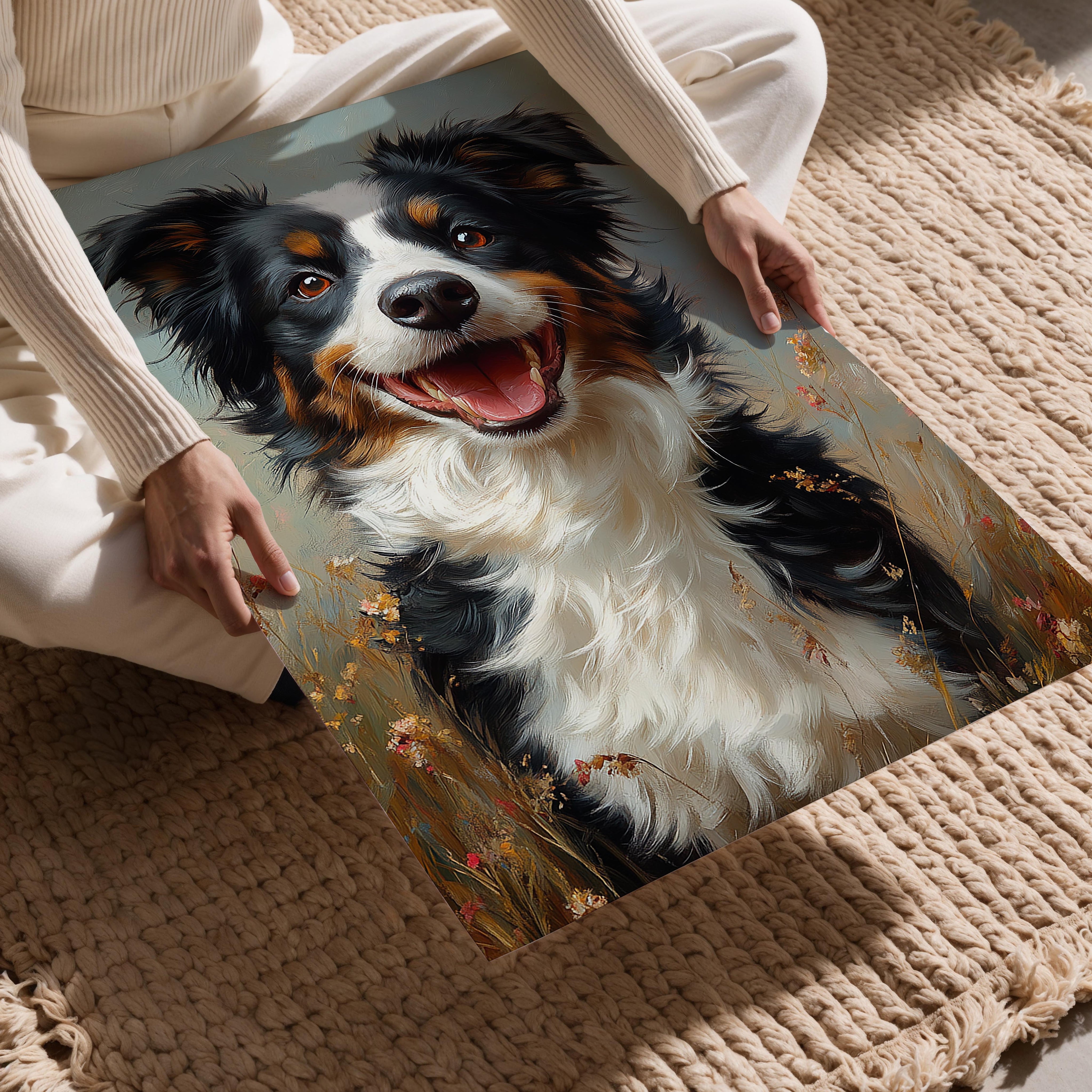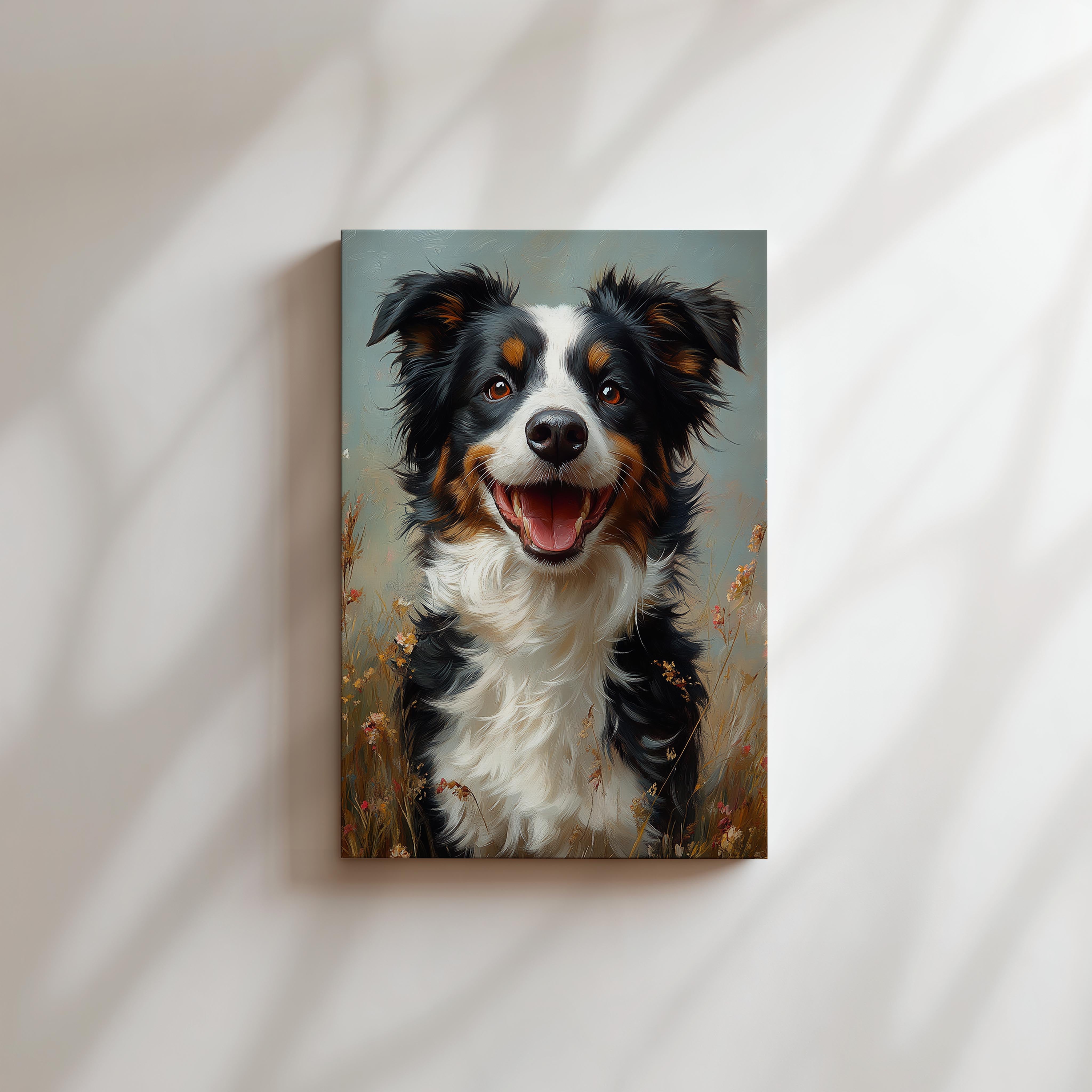 This heartwarming portrait features a joyful dog standing in a sunlit field of wildflowers, its bright eyes and open mouth radiating happiness. The soft pastel tones and impressionistic brushwork give the piece an inviting, almost dreamy quality. The detailed fur and expressive features make the dog feel lifelike and full of personality. Ideal for dog lovers, this artwork adds warmth and liveliness to a home or workspace, reminding viewers of the unconditional joy and companionship that dogs bring. A perfect addition to cozy and cheerful interiors.