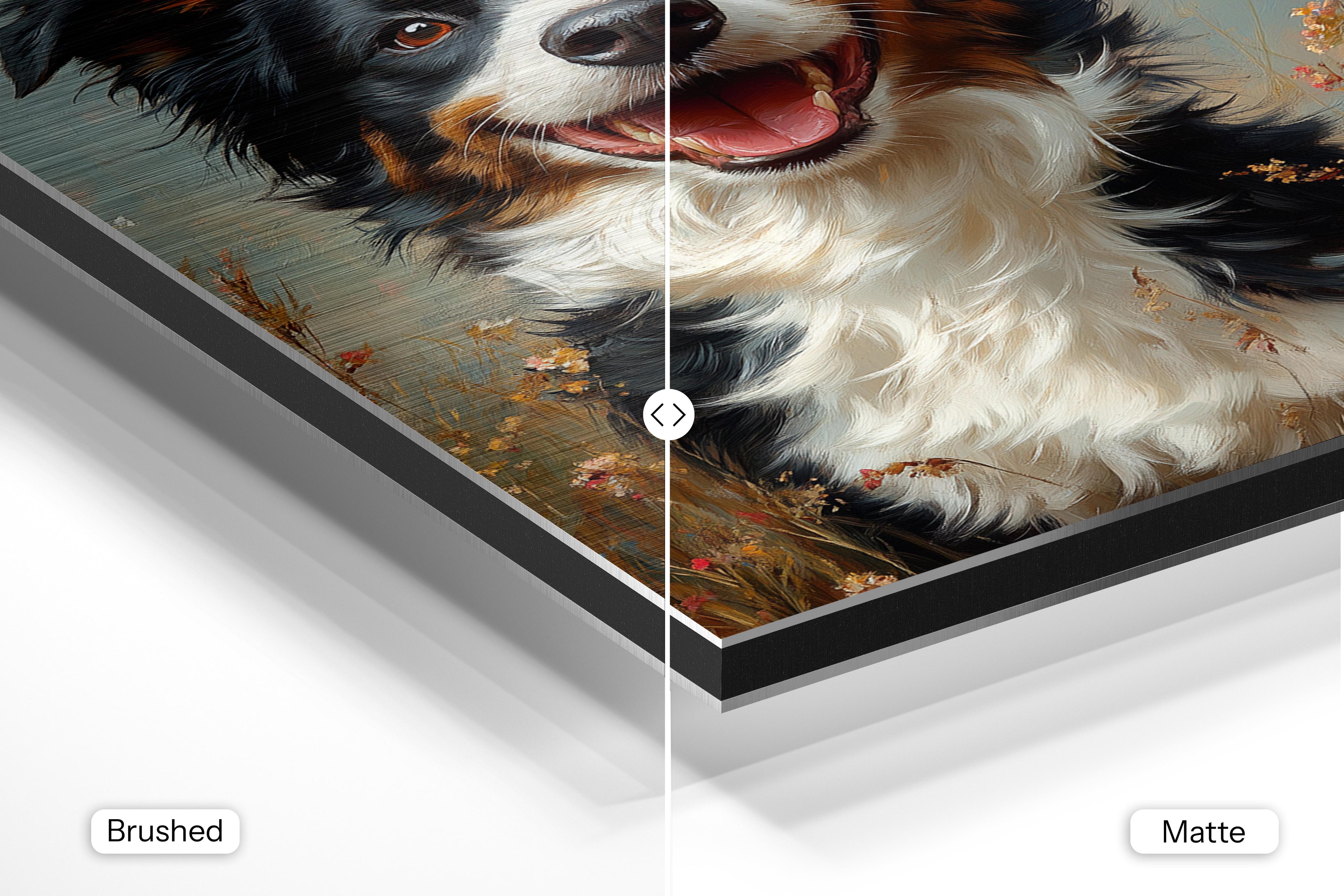 - Brushed Aluminum, on the other hand, features a raw metallic texture with visible brush strokes. Whites and highlights in your image let the silver surface show through, adding a dramatic, shimmering effect. Ideal for black-and-white images, minimalist designs, or abstract art, it creates a bold, industrial vibe with a modern edge.