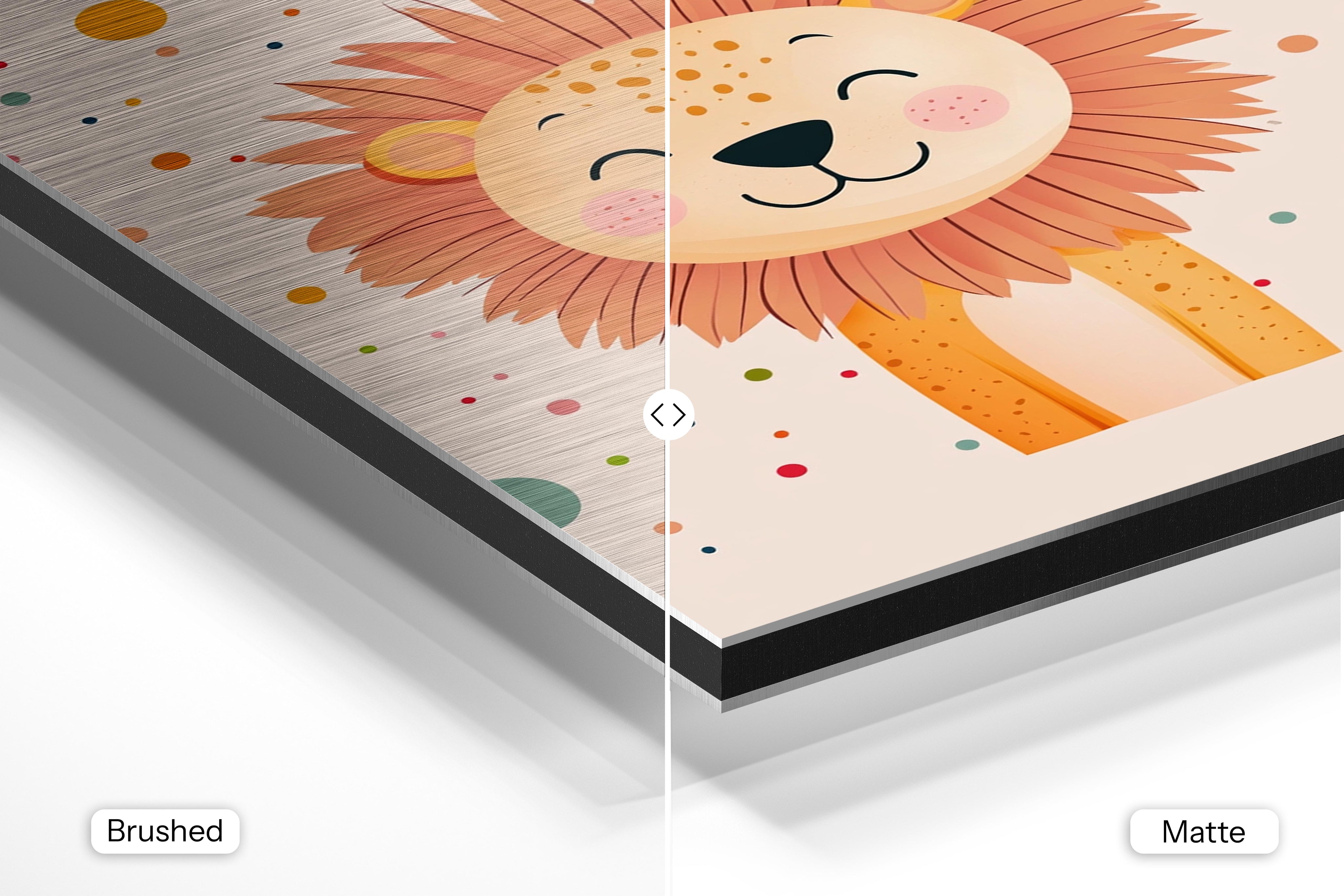 - Brushed Aluminum, on the other hand, features a raw metallic texture with visible brush strokes. Whites and highlights in your image let the silver surface show through, adding a dramatic, shimmering effect. Ideal for black-and-white images, minimalist designs, or abstract art, it creates a bold, industrial vibe with a modern edge.