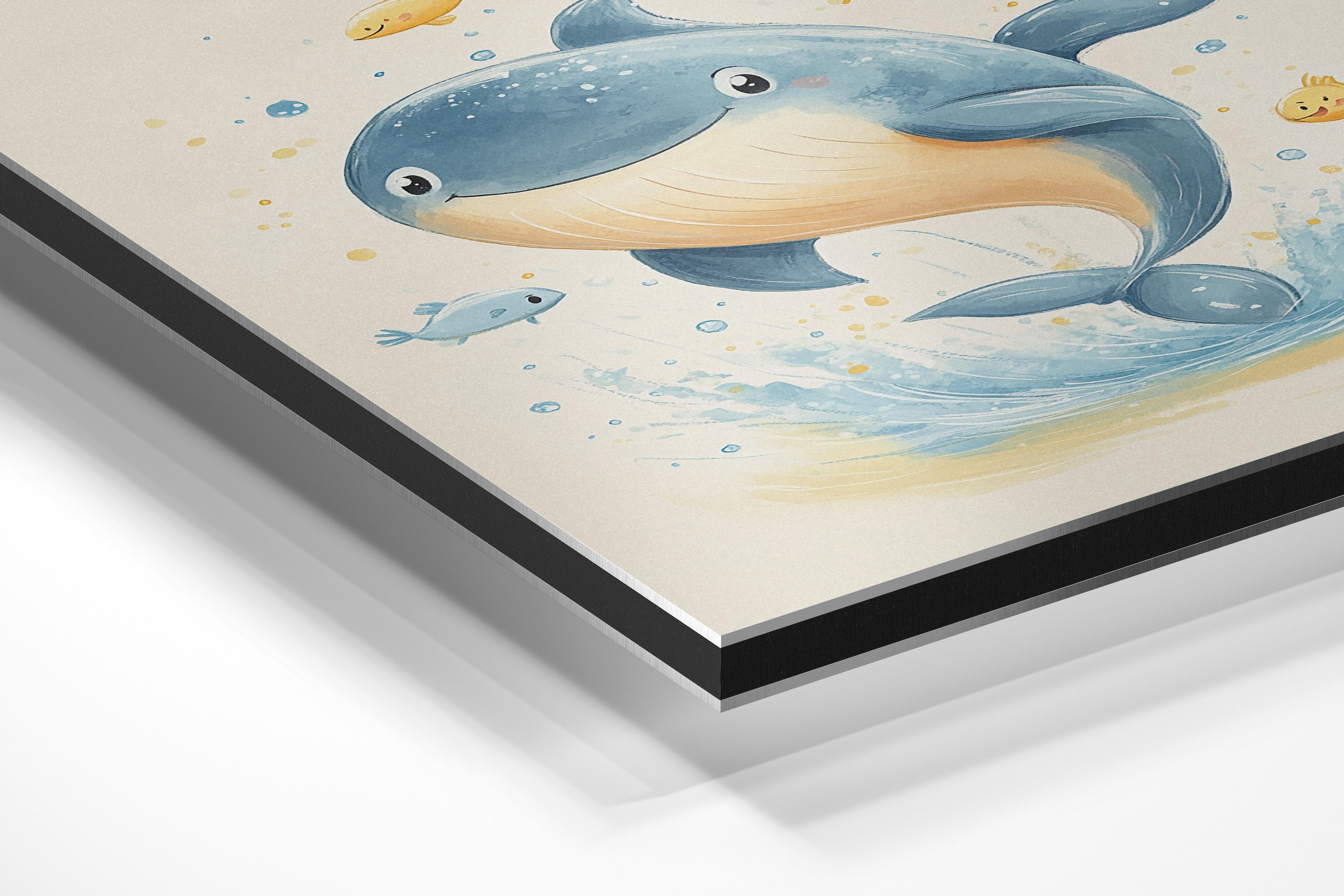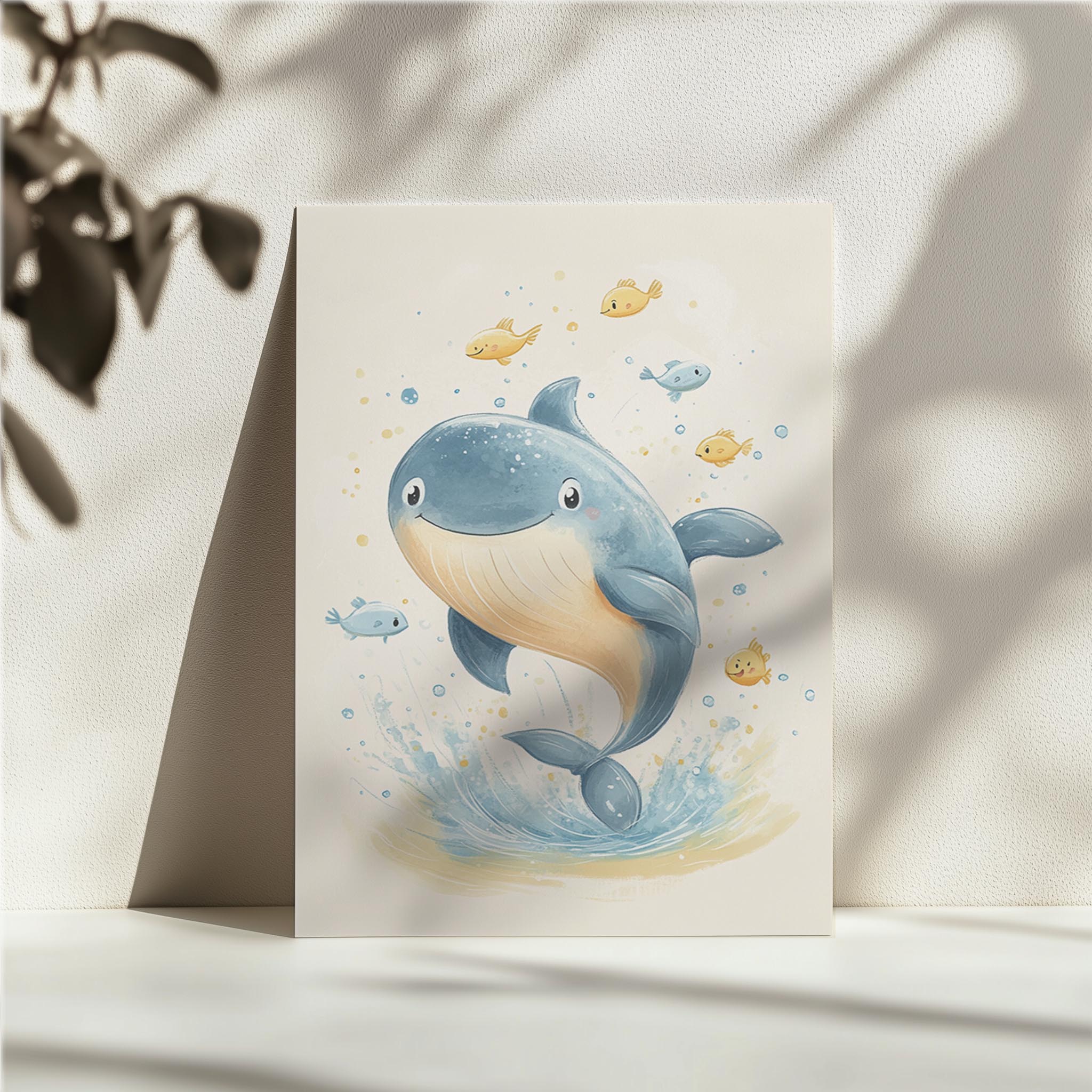 A cheerful illustration of a large, smiling whale leaping out of the water, surrounded by smaller fish. The playful water splashes and sunny atmosphere radiate joy and energy. Perfect for children’s spaces, this artwork captures the wonder of marine life in a lighthearted, engaging way. The soft pastel colors and friendly characters create an inviting and uplifting vibe, making it a favorite for aquatic-themed rooms or storytelling corners.