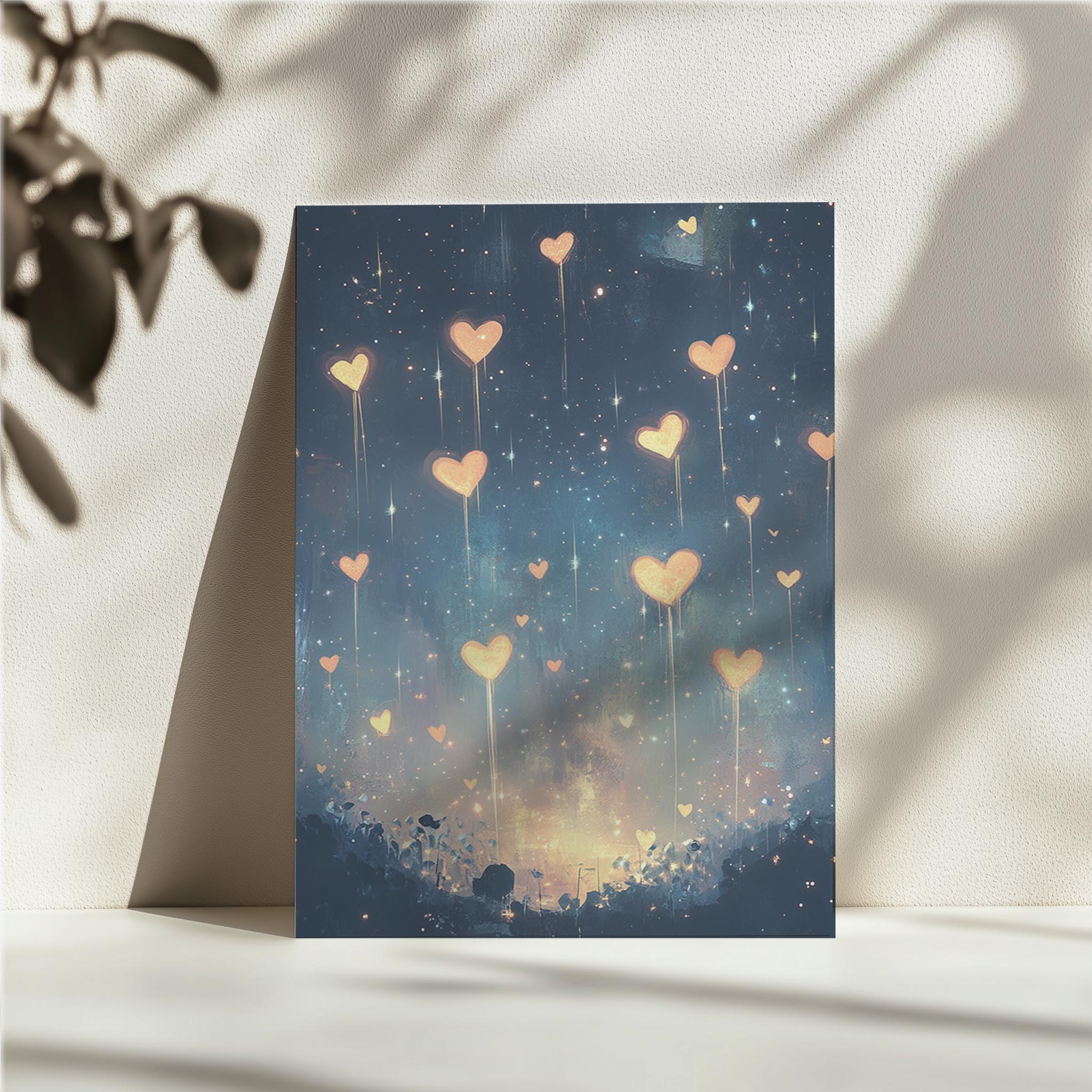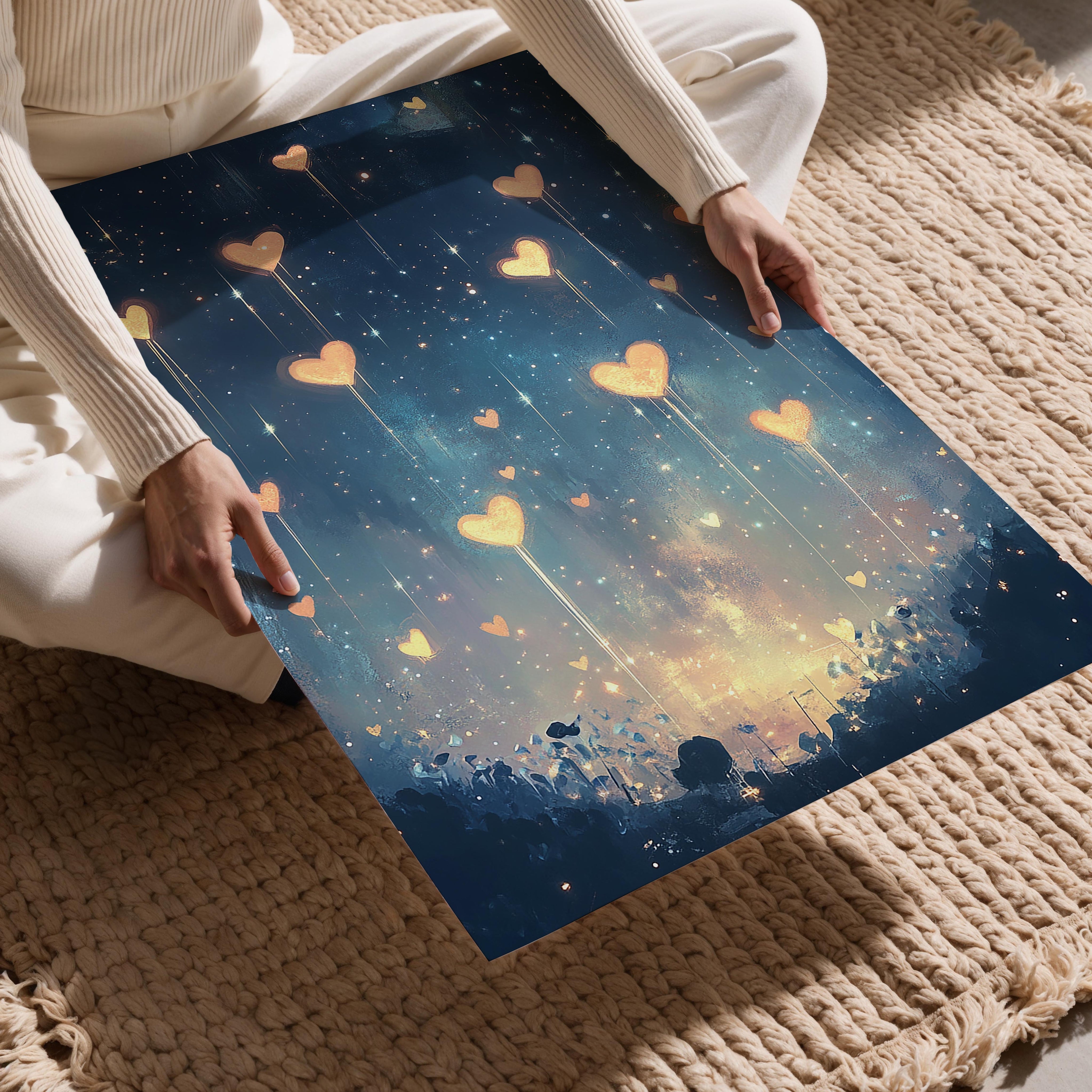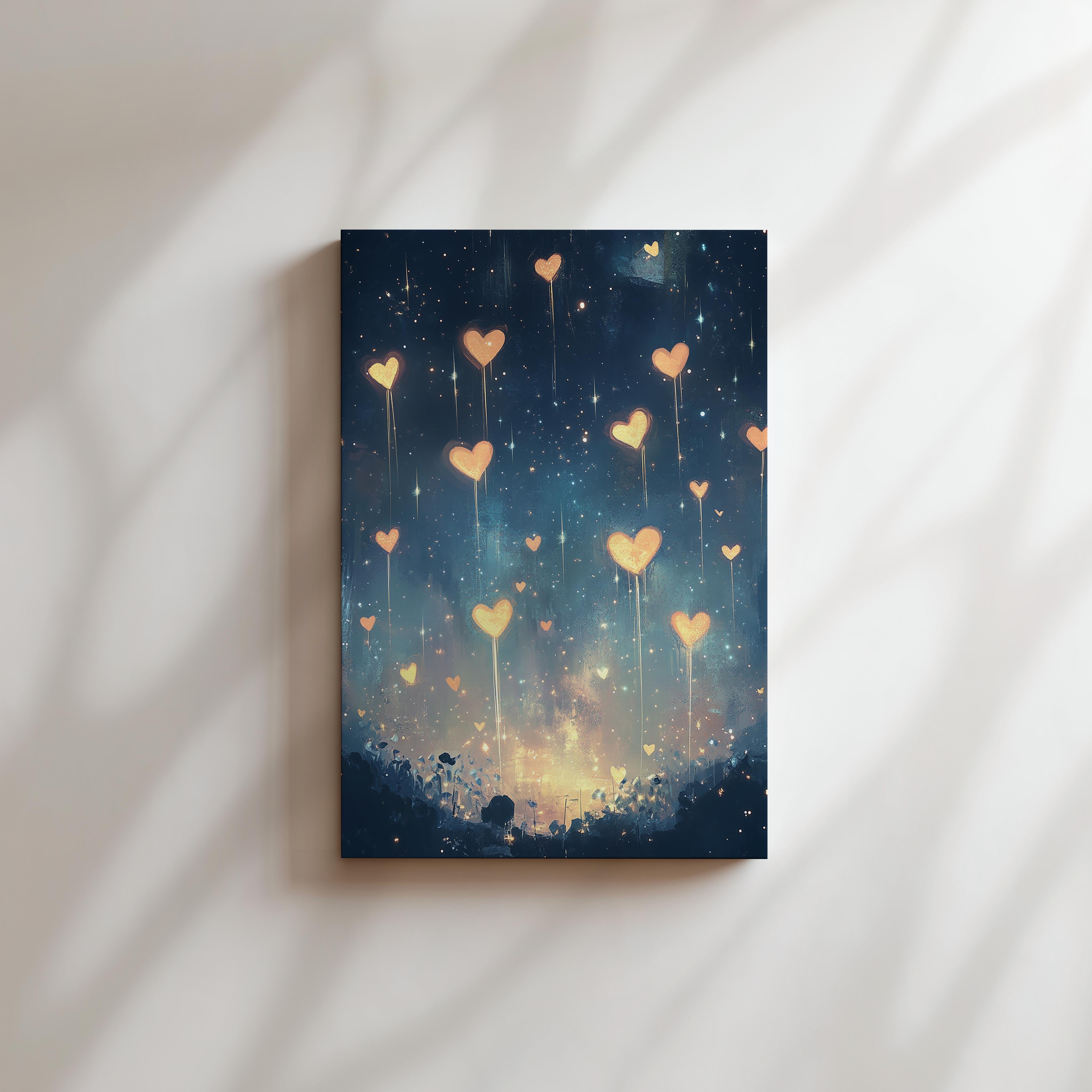 A dreamy night sky filled with glowing heart-shaped balloons floats above a whimsical landscape. The balloons seem to rise towards the stars, creating an ethereal and romantic atmosphere. The blending of soft blues and warm golden lights gives the image a sense of tranquility and wonder. This artwork is ideal for settings that inspire love and imagination, such as a bedroom or a romantic-themed space. Its captivating details and enchanting theme make it a conversation starter while also adding a soothing charm to the environment.